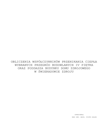 OBLICZENIA WSPÓŁCZYNNIKÓW PRZENIKANIA CIEPŁA WYBRANYCH PRZEGRÓD BUDOWLANYCH IV PIĘTRA ORAZ PODDASZA BUDYNKU DOMU ZDROJOWEGO W ŚWIERADOWIE ZDROJU OPRACOWAŁ: MGR INŻ. ARCH. PIOTR GOŁUB SPIS TREŚCI OPRACOWANIA : 1. Skośna połać dachowa poddasza - przekrój P1 1.1 Schemat skośnej połaci poddasza - przekrój P1 1.2 Obliczenie całkowitego oporu cieplnego RT dla dachu 1.3 Obliczenie współczynnika przenikania ciepła U 1.4 Obliczenie projektowanego współczynnika przenikania ciepła Uc 2. Ściana zewnętrzna lukarny IV piętra - przekrój P3 2.1 Schemat ściany zewnętrznej - przekrój P3 2.2 Obliczenie całkowitego oporu cieplnego RT dla ściany zewnętrznej 2.3 Obliczenie współczynnika przenikania ciepła U 2.4 Obliczenia projektowanego współczynnika przenikania ciepła Uc 3. Strop P7 - stan stniejący 3.1 Schemat stropu - przekrój P7 3.2 Obliczenie całkowitego oporu cieplnego RT dla stropu istniejącego 3.3 Obliczenie współczynnika przenikania ciepła U 3.4 Obliczenie poprawionego współczynnika przenikania ciepła Uc 4. Strop P8 - stan projektowany dla analizy porównawczej z rozwiązaniem docieplenia połaci dachu w skosie 4.1 Schemat stropu projektowanego - przekrój P8 4.2 Obliczenie całkowitego oporu cieplnego RT dla stropu projektowanego 4.3 Obliczenie współczynnika przenikania ciepła U 4.4 Obliczenie poprawionego współczynnika przenikania ciepła Uc 1. Skośna połać dachowa poddasza - przekrój P1 1.1 Schemat skośnej połaci poddasza - przekrój P1 1.2 Obliczenie całkowitego oporu cieplnego RT dla dachu DACH NR. WARSTWA di īi Ri=d1/ īi [m] [W/ mK] [m2K/ W] Środowisko wewnętrzne ogrzewane - Opór przejmowania ciepła od strony wewnętrznej - Rsi - - 0,130 1 Istniejące pokrycie dachu blacha - R1 - - 0 2 Istniejąca papa bitumiczna - R2 - - 0 3 Istniejące deskowanie + impregnacja - R3 - - 0 4 Istniejące kontrłaty +impregnacja + wentylowanie - R4 - - 0 5 Istniejące łaty 50x40 + impregnacja + pasy pianki PIR - R5 0,040 0,024 1,667 6 Folia wiatrowa - R6 - - 0 7 Wentylowana szczelina nad wełną - R7 0,020 - 0 8 Wełna mineralna połaciowa, miękka - R8 0,120 0,033 3,636 9 Folia PCV - R9 - - 0 10 Łaty 40x50 mocowane do krokwi co 50 cm + styropian jako wypełnienie pomiędzy łątami R10 0,050 0,031 1,613 11 Gęste sznurowanie mocowane do łaty - R11 - - 0 - Opór przejmowania ciepła od strony zewnętrznej - Rse - - 0,040 Środowisko zewnętrzne ∑RT=Rsi+R1+R2+R3+R4+R5+R6+R7+R8+R9+R10+R11+Rse 7,086 1.3 Obliczenie współczynnika przenikania ciepła U U=1/RT=1/7,086=0,14 W/(m2K)<0,18 W/(m2K) 1.4 Obliczenie projektowanego współczynnika przenikania ciepła Uc UC=U+∆U Obliczenie członu korekcyjnego ∆U: ∆U=∆Ug+∆Uf+∆Ur , gdzie: ∆Ug - poprawka ze względu na pustki powietrzne (zakładamy brak pustek powietrznych tzn, nieszczelności), więc jest równa 0 dlatego, że warstwa izolacji wykonana jest w sposób ciągły i łaczny ∆Uf - poprawka ze względu na łączniki mechaniczne (zakładamy brak łączników mechanicznych), więc jest równa 0 ∆Ur - poprawka ze względu na dach o odwróconym układzie warstw (nie dotyczy), wiec jest równa 0 2. Ściana zewnętrzna lukarny IV piętra - przekrój P3 2.1 Schemat ściany zewnętrznej - przekrój P3 2.2 Obliczenie całkowitego oporu cieplnego RT dla ściany zewnętrznej ŚCIANA ZEWNĘTRZNA NR. WARSTWA di īi Ri=d1/īi [m] [W/ mK] [m2K/W] - - 0,130 Środowisko wewnętrzne ogrzewane - Opór przejmowania ciepła od strony wewnętrznej - Rsi 1 Istniejąca ściana zewnętrzna z cegły pełnej + impregnowany tynk - R1 0,250 0,770 0,325 2 Styropian elewacyjny kotwiony do elewacji - R2 0,120 0,031 3,871 3 Siatka + klej elewacyjny - R3 0,005 1,000 0,005 4 Tynk elewacyjny na siatce - R4 0,005 1,000 0,005 - Opór przejmowania ciepła od strony zewnętrznej - Rse - - 0,040 Środowisko zewnętrzne ∑RT=Rsi+R1+R2+R3+R4+Rse 4,376 2.3 Obliczenie współczynnika przenikania ciepła U U=1/RT=1/4,376=0,228 W/(m2K)<0,23 W/(m2K) 2.4 Obliczenie poprawionego współczynnika przenikania ciepła Uc UC=U+∆U Obliczenie członu korekcyjnego ∆U: ∆U=∆Ug+∆Uf+∆Ur , gdzie: ∆Ug - poprawka ze względu na pustki powietrzne (zakładamy brak pustek powietrznych tzn, nieszczelności), więc jest równa 0 dlatego, że warstwa izolacji wykonana jest w sposób ciągły i łaczny ∆Uf - poprawka ze względu na łączniki mechaniczne (zakładamy brak łączników mechanicznych), więc jest równa 0 ∆Ur - poprawka ze względu na dach o odwróconym układzie warstw (nie dotyczy), wiec jest równa 0 3. Strop P7 - stan istniejący 3.1 Schemat stropu istniejącego - przekrój P7 3.2 Obliczenie całkowitego oporu cieplnego RT dla stropu istniejącego w dwóch wariantach warstw: STROP NR. WARSTWA di īi Ri=d1/ īi [m] [W/ mK] [m2K/ W] - - 0,100 Środowisko wewnętrzne ogrzewane - Opór przejmowania ciepła od strony wewnętrznej - Rsi 1 Warstwa wyrównawcza - R1 0,050 1,700 0,029 2 Papa - R2 0,005 0,18 0,028 3 Izolacja z wełny mineralnej - R3 0,060 0,05 1,200 4 Papa 0,005 0,18 0,028 5 Istniejący strop WPS- R5 0,030 1,700 0,018 6 Tynk cementowo-wapienny — R6 0,015 0,820 0,018 - Opór przejmowania ciepła od strony zewnętrznej - Rse - - 0,040 - R4 Środowisko zewnętrzne ∑RT=Rsi+R1+R2+R3+R4+R5+R6+Rsi 1,461 STROP WARSTWA NR. di īi Ri=d1/ īi [m] [W/ mK] [m2K/ W] - - 0,100 Środowisko wewnętrzne ogrzewane - Opór przejmowania ciepła od strony wewnętrznej - Rsi 1 Warstwa wyrównawcza - R1 0,100 1,700 0,059 2 Papa - R2 0,005 0,18 0,028 3 Izolacja z wełny mineralnej - R3 0,100 0,05 2,000 4 Papa 0,005 0,18 0,028 5 Istniejący strop WPS- R5 0,030 1,700 0,018 6 Tynk cementowo-wapienny — R6 0,015 0,820 0,018 - Opór przejmowania ciepła od strony zewnętrznej - Rse - - 0,040 - R4 Środowisko zewnętrzne ∑RT=Rsi+R1+R2+R3+R4+R5+R6+Rsi 2,290 3.3 Obliczenie współczynnika przenikania ciepła U U=1/RT=1/1,461=0,684 W/(m2K) U=1/RT=1/2,290=0,344 W/(m2K) 3.4 Obliczenie poprawionego współczynnika przenikania ciepła U
