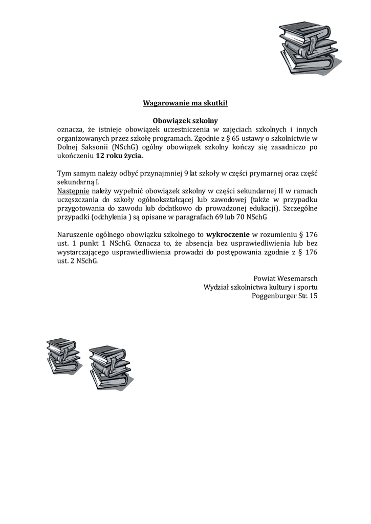 Wagarowanie ma skutki! Obowiązek szkolny oznacza, że istnieje obowiązek uczestniczenia w zajęciach szkolnych i innych organizowanych przez szkołę programach. Zgodnie z § 65 ustawy o szkolnictwie w Dolnej Saksonii (NSchG) ogólny obowiązek szkolny kończy się zasadniczo po ukończeniu 12 roku życia. Tym samym należy odbyć przynajmniej 9 lat szkoły w części prymarnej oraz część sekundarną I. Następnie należy wypełnić obowiązek szkolny w części sekundarnej II w ramach uczęszczania do szkoły ogólnokształcącej lub zawodowej (także w przypadku przygotowania do zawodu lub dodatkowo do prowadzonej edukacji). Szczególne przypadki (odchylenia ) są opisane w paragrafach 69 lub 70 NSchG Naruszenie ogólnego obowiązku szkolnego to wykroczenie w rozumieniu § 176 ust. 1 punkt 1 NSchG. Oznacza to, że absencja bez usprawiedliwienia lub bez wystarczającego usprawiedliwienia prowadzi do postępowania zgodnie z § 176 ust. 2 NSchG. Powiat Wesemarsch Wydział szkolnictwa kultury i sportu Poggenburger Str. 15