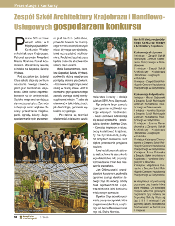 Prezentacje i konkursy Zespół Szkół Architektury Krajobrazu i HandlowoUsługowych gospodarzem konkursu P rawie 500 uczniów wzięło udział w II Międzywojewódzkim Konkursie Wiedzy o Architekturze Krajobrazu. Patronat sprawuje Prezydent Miasta Gdańska Paweł Adamowicz. Uczestniczy walczą o indeks na Sopocką Szkołę Wyższą. Pod zarządem dyr. Jadwigi Chys szkoła staje się centrum nauczania nowego zawodu, jakim jest architektura krajobrazu. Stale rośnie zapotrzebowanie na ich umiejętności. Szybko rozprzestrzeniająca się moda przybyła z Zachodu i obejmuje coraz większe obszary: przestrzenie miejskie, parki, ogrody, ściany. Zagospodarowanie tych przestrze- To my zwyciężyliśmy w tym konkursie Dzięki nam jest tak pięknie 18 3/2010 ni jest bardzo potrzebne, prowadzi bowiem do znaczącego wzrostu estetyki naszych miast. Wymaga sporej wiedzy, toteż można zdobyć tytuł inżyniera. Popłatnej i godnej pracy będzie dużo dla absolwentów szkoły oraz uczelni. Maria Bassandowska, kanclerz Sopockiej Szkoły Wyższej, podkreśla dobrą współpracę pomiędzy obiema placówkami. – Uczniowie mogą kontynuować naukę w naszej szkole. Jest to niezbędne, gdyż uprawianie tego zawodu wymaga dużej interdyscyplinarnej wiedzy. Trzeba się orientować w takich dziedzinach, jak dendrologia, geometria wykreślna czy geologia. - Potrzebne są również wiadomości z dziedziny sztuki: Wyniki II Międzywojewódzkiego Konkursu Wiedzy z Architektury Krajobrazu Konkurencja drużynowa I miejsce - Zespół Szkół Rolniczych Centrum Kształcenia Praktycznego w Bolesławowie II miejsce - Zespół Szkół Architektury Krajobrazu i Handlowo-Usługowych w Gdańsku III miejsce - Zespół Szkół Rolniczych Centrum Kształcenia Praktycznego w Białymstoku Mam indeks. Będę studiować. malarstwa i rzeźby – dodaje dziekan SSW Anna Szymczak. Uprawianie tego zawodu daje ogromne możliwości rozwoju własnych możliwości. – Nasi uczniowie odznaczają się pasją i wyobraźnią – powiedziała dyrektor Jadwiga Chys. – Czerpiąc inspiracje z natury, będą kształtować krajobraz, by nie był kamienną pustynią brzydkich blokowisk, lecz piękną przestrzenią przyjazna ludziom. Ideą kształtowania krajobrazu jest zachowanie szacunku do jego dziedzictwa i do przyrody: wprowadzanie zmian bez niszczenia przeszłości. Jan Główczewski, przedstawiciel kuratorium, podkreśla ogromne zasługi dyrektor Jadwigi Chys dla rozwoju szkoły oraz wprowadzenia i upowszechnienia idei konkursu w tak nowym zawodzie. Dyrektor Chys jednakże podkreśla pracę nauczycielek, które zorganizowały konkurs, a są to: mgr inż. Iwona Renkiewicz oraz mgr inż. Elwira Niemiec. Konkurencja indywidualna I miejsce - Michał Gajkowski z Zespołu Szkół Rolniczych Centrum Kształcenia Praktycznego w Bolesławowie II miejsce - Karolina Szostak z Zespołu Szkół Rolniczych Centrum Kształcenia Praktycznego w Białymstoku III miejsce - Joanna Renachowska z Zespołu Szkół Architektury Krajobrazu i Handlowo-Usługowych w Gdańsku III miejsce Katarzyna Chomutowska z Zespołu Szkół Rolniczych Centrum Kształcenia Praktycznego w Białymstoku V miejsce: Anna Orłowska z Zespołu Szkół Architektury Krajobrazu i Handlowo-Usługowych w Gdańsku V miejsce: Magdalena Ciereszko z Zespołu Szkół Rolniczych Centrum Kształcenia Praktycznego w Białymstoku W klasyfikacji indywidualnej przyznano dwa trzecie i dwa piąte miejsca. Do trzeciego miejsca włącznie głównymi nagrodami były indeksy do Sopockiej Szkoły Wyższej (za I, II i III miejsce) i do Wyższej Szkoły Zarządzania Środowiskiem w Tucholi (za II miejsce)