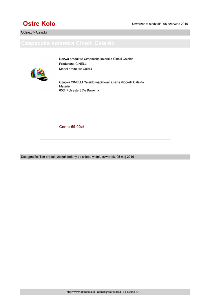 Ostre Koło Utworzono: niedziela, 05 czerwiec 2016 Odzież > Czapki Czapeczka kolarska Cinelli Caleido Nazwa produktu: Czapeczka kolarska Cinelli Caleido Producent: CINELLI Model produktu: C0014 Czapka CINELLI Caleido inspirowaną serią Vigorelli Caleido Materiał 65% Polyester35% Bawełna Cena: 69.00zł Dostępność: Ten produkt został dodany do sklepu w dniu czwartek, 05 maj 2016 http://www.ostrekolo.pl | [email protected] | | Strona 1/1