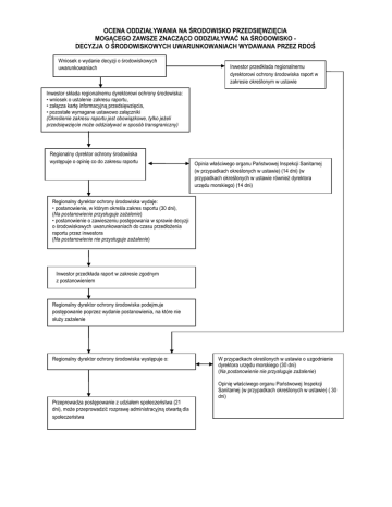 OCENA ODDZIAŁYWANIA NA ŚRODOWISKO PRZEDSIĘWZIĘCIA MOGĄCEGO ZAWSZE ZNACZĄCO ODDZIAŁYWAĆ NA ŚRODOWISKO DECYZJA O ŚRODOWISKOWYCH UWARUNKOWANIACH WYDAWANA PRZEZ RDOŚ Wniosek o wydanie decyzji o środowiskowych uwarunkowaniach Inwestor przedkłada regionalnemu dyrektorowi ochrony środowiska raport w zakresie określonym w ustawie Inwestor składa regionalnemu dyrektorowi ochrony środowiska: • wniosek o ustalenie zakresu raportu, • załącza kartę informacyjną przedsięwzięcia, • pozostałe wymagane ustawowo załączniki (Określenie zakresu raportu jest obowiązkowe, tylko jeżeli przedsięwzięcie może oddziaływać w sposób transgraniczny) Regionalny dyrektor ochrony środowiska występuje o opinię co do zakresu raportu Opinia właściwego organu Państwowej Inspekcji Sanitarnej (w przypadkach określonych w ustawie) (14 dni) (w przypadkach określonych w ustawie również dyrektora urzędu morskiego) (14 dni) Regionalny dyrektor ochrony środowiska wydaje: • postanowienie, w którym określa zakres raportu (30 dni), (Na postanowienie przysługuje zażalenie) • postanowienie o zawieszeniu postępowania w sprawie decyzji o środowiskowych uwarunkowaniach do czasu przedłożenia raportu przez inwestora (Na postanowienie nie przysługuje zażalenie) Inwestor przedkłada raport w zakresie zgodnym z postanowieniem Regionalny dyrektor ochrony środowiska podejmuje postępowanie poprzez wydanie postanowienia, na które nie służy zażalenie Regionalny dyrektor ochrony środowiska występuje o: Przeprowadza postępowanie z udziałem społeczeństwa (21 dni), może przeprowadzić rozprawę administracyjną otwartą dla społeczeństwa W przypadkach określonych w ustawie o uzgodnienie dyrektora urzędu morskiego (30 dni) (Na postanowienie nie przysługuje zażalenie) Opinię właściwego organu Państwowej Inspekcji Sanitarnej (w przypadkach określonych w ustawie) ( 30 dni) Regionalny dyrektor ochrony środowiska analizuje zgromadzony materiał dowodowy i wydaje decyzję o środowiskowych uwarunkowaniach, w której przedstawia m.in. stanowisko na temat konieczności przeprowadzenia ponownej oceny oddziaływania na środowisko (Od decyzji przysługuje odwołanie) Regionalny dyrektor ochrony środowiska podaje do publicznej wiadomości informację o wydaniu decyzji i o możliwościach zapoznania się z jej treścią oraz z dokumentacją sprawy