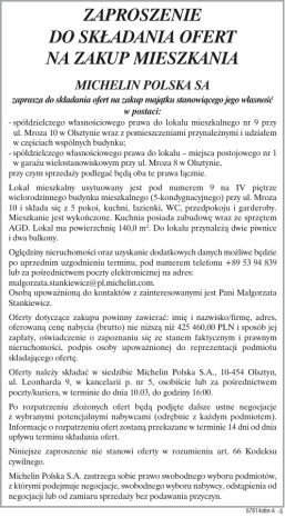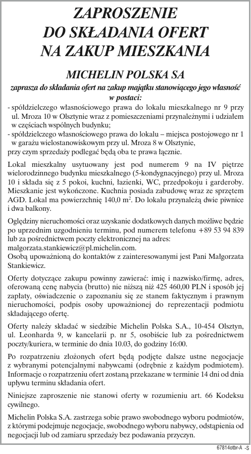 ZAPROSZENIE DO SKŁADANIA OFERT NA ZAKUP MIESZKANIA MICHELIN POLSKA SA zaprasza do składania ofert na zakup majątku stanowiącego jego własność w postaci: - spółdzielczego własnościowego prawa do lokalu mieszkalnego nr 9 przy ul. Mroza 10 w Olsztynie wraz z pomieszczeniami przynależnymi i udziałem w częściach wspólnych budynku; - spółdzielczego własnościowego prawa do lokalu – miejsca postojowego nr 1 w garażu wielostanowiskowym przy ul. Mroza 8 w Olsztynie, przy czym sprzedaży podlegać będą oba te prawa łącznie. Lokal mieszkalny usytuowany jest pod numerem 9 na IV piętrze wielorodzinnego budynku mieszkalnego (5-kondygnacyjnego) przy ul. Mroza 10 i składa się z 5 pokoi, kuchni, łazienki, WC, przedpokoju i garderoby. Mieszkanie jest wykończone. Kuchnia posiada zabudowę wraz ze sprzętem AGD. Lokal ma powierzchnię 140,0 m2. Do lokalu przynależą dwie piwnice i dwa balkony. Oględziny nieruchomości oraz uzyskanie dodatkowych danych możliwe będzie po uprzednim uzgodnieniu terminu, pod numerem telefonu +89 53 94 839 lub za pośrednictwem poczty elektronicznej na adres: [email protected]. Osobą upoważnioną do kontaktów z zainteresowanymi jest Pani Małgorzata Stankiewicz. Oferty dotyczące zakupu powinny zawierać: imię i nazwisko/firmę, adres, oferowaną cenę nabycia (brutto) nie niższą niż 425 460,00 PLN i sposób jej zapłaty, oświadczenie o zapoznaniu się ze stanem faktycznym i prawnym nieruchomości, podpis osoby upoważnionej do reprezentacji podmiotu składającego ofertę. Oferty należy składać w siedzibie Michelin Polska S.A., 10-454 Olsztyn, ul. Leonharda 9, w kancelarii p. nr 5, osobiście lub za pośrednictwem poczty/kuriera, w terminie do dnia 10.03, do godziny 16:00. Po rozpatrzeniu złożonych ofert będą podjęte dalsze ustne negocjacje z wybranymi potencjalnymi nabywcami (odrębnie z każdym podmiotem). Informacje o rozpatrzeniu ofert zostaną przekazane w terminie 14 dni od dnia upływu terminu składania ofert. Niniejsze zaproszenie nie stanowi oferty w rozumieniu art. 66 Kodeksu cywilnego. Michelin Polska S.A. zastrzega sobie prawo swobodnego wyboru podmiotów, z którymi podejmuje negocjacje, swobodnego wyboru nabywcy, odstąpienia od negocjacji lub od zamiaru sprzedaży bez podawania przyczyn. 67814otbr-A -S