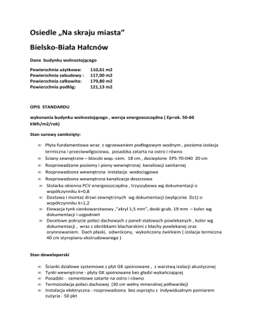 Osiedle „Na skraju miasta” Bielsko-Biała Hałcnów Dane budynku wolnostojącego Powierzchnia użytkowa: Powierzchnia zabudowy : Powierzchnia całkowita: Powierzchnia podłóg: 110,61 m2 117,00 m2 179,80 m2 121,13 m2 OPIS STANDARDU wykonania budynku wolnostojącego , wersja energooszczędna ( Ep=ok. 50-60 kWh/m2/rok) Stan surowy zamknięty: • • • • • • • • • Płyta fundamentowa wraz z ogrzewaniem podłogowym wodnym , pozioma izolacja termiczna i przeciwwilgociowa, posadzka zatarta na ostro i równo Ściany zewnętrzne – bloczki wap.-cem. 18 cm , docieplone EPS-70-040 20 cm Rozprowadzone poziomy i piony wewnętrznej kanalizacji sanitarnej Rozprowadzona wewnętrzna instalacja wodociągowa Rozprowadzona wewnętrzna kanalizacja deszczowa Stolarka okienna PCV energooszczędna , trzyszybowa wg dokumentacji o współczynniku k=0,8 Dostawa i montaż drzwi zewnętrznych wg dokumentacji (wyłącznie Dz1) o współczynniku k=1,2 Elewacja tynk cienkowarstwowy ,”akryl 1,5 mm”, deski grub. 19 mm – kolor wg dokumentacji i uzgodnień Docelowe pokrycie połaci dachowych z paneli stalowych powlekanych , kolor wg dokumentacji , wraz z obróbkami blacharskimi z blachy powlekanej oraz orynnowaniem. Dach płaski, odwrócony, wykończony żwirkiem ( izolacja termiczna 40 cm styropianu ekstrudowanego ) Stan deweloperski • • • • • Ścianki działowe systemowe z płyt GK spoinowane , z warstwą izolacji akustycznej Tynki wewnętrzne - płyty GK spoinowane bez gładzi wykańczającej Posadzki - cementowe zatarte na ostro i równo Termoizolacja połaci dachowej (30 cm wełny mineralnej półtwardej) Instalacja elektryczna - rozprowadzona bez osprzętu z indywidualnym pomiarem zużycia - 50 pkt • • • Pompa ciepła: powietrze - woda o mocy 8 kW – z osprzętem i regulacją elektroniczną wraz z pojemnikiem na CWU o poj. 140 l Centralne ogrzewanie - podłogowe w rurach „Uponor” z rozdzielaczem, 5 szt. termostatów, włączone do pompy ciepła Wentylacja mechaniczna z rekuperacją o wydajności do 500 m3/h Zagospodarowanie terenu ( dot. bud. w stanie deweloperskim) • • • • • • Wewnętrzna droga dojazdowa - utwardzona (sięgacz) Zbiornik na deszczówkę ( 2 m3) z instalacją przelewową i rozprowadzeniem po gruncie Bezodpływowy zbiornik na ścieki sanitarne ( 6 m3) Teren działki uporządkowany , ogrodzony z bramą i furtką (bez automatyki) , Przyłącze wody z sieci AQUA Przyłącze energii elektrycznej z sieci Tauron Koszt budynków Koszt budynku uzależniony jest od wielkości działki ( od 850 -1190 m2) i stanu w jakim wykonany będzie budynek i wynosi ok.: Stan surowy zamknięty od 390 000 do 430 000 zł brutto (3500 - 3870 zł/m2 pow. użytkowej brutto z działką) Stan deweloperski od 500 000 do 540 000 zł brutto ( 4504 – 4864 zł/m2 pow. użytkowej brutto z działką) Terminy realizacji • • • • Ok. 6 m-cy od momentu podpisania notarialnej umowy przedwstępnej Raty płatności wg harmonogramu będącego załącznikiem do umowy przedwstępnej, przy czym I rata płatna dopiero po wykonaniu przez FAB „Hammer-Bud” stanu surowego z dachem Płatności Inwestora będą dokonywane na bankowe, otwarte konto powiernicze Przeniesienie własności działki wraz z domem ( umowa notarialna) po zgłoszeniu zakończenia robót do PINB Dopuszczamy, po uzgodnieniu z kupującym, wykonanie budynku w wersji o współczynniku Ep = ok. 120 kWh/m2/rok, co obniży koszty jego wykonania o ok. 50 000 zł ( z piecem gazowym dwufunkcyjnym w miejsce pompy ciepła i wentylacji mechanicznej, grub. izolacji termicznej ścian 15 cm, dachu odwróconego 25 cm, dachu dwuspadowego 25 cm, stolarka okienna dwuszybowa). W każdej z wersji fundament wykonywany jest jako energooszczędny (płyta fundamentowa z ogrzewaniem podłogowym)