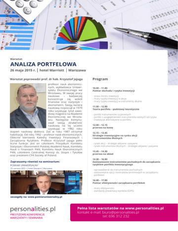 Warsztat ANALIZA PORTFELOWA 26 maja 2015 r. hotel Marriott Warszawa Warsztat poprowadzi prof. dr hab. Krzysztof Jajuga profesor nauk ekonomicznych, wykładowca Uniwersytetu Ekonomicznego we Wrocławiu. W swojej pracy naukowo – badawczej koncentruje się wokół finansów oraz statystyki i ekonometrii. Swoją karierę naukową rozpoczął w 1979 roku uzyskując tytuł zawodowy magistra na Akademii Ekonomicznej we Wrocławiu. Następnie kontynuował swoją działalność naukową na tej uczelni uzyskując w 1982 roku stopień naukowy doktora. Zaś w roku 1987 otrzymał habilitację. Od roku 1992 – profesor nauk ekonomicznych. Obecnie kierownik Katedry Inwestycji Finansowych i Zarządzania Ryzykiem. Profesor Krzysztof Jajuga pełni liczne funkcje. Jest on członkiem Prezydium Komitetu Statystyki i Ekonometrii Polskiej Akademii Nauk, Komitetu Nauk o Finansach PAN, Komitetu Nauk Ekonomicznych PAN, członkiem Centralnej Komisji ds. Stopni i Tytułów oraz prezesem CFA Society of Poland. Zapraszamy również na seminarium: POMIAR UNIWERSALNY 25 czerwca 2015 r. | hotel Sheraton | Warszawa Program 10.00 – 11.00 Pomiar dochodu i ryzyka inwestycji - stopa zwrotu inwestycji - miary ryzyka inwestycji w akcje - miary ryzyka inwestycji w instrumenty dłużne 11.00 – 12.00 Teoria portfela – podstawy teoretyczne - portfel instrumentów ryzykownych - portfel z uwzględnieniem instrumentów wolnych od ryzyka - inwestycje alternatywne w portfelu 12.00 – 12.15 przerwa na kawę 12.15 – 13.45 Strategie inwestycyjne na rynku akcji i instrumentów dłużnych - rynek akcji – strategie aktywne i pasywne - rynek instrumentów dłużnych – strategie aktywne i pasywne 13.45 – 14.30 przerwa na obiad 14.30 – 16.00 Zastosowanie instrumentów pochodnych do zarządzania ryzykiem portfela inwestycyjnego - wprowadzenie do instrumentów pochodnych - zastosowanie opcji i kontraktów terminowych w zarządzaniu portfelem 16.00 – 17.00 Pomiar efektywności zarządzania portfelem - miary efektywności - standardy prezentacji wyników (GIPS) szczegóły na: www.pomiaruniwersalny.pl PRESTIŻOWE KONFERENCJE WARSZATATY I SEMINARIA Pełna lista warsztatów na www.personalities.pl kontakt e-mail: [email protected] tel: 696 312 232 Zgłoszenie udziału w warsztacie: ANALIZA PORTFELOWA Organizator: PERSONALITIES, Pl. Powstańców Warszawy 2, 00 030 Warszawa, NIP: 113-065-20-26 26.05.2015 r., Hotel Marriott, Al. Jerozolimskie 65/79, Warszawa Dane do faktury: Nazwa firmy / instytucji Adres: NIP: Osoba koordynująca zgłoszenie: tel: e-mail: Dane uczestników: imię i nazwisko: imię i nazwisko: stanowisko: stanowisko: dział/ dept.: dział/ dept.: adres e-mail: adres e-mail: tel: tel: Wypełniony i podpisany formularz prosimy odesłac na adres: [email protected] Warunki udziału: Pierwszy zgłoszony uczestnik Kolejny zgłoszony uczestnik Uczestnik poprzednich warsztatów organizowanych przez firmę PERSONALITIES Zgłoszenie przed: 10.04.2015 (włącznie) Zgłoszenie po: 10.04.2015 1 300 zł + 23 % VAT 1 500 zł + 23 % VAT 10% zniżki 10% zniżki 10% zniżki 10% zniżki Pełna lista warsztatów Zniżki nie sumują się oraz zgłoszenia online dostępne na: personalities.pl Zapraszamy ! Powyższa cena zawiera udział jednej osoby w warsztacie zgodnie ze zgłoszeniem, materiały i catering. Warunkiem uczestnictwa jest odesłaniena adres [email protected] skanu wypełnionego i podpisanego formularza zgłoszeniowego oraz wpłata w terminie 7 dni od potwierdzenia przyjęcia zgłoszenia, lecz nie później niż na 3 dni robocze przed rozpoczęciem warsztatu. Ewentualną rezygnację z udziału należy przesłać na adres [email protected]. W przypadku rezygnacji później niż na 3 dni robocze przed rozpoczęciem warsztatu pobrana zostanie opłata w wysokości 100% opłaty za udział. Nieodwołanie zgłoszenia i niewzięcie udziału w warsztacie powoduje obciążenie pełnymi kosztami udziału. Niedokonanie wpłaty nie jest jednoznaczne z rezygnacją z udziału. Możliwe jest zastępstwo zgłoszonego uczestnika. Wpłat należy dokonywać na konto: 84 1300 0000 2016 9613 8000 0001 W tytule przelewu prosimy wpisać imię i nazwisko uczestnika. Przesłane zgłoszenie jest jednoznaczne z zawarciem wiążącej umowy pomiędzy zgłaszającym a firmą Personalities; oznacza akceptację warunków uczestnictwa i zgodę na przetwarzanie przez Organizatora danych osobowych zgłoszonych uczestników w celach promocji i marketingu. Wyrażający zgodę na przetwarzanie danych mają prawo kontroli i weryfikacji przetwarzania danych, które ich dotyczą oraz do odwołania udzielonej zgody. kod: www .............................................................................................................................................................................................................................. Imię, nazwisko, stanowisko i podpis osoby akceptującej zgłoszenie