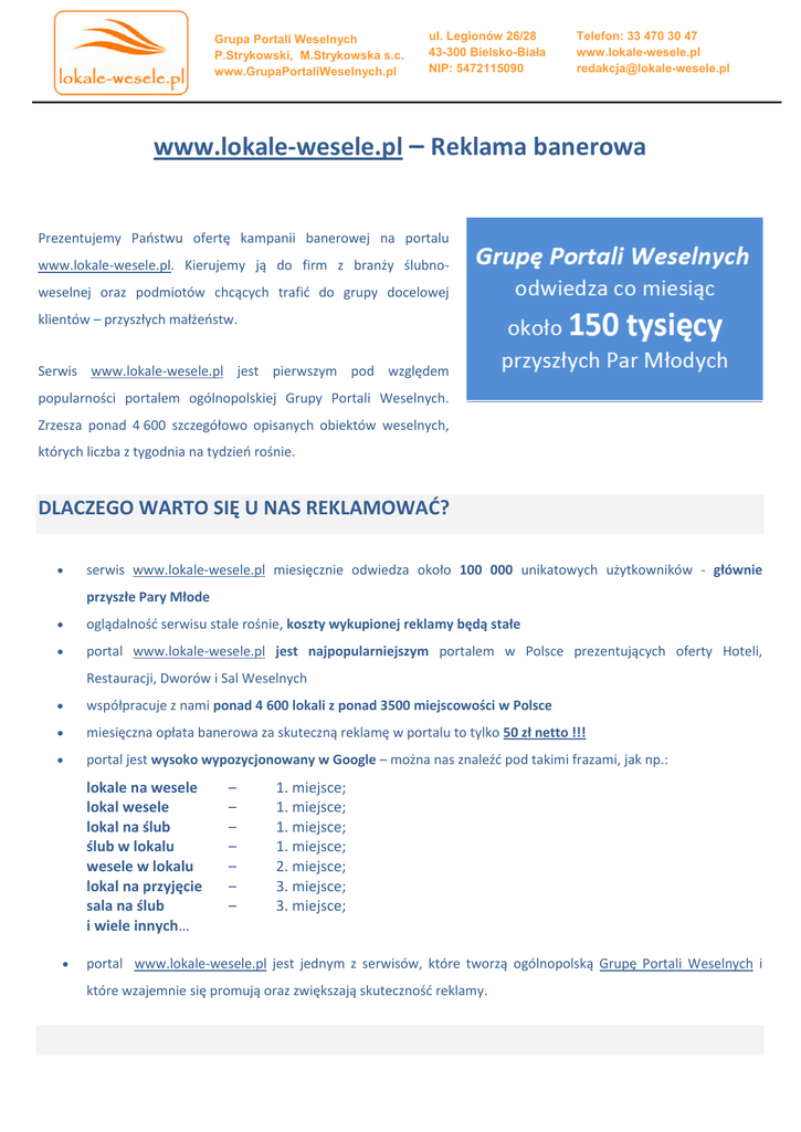 Grupa Portali Weselnych P.Strykowski, M.Strykowska s.c. www.GrupaPortaliWeselnych.pl ul. Legionów 26/28 43-300 Bielsko-Biała NIP: 5472115090 Telefon: 33 470 30 47 www.lokale-wesele.pl [email protected] www.lokale-wesele.pl – Reklama banerowa Prezentujemy Paostwu ofertę kampanii banerowej na portalu www.lokale-wesele.pl. Kierujemy ją do firm z branży ślubnoweselnej oraz podmiotów chcących trafid do grupy docelowej klientów – przyszłych małżeostw. Serwis www.lokale-wesele.pl jest pierwszym pod względem popularności portalem ogólnopolskiej Grupy Portali Weselnych. Zrzesza ponad 4 600 szczegółowo opisanych obiektów weselnych, których liczba z tygodnia na tydzieo rośnie. DLACZEGO WARTO SIĘ U NAS REKLAMOWAD? serwis www.lokale-wesele.pl miesięcznie odwiedza około 100 000 unikatowych użytkowników - głównie przyszłe Pary Młode oglądalnośd serwisu stale rośnie, koszty wykupionej reklamy będą stałe portal www.lokale-wesele.pl jest najpopularniejszym portalem w Polsce prezentujących oferty Hoteli, Restauracji, Dworów i Sal Weselnych współpracuje z nami ponad 4 600 lokali z ponad 3500 miejscowości w Polsce miesięczna opłata banerowa za skuteczną reklamę w portalu to tylko 50 zł netto !!! portal jest wysoko wypozycjonowany w Google – można nas znaleźd pod takimi frazami, jak np.: lokale na wesele lokal wesele lokal na ślub ślub w lokalu wesele w lokalu lokal na przyjęcie sala na ślub i wiele innych… – – – – – – – 1. miejsce; 1. miejsce; 1. miejsce; 1. miejsce; 2. miejsce; 3. miejsce; 3. miejsce; portal www.lokale-wesele.pl jest jednym z serwisów, które tworzą ogólnopolską Grupę Portali Weselnych i które wzajemnie się promują oraz zwiększają skutecznośd reklamy. MIEJSCA REKLAMOWE I CENNIK EMISJI BANERÓW www.lokale-wesele.pl Strona główna Wszystkie podstrony 1. Baner duży – 1200 zł netto / miesiąc Wielkośd grafiki: 430x100 px (JPG, GIF, FLASH). 2. Baner mały – 700 zł netto / miesiąc Wielkośd grafiki: 220x150px (JPG, GIF, FLASH). 3. Baner panorama – 600 zł netto /miesiąc (jedno województwo). Baner widoczny tylko nad listą ofert lokali z województwa lub danej miejscowości. Wielkośd grafiki: 600x120px (JPG, GIF, FLASH). 4A. Baner mały – 300 zł netto / miesiąc (jedno województwo). Baner jest widoczny na każdej podstronie w województwie, wielkośd grafiki: 220x150px (JPG, GIF, FLASH). 4B. Baner mały – 50 zł netto / miesiąc (jedna miejscowośd) Poniżej przedstawiamy niektóre portale, które wchodzą w skład Grupy Portali Weselnych, każdy z tych portali promuje serwis www.lokale-wesele.pl: www.filmy-wesele.pl www.auta-wesele.pl www.fotograf-wesele.pl www.muzyka-wesele.pl www.wesele.com.pl – – – – – ogólnopolski serwis z kamerzystami ślubnymi oferty pojazdów ślubnych największa baza fotografów ślubnych w Polsce baza zespołów muzycznych ogólnopolski portal ślubny Chcesz wiedzied więcej…? Skontaktuj się z nami w celu uzyskania więcej informacji odnośnie reklamy: [email protected] Zadzwoo: 607 333 738 601 162 229 723 975 288 Waldemar Lentowicz, Alicja Orszulik, Kamil Kulpa.