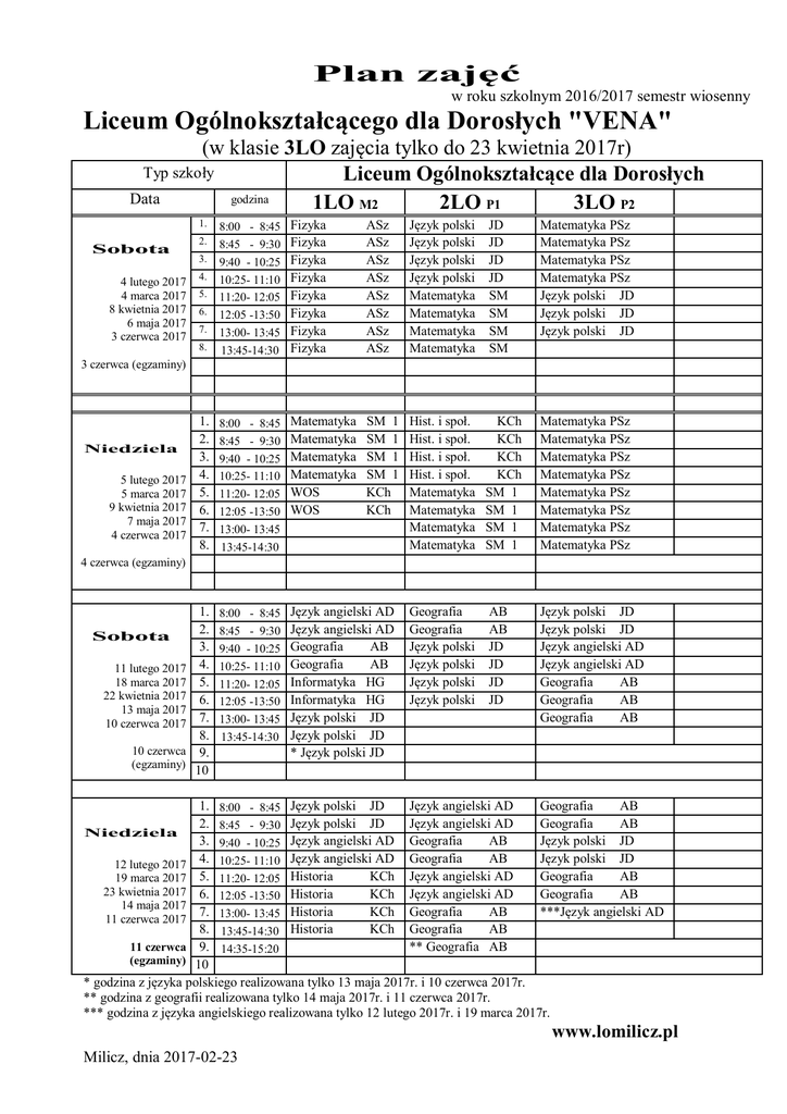 Plan zajęć - Liceum Ogólnokształcące dla Dorosłych "VENA" w Miliczu