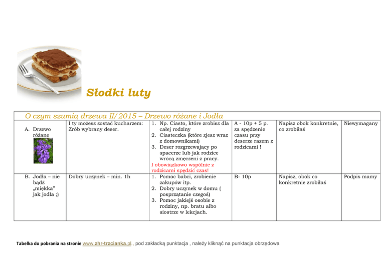 Słodki luty O czym szumią drzewa II/2015 – Drzewo różane i Jodła A. Drzewo różane B. Jodła – nie bądź „miękka” jak jodła ;) I ty możesz zostać kucharzem: Zrób wybrany deser. Dobry uczynek – min. 1h 1. Np. Ciasto, które zrobisz dla całej rodziny 2. Ciasteczka (które zjesz wraz z domownikami) 3. Deser rozgrzewający po spacerze lub jak rodzice wrócą zmęczeni z pracy. I obowiązkowo wspólnie z rodzicami spędzić czas! 1. Pomoc babci, zrobienie zakupów itp. 2. Dobry uczynek w domu ( posprzątanie czegoś) 3. Pomoc jakiejś osobie z rodziny, np. bratu albo siostrze w lekcjach. A - 10p + 5 p. za spędzenie czasu przy deserze razem z rodzicami ! Napisz obok konkretnie, co zrobiłaś Niewymagany B- 10p Napisz, obok co konkretnie zrobiłaś Podpis mamy Tabelka do pobrania na stronie www.zhr-trzcianka.pl., pod zakładką punktacja , należy kliknąć na punktacja obrzędowa