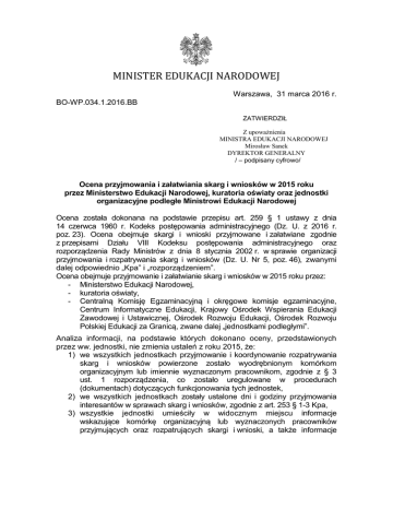 MINISTER EDUKACJI NARODOWEJ Warszawa, 31 marca 2016 r. BO-WP.034.1.2016.BB ZATWIERDZIŁ Z upoważnienia MINISTRA EDUKACJI NARODOWEJ Mirosław Sanek DYREKTOR GENERALNY / – podpisany cyfrowo/ Ocena przyjmowania i załatwiania skarg i wniosków w 2015 roku przez Ministerstwo Edukacji Narodowej, kuratoria oświaty oraz jednostki organizacyjne podległe Ministrowi Edukacji Narodowej Ocena została dokonana na podstawie przepisu art. 259 § 1 ustawy z dnia 14 czerwca 1960 r. Kodeks postępowania administracyjnego (Dz. U. z 2016 r. poz. 23). Ocena obejmuje skargi i wnioski przyjmowane i załatwiane zgodnie z przepisami Działu VIII Kodeksu postępowania administracyjnego oraz rozporządzenia Rady Ministrów z dnia 8 stycznia 2002 r. w sprawie organizacji przyjmowania i rozpatrywania skarg i wniosków (Dz. U. Nr 5, poz. 46), zwanymi dalej odpowiednio „Kpa” i „rozporządzeniem”. Ocena obejmuje przyjmowanie i załatwianie skarg i wniosków w 2015 roku przez: - Ministerstwo Edukacji Narodowej, - kuratoria oświaty, - Centralną Komisję Egzaminacyjną i okręgowe komisje egzaminacyjne, Centrum Informatyczne Edukacji, Krajowy Ośrodek Wspierania Edukacji Zawodowej i Ustawicznej, Ośrodek Rozwoju Edukacji, Ośrodek Rozwoju Polskiej Edukacji za Granicą, zwane dalej „jednostkami podległymi”. Analiza informacji, na podstawie których dokonano oceny, przedstawionych przez ww. jednostki, nie zmienia ustaleń z roku 2015, że: 1) we wszystkich jednostkach przyjmowanie i koordynowanie rozpatrywania skarg i wniosków powierzone zostało wyodrębnionym komórkom organizacyjnym lub imiennie wyznaczonym pracownikom, zgodnie z § 3 ust. 1 rozporządzenia, co zostało uregulowane w procedurach (dokumentach) dotyczących funkcjonowania tych jednostek, 2) we wszystkich jednostkach zostały ustalone dni i godziny przyjmowania interesantów w sprawach skarg i wniosków, zgodnie z art. 253 § 1-3 Kpa, 3) wszystkie jednostki umieściły w widocznym miejscu informacje wskazujące komórkę organizacyjną lub wyznaczonych pracowników przyjmujących oraz rozpatrujących skargi i wnioski, a także informacje o dniach i godzinach przyjęć, zgodnie z art. 253 § 4 Kpa oraz § 3 ust. 2 rozporządzenia, 4) we wszystkich jednostkach istnieje możliwość przyjmowania skarg i wniosków nie tylko pisemnie, ale również za pomocą poczty elektronicznej i ustnie do protokołu, zgodnie z § 5 rozporządzenia, 5) we wszystkich jednostkach skargi i wnioski oraz związane z nimi pisma i inne dokumenty rejestruje się i przechowuje w sposób ułatwiający kontrolę przebiegu i terminów załatwiania poszczególnych skarg i wniosków, zgodnie z art. 254 Kpa. W porównaniu do roku 2014, nastąpił nieznaczny wzrost liczby skarg i wniosków wniesionych do ministerstwa, kuratoriów oświaty i jednostek podległych w roku 2015: w roku 2014 wniesiono 2836 skarg, w 2015 roku – 3079 (wzrost o 8,6%), w roku 2014 wniesiono 78 wniosków, w 2015 roku – 83 (wzrost o 6,4%), z czego za zasadne uznano: w roku 2014, 580 skarg (20,5%), w 2015 roku – 624 (20,3%), w roku 2014, 26 wniosków (33,3%), w 2015 roku – 30 (29,1%). Nastąpił również nieznaczny wzrost liczby skarg i wniosków, które przekazano do rozpatrzenia właściwym organom, w 2014 roku przekazano 403 skargi i wnioski, w roku 2015 – 458 (wzrost o 13,6%), Do ministerstwa, kuratoriów oświaty oraz jednostek podległych w roku 2015 wpłynęły 933 skargi niezawierające imienia i nazwiska (nazwy) oraz adresu wnoszącego, co stanowi 30,3% liczby wszystkich wniesionych skarg w roku 2015 (28% w roku 2014). W 106 przypadkach (127 w roku 2014) wystąpiły nieprawidłowości polegające na: przekazaniu skarg (wniosków) właściwemu organowi na podstawie art. 231 i art. 243 Kpa po upływie siedmiodniowego terminu - 35 przypadków (w roku 2014 – 40), wskazaniu skarżącemu właściwego organu na podstawie art. 231 Kpa po upływie siedmiodniowego terminu - 11 przypadków (w roku 2014 - 8), załatwieniu skarg (wniosków) po upływie miesięcznego terminu lub po upływie nowego terminu załatwienia, wyznaczonego na podstawie art. 36 i art. 245 Kpa – 38 przypadków (w roku 2014 - 61), niezawiadomieniu skarżących (wnioskujących) o przyczynach zwłoki w załatwieniu skargi albo o czynnościach podjętych w celu rozpatrzenia wniosku lub niewskazaniu nowego terminu załatwienia w przypadku niezałatwienia skargi lub wniosku w terminie jednego miesiąca (art. 36 i art. 245 Kpa) - 22 przypadki (w roku 2014 - 18). Przedmiotem przeprowadzonej analizy były skargi i wnioski uznane za zasadne. Najczęściej występujące powody składania skarg do Ministerstwa Edukacji Narodowej: niezapewnienie bezpieczeństwa uczniom w szkole, nieprzestrzeganie przepisów prawa oświatowego, nieprzestrzeganie praw dziecka i ucznia, nadzór dyrektora ORPEG nad SPK, zatrudnianie wolontariuszy w szkolnych punktach konsultacyjnych (SPK), rekrutacja uczniów do SPK, prowadzenie strony internetowej SPK i szkolnego profilu na portalu społecznościowym, rozpowszechnianie wizerunku bez zezwolenia osoby na nim przedstawionej, udzielenie odpowiedzi na skargę w sposób zbyt ogólnikowy (bez podania uchybień czy zaniedbań w pracy szkoły oraz konsekwencji wynikających ze stwierdzonych nieprawidłowości), zaniedbanie lub nienależyte wykonywanie zadań przez pracownika jednostki podległej MEN. Najczęściej występujące powody składania wniosków: niedoskonałość przepisów w zakresie postępowania dyscyplinarnego nauczycieli oraz kwalifikacji wymaganych od nauczycieli, troska o bezpieczeństwo uczniów, wymiar godzin etyki. Do Ministerstwa Edukacji Narodowej skargi i wnioski wnoszone były przez rodziców uczniów, w tym rodziców uczniów niepełnosprawnych, uczniów lub ich opiekunów oraz nauczycieli. Najczęściej występujące powody składania skarg do kuratoriów oświaty: przekonanie skarżących o braku możliwości pozytywnego załatwienia sprawy w szkole lub placówce oświatowej, a 