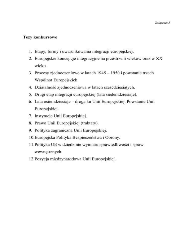 Załącznik 3 Tezy konkursowe 1. Etapy, formy i uwarunkowania integracji europejskiej. 2. Europejskie koncepcje integracyjne na przestrzeni wieków oraz w XX wieku. 3. Procesy zjednoczeniowe w latach 1945 – 1950 i powstanie trzech Wspólnot Europejskich. 4. Działalność zjednoczeniowa w latach sześćdziesiątych. 5. Drugi etap integracji europejskiej (lata siedemdziesiąte). 6. Lata osiemdziesiąte – droga ku Unii Europejskiej. Powstanie Unii Europejskiej. 7. Instytucje Unii Europejskiej. 8. Prawo Unii Europejskiej (traktaty). 9. Polityka zagraniczna Unii Europejskiej. 10.Europejska Polityka Bezpieczeństwa i Obrony. 11.Polityka UE w dziedzinie wymiaru sprawiedliwości i spraw wewnętrznych. 12.Pozycja międzynarodowa Unii Europejskiej.