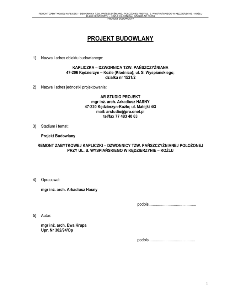 REMONT ZABYTKOWEJ KAPLICZKI – DZWONNICY TZW. PAŃSZCZYŹNIANEJ POŁOŻONEJ PRZY UL. S. WYSPIAŃSKIEGO W KĘDZIERZYNIE - KOŹLU 47-206 KĘDZIERZYN – KOŹLE (KŁODNICA); DZIAŁKA NR 1521/2 PROJEKT BUDOWLANY PROJEKT BUDOWLANY 1) Nazwa i adres obiektu budowlanego: KAPLICZKA – DZWONNICA TZW. PAŃSZCZYŹNIANA 47-206 Kędzierzyn – Koźle (Kłodnica); ul. S. Wyspiańskiego; działka nr 1521/2 2) Nazwa i adres jednostki projektowania: AR STUDIO PROJEKT mgr inż. arch. Arkadiusz HASNY 47-220 Kędzierzyn-Koźle; ul. Matejki 4/3 mail: [email protected] tel/fax 77 483 40 63 3) Stadium i temat: Projekt Budowlany REMONT ZABYTKOWEJ KAPLICZKI – DZWONNICY TZW. PAŃSZCZYŹNIANEJ POŁOŻONEJ PRZY UL. S. WYSPIAŃSKIEGO W KĘDZIERZYNIE – KOŹLU 4) Opracował: mgr inż. arch. Arkadiusz Hasny podpis............................................. 5) Autor: mgr inż. arch. Ewa Krupa Upr. Nr 302/94/Op podpis............................................ 1 REMONT ZABYTKOWEJ KAPLICZKI – DZWONNICY TZW. PAŃSZCZYŹNIANEJ POŁOŻONEJ PRZY UL. S. WYSPIAŃSKIEGO W KĘDZIERZYNIE - KOŹLU 47-206 KĘDZIERZYN – KOŹLE (KŁODNICA); DZIAŁKA NR 1521/2 PROJEKT BUDOWLANY 1. SPIS ZAWARTOŚCI OPRACOWANIA 1. 2. 4. 3. 5. 6. Spis zawartości opracowania Spis rysunków Opis techniczny Opis zagospodarowania terenu Informacja o bezpieczeństwie i ochronie zdrowia Zaświadczenia, oświadczenia, atesty, załączniki 2. SPIS RYSUNKÓW Nr S1 A1 A2 A3 A4 A5 A6 A7 A8 A9 A10 nr strony 2 2 2 9 14 19 Nazwa rysunku Skala Szkic sytuacyjny Elewacja PN-WSCH i PN-ZACH Elewacja PD-ZACH i PD-WSCH Rzut przyziemia Rzut poddasza Przekrój a-a Przekrój b-b Rzut dachu Więźba dachowa, imak dzwonu Gzyms kordonowy, gzyms koronujący Stolarka 1 : 500 1 : 50 1 : 50 1 : 50 1 : 50 1 : 50 1 : 50 1 : 50 1 : 50 1:2 1 : 20 3. OPIS TECHNICZNY 3.1. PODSTAWA OPRACOWANIA 3.1.1. Zlecenie Inwestora: Gmina Kędzierzyn – Koźle ul. Piramowicza 32 47-200 Kędzierzyn-Koźle 3.1.2. Uzgodnienia koncepcyjne 3.1.3. Wizja lokalna 3.1.4. Koncepcja architektoniczna zaakceptowana przez Inwestora i OWKZ 3.1.5. Pozostałe dokumenty np. uzgodnienia itp. 3.1.6. Akty prawne 2 REMONT ZABYTKOWEJ KAPLICZKI – DZWONNICY TZW. PAŃSZCZYŹNIANEJ POŁOŻONEJ PRZY UL. S. WYSPIAŃSKIEGO W KĘDZIERZYNIE - KOŹLU 47-206 KĘDZIERZYN – KOŹLE (KŁODNICA); DZIAŁKA NR 1521/2 PROJEKT BUDOWLANY 3.2. PRZEDMIOT INWESTYCJI. Przedmiotem inwestycji jest remont zabytkowej kapliczki-dzwonnicy tzw."Pańszczyźnianej". Kaplica zlokalizowana jest w Kędzierzynie – Koźlu, obręb Kłodnica, przy ul. S. Wyspiańskiego na działce nr 1521/2. 3.2.1. OPIS ZABYTKU Zbudowana w 1814 roku, wolnostojąca, dwukondygnacyjna, murowana z cegły kapliczka przydrożna, otynkowana. Wpisana do rejestru zabytków w 2011 roku, pod nr Ks.At.I 167/2011. Założona pierwotnie na planie kwadratu o wycofanych, zaokrąglonych narożnikach. Aktualna deformacja planu 3,52m x 3,38m wynikała prawdopodobnie z remontu jakiemu obiekt uległ w latach 80, XX wieku, spowodowanego przez uderzenie weń samochodu ciężarowego. Podziały międzykondygnacyjne w postaci profilowanych gzymsów: kordonowy, kryty dachówką ceramiczną oraz koronujący. Dach namiotowy, czteropołaciowy o zmiennym kącie pochylenia połaci i wyoblonych narożach, kryty gontem drewnianym, zwieńczony metalową iglicą z kulistą sygnaturką. Ściany przyziemia z podziałem ramowym, otwory okienne (w ścianach PDWSCH i PN-ZACH) zamknięte łukiem pełnym, wejście zamknięte łukiem pełnym z zwornikiem. Nad wejściem inskrypcja: "Na znak wdzięczności P. Bogu, za uwolnienie od pańszczyzny w Roku Pańskim 1814". Po remoncie w 1926 roku nad napisem w języku polskim w płycinie poniżej otworu dzwonnicy umieszczono tablicę z napisem w języku niemieckim: "Gott zur Ehr und Dank fur die Befreiung von der Robotpflicht. 1814. Erneuert 1926". Wnętrze przekryte sklepieniem żagielkowym (kopuła sferyczna). Wewnątrz zachowany postument ołtarza. Brak wzmiankowanych: obrazu św.Floriana i rzeźby św.Jana Nepomucena. Druga kondygnacja przestrzelona otworami o łuku pełnym z uskokiem, pod okapami otworów po stronie zewnętrznej, prostokątne płyciny w rytmie nawiązującym do podziałów przyziemia. Brak ślepego pułapu podłogi (pozostały nisze pod belki nośne konstrukcji podłogi), zachowany imak dzwonu, dzwon wtórny (dzwonek wielkości ~14cm), pierwotny został zdemontowany i zaginął podczas działań wojennych w trakcie II Wojny Światowej. Opaska wokół obiektu w postaci płyty betonowej, szerokości ~1m 3 REMONT ZABYTKOWEJ KAPLICZKI – DZWONNICY TZW. PAŃSZCZYŹNIANEJ POŁOŻONEJ PRZY UL. S. WYSPIAŃSKIEGO W KĘDZIERZYNIE - KOŹLU 47-206 KĘDZIERZYN – KOŹLE (KŁODNICA); DZIAŁKA NR 1521/2 PROJEKT BUDOWLANY 3.2.2. AKTUALNY STAN ZABYTKU W trakcie wizji stwierdzono: - Powierzchniowe zawilgocenia ścian przyziemia, sięgające 1/2 wysokości poziomu otworów okiennych - Uszkodzenia, ubytki i odpryski tynków zewnętrznych, spowodowane zawilgoceniem ścian - Złuszczenie powłok malarskich na całej powierzchni, spowodowane przez użycie nieprzepuszczalnej powłoki malarskiej - Zły stan stolarki okiennej i drzwiowej. Rozwarstwienia elementów szprosów, zagrzybienie ,zarobaczywienie oraz gnicie elementów drzwi, spowodowane pokryciem farbą olejną, aktualnie złuszczoną - Uszkodzenia i ubytki części dachówek stanowiących pokrycie gzymsu kordonowego. - Braki w pokryciu dachu. Część gontów uległa korozji biologicznej i wysunęła się lub wypadła. Prawdopodobnie zastosowano gont nie nadający się do pokryć dachowych ( maszynowy) - Korozję i degradację metalowej, ocynkowanej iglicy dachu - Zawilgocenie i korozję biologiczną elementów konstrukcyjnych dachu : krokwi, łat. Spowodowane otworami w pokryciu dachu i rozerwaniem folii izolacyjnej 3.2.3. BADANIA STRATYGRAFICZNE TYNKU I WARSTW MALARSKICH 3.2.3.1. BADANIA STRATYGRAFICZNE TYNKU 4 2 1 3 4 REMONT ZABYTKOWEJ KAPLICZKI – DZWONNICY TZW. PAŃSZCZYŹNIANEJ POŁOŻONEJ PRZY UL. S.