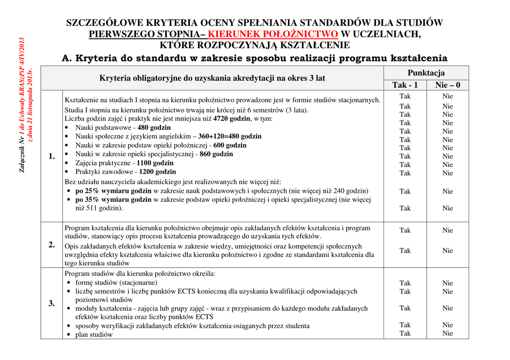 Załącznik Nr 1 do Uchwały KRASzPiP 4/IV/2013 z dnia 21 listoapada 2013r. SZCZEGÓŁOWE KRYTERIA OCENY SPEŁNIANIA STANDARDÓW DLA STUDIÓW PIERWSZEGO STOPNIA– KIERUNEK POŁOŻNICTWO W UCZELNIACH, KTÓRE ROZPOCZYNAJĄ KSZTAŁCENIE A. Kryteria do standardu w zakresie sposobu realizacji programu kształcenia Kryteria obligatoryjne do uzyskania akredytacji na okres 3 lat 1. 2. 3. Kształcenie na studiach I stopnia na kierunku położnictwo prowadzone jest w formie studiów stacjonarnych. Studia I stopnia na kierunku położnictwo trwają nie krócej niż 6 semestrów (3 lata). Liczba godzin zajęć i praktyk nie jest mniejsza niż 4720 godzin, w tym: • Nauki podstawowe - 480 godzin • Nauki społeczne z językiem angielskim – 360+120=480 godzin • Nauki w zakresie podstaw opieki położniczej - 600 godzin • Nauki w zakresie opieki specjalistycznej - 860 godzin • Zajęcia praktyczne - 1100 godzin • Praktyki zawodowe - 1200 godzin Bez udziału nauczyciela akademickiego jest realizowanych nie więcej niż: • po 25% wymiaru godzin w zakresie nauk podstawowych i społecznych (nie więcej niż 240 godzin) • po 35% wymiaru godzin w zakresie podstaw opieki położniczej i opieki specjalistycznej (nie więcej niż 511 godzin). Program kształcenia dla kierunku położnictwo obejmuje opis zakładanych efektów kształcenia i program studiów, stanowiący opis procesu kształcenia prowadzącego do uzyskania tych efektów. Opis zakładanych efektów kształcenia w zakresie wiedzy, umiejętności oraz kompetencji społecznych uwzględnia efekty kształcenia właściwe dla kierunku położnictwo i zgodne ze standardami kształcenia dla tego kierunku studiów Program studiów dla kierunku położnictwo określa: • formę studiów (stacjonarne) • liczbę semestrów i liczbę punktów ECTS konieczną dla uzyskania kwalifikacji odpowiadających poziomowi studiów • moduły kształcenia - zajęcia lub grupy zajęć - wraz z przypisaniem do każdego modułu zakładanych efektów kształcenia oraz liczby punktów ECTS • sposoby weryfikacji zakładanych efektów kształcenia osiąganych przez studenta • plan studiów Punktacja Tak - 1 Nie – 0 Tak Tak Tak Tak Tak Tak Tak Tak Tak Tak Nie Nie Nie Nie Nie Nie Nie Nie Nie Nie Tak Nie Tak Nie Tak Nie Tak Nie Tak Tak Nie Nie Tak Nie Tak Tak Nie Nie • łączną liczbę punktów ECTS, którą student musi uzyskać na zajęciach wymagających bezpośredniego udziału nauczycieli akademickich i studentów • łączną liczbę punktów ECTS, którą student musi uzyskać w ramach zajęć, do których odnoszą się efekty kształcenia dla określonego kierunku, poziomu i profilu kształcenia • łączną liczbę punktów ECTS, którą student musi uzyskać w ramach zajęć o charakterze praktycznym • wymiar, zasady i formę odbywania praktyk. Program studiów I stopnia umożliwia studentowi wybór jednego z trzech przedmiotów (zakażenia szpitalne, język migowy lub promocja zdrowia psychicznego) w zakresie podstaw opieki położniczej. 4. 5. 6. Program kształcenia: • jest zgodny ze standardami kształcenia • jest kompletny i w formie pisemnej • nie zawiera zbędnych powtórzeń • cele kształcenia zawarte w programach szczegółowych są zgodne z efektami kształcenia zawartymi w standardach kształcenia oraz odpowiadają kompetencjom zawodowym określonym w art. 5 Ustawy o zawodach pielęgniarki i położnej z dnia 15 lipca 2011r. • program uwzględnia zadania do samodzielnej pracy studenta. Treści kształcenia w poszczególnych grupach (przedmioty / moduły) mają oszacowane punkty ECTS, a ich liczba na studiach I stopnia na kierunku położnictwo wynosi nie mniej 180, w tym: • Nauki podstawowe – 16 ECTS • Nauki społeczne z językiem angielskim – 16 ECTS • Nauki w zakresie podstaw opieki położniczej – 24 ECTS • Nauki w zakresie opieki specjalistycznej – 34 ECTS • Zajęcia praktyczne – 55 ECTS • Praktyki zawodowe – 30 ECTS • Egzamin dyplomowy – 5 ECTS Student otrzymuje nie mniej niż 30 punktów ECTS za zaliczenie każdego semestru. Punkty ECTS zostały przypisane za: • zaliczenie każdego z zajęć i praktyk przewidzianych w programie kształcenia • przygotowanie i złożenie pracy dyplomowej i przygotowanie do egzaminu dyplomowego zgodnie z programem kształcenia. Zaproponowane treści programowe, formy zajęć oraz metody dydaktyczne umożliwiają osiągnięcie celów kształcenia i realizację wszystkich efektów kształcenia wynikających ze standardów kształcenia na kierunku położnictwo. Tak Nie Tak Nie Tak Nie Tak Nie Tak Nie Tak Tak Tak Nie Nie Nie Tak Nie Tak Nie Tak Nie Tak Tak Tak Tak Tak Tak Tak Tak Nie Nie Nie Nie Nie Nie Nie Nie Tak Tak Nie Nie Tak Nie 2 7. Zajęcia praktyczne i praktyki zawodowe są zaplanowane zgodnie ze standardami kształcenia dla kierunku studiów położnictwo. Tak Nie 8. Jest przygotowana dokumentacja oceny postępów i postawy studentów na zajęciach praktycznych i praktykach zawodowych. Tak Nie 9. Jest przygotowany wykaz umiejętności, które student będzie zaliczał w czasie zajęć praktycznych i praktyk zawodowych. Tak Nie 10. (po rozpoczęciu studiów z reprezentacją studentów tego kierunku). Tak Nie pierwszego stopnia na kierunku położnictwo kończą się egzaminem dyplomowym, składającym się 11. Studia z części teoretycznej i praktycznej. Tak Nie 12. Przebieg egzaminu dyplomowego teoretycznego i praktycznego jest zaplanowany. Tak Nie Tak Nie Powołana jest Komisja Programowa z reprezentacją nauczycieli kierunku studiów położnictwo Egzamin dyplomowy, po złożeniu pracy dyplomowej, będzie obejmował sprawdzenie wiedzy i umiejętności 13. praktycznych zdobytych w całym okresie studiów. RAZEM 48 pkt B. Kryteria do standardów w zakresie kadry prowadzącej kształcenie Kryteria obligatoryjne do uzyskania akredytacji na okres 3 lat 1. Zatrudnienie na podstawie mianowania albo umowy o pracę, w pełnym wymiarze czasu pracy, n