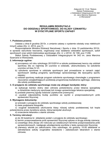 Załącznik Nr 13 do "Statutu Szkoły Podstawowej z Oddziałami Integracyjnymi Nr 342 im. Jana Marcina Szancera w Warszawie" REGULAMIN REKRUTACJI DO ODDZIAŁU SPORTOWEGO, DO KLASY CZWARTEJ W DYSCYPLINIE SPORTU ZAPASY 1. Podstawa prawna: Ustawa z dnia 6 grudnia 2013r, o zmianie ustawy o systemie oświaty oraz niektórych innych ustaw (Dz. U. 2014, poz.7) Rozporządzenie Ministra Edukacji Narodowej i Sportu z dnia 15 października 2012r. w sprawie warunków tworzenia, organizacji oraz działania oddziałów sportowych, szkół sportowych oraz szkół mistrzostwa sportowego (Dz. U. z 2012r. Nr 196, poz.1129). Statut Szkoły Podstawowej z Oddziałami Integracyjnymi Nr 342 im. Jana Marcina Szancera w Warszawie. 2. Informacje ogólne: a) począwszy od roku szkolnego 2013/2014 w szkole podstawowej tworzy się oddział sportowy dla co najmniej 20 uczniów w oddziale, ukierunkowany na szkolenie uczniów od klas IV-VI; b) szkolenie sportowe w oddziale sportowym jest prowadzone w ramach zajęć sportowych według programu sportowego opracowanego dla dyscypliny sportu zapasy; c) oddział sportowy realizuje program szkolenia sportowego równolegle z programem nauczania uwzględniającym podstawę programową kształcenia ogólnego, właściwą dla szkoły podstawowej. 3. O przyjęcie do oddziału sportowego może się ubiegać kandydat, który: a) wykazuje bardzo dobry stan zdrowia potwierdzony przez lekarza specjalistę w dziedzinie medycyny sportowej lub innego uprawnionego lekarza specjalistę; b) posiada pisemną zgodę rodziców (opiekunów prawnych); c) uzyskał odpowiednią liczbę punktów za wyniki z przeprowadzonych prób sprawności fizycznej. 4. Wymagane dokumenty: a) wniosek o przyjęcie do oddziału sportowego szkoły podstawowej; b) dwie podpisane fotografie; c) oryginał świadectwa ukończenia klasy niższej szkoły podstawowej lub kopia potwierdzona przez dyrektora szkoły, którą kandydat ukończył; d) orzeczenie lekarskie o stanie zdrowia. 5. Terminy rekrutacji: a) do 30 kwietnia br. składanie podań o przyjęcie do oddziału sportowego; b) termin przeprowadzenia prób sprawności fizycznej upływa w drugą sobotę czerwca; c) czwartego dnia (licząc dni robocze) po ostatecznym terminie przeprowadzenia prób sprawnościowych, następuje udostępnienie wyników z testu sprawności fizycznej; d) pierwszy wtorek po zakończeniu roku szkolnego, do godziny 15.00 składanie w sekretariacie szkoły oryginałów świadectw i zaświadczeń lekarskich o stanie zdrowia; e) pierwszy piątek po zakończeniu roku szkolnego, do godziny 15.00 ogłoszenie listy przyjętych do klasy czwartej oddziału sportowego. 6. Szkolna komisja rekrutacyjno-kwalifikacyjna: a) w celu przeprowadzenia rekrutacji do klasy czwartej oddziału sportowego dyrektor szkoły do dnia 28 lutego br. powołuje szkolną komisję rekrutacyjno-kwalifikacyjną; b) w skład komisji wchodzą: - wicedyrektor szkoły jako przewodniczący; - nauczyciele wychowania fizycznego, - pedagog szkolny, c) zadania szkolnej komisji rekrutacyjno-kwalifikacyjnej: - weryfikuje (w miarę potrzeb) postanowienia regulaminu na dany rok szkolny, - do 30 marca br. wydaje komunikat (ogłoszenie) o terminach rekrutacji i zasadach kwalifikowania kandydatów do oddziału sportowego, - przeprowadza próby sprawności fizycznej -ustala i podaje do publicznej wiadomości listę kandydatów przyjętych i nieprzyjętych i ewentualną liczbę wolnych miejsc; -kwalifikuje kandydatów do przyjęcia na podstawie orzeczeń lekarskich, - ustala listę uczniów przyjętych do szkoły, - sporządza protokół postępowania rekrutacyjnego. Uwaga: W przypadku, gdy liczba kandydatów spełniających te same kryteria i warunki rekrutacji przekroczy limit miejsc przewidzianych dla uczniów w oddziale sportowym, komisja rekrutacyjno-kwalifikacyjna w pierwszej kolejności przeprowadzi postępowanie kwalifikacyjne wobec uczniów objętych rejonizacją nauczania. 7. Wnoszenie i rozpatrywanie odwołań: a) możliwość wniesienia odwołania przysługuje rodzicom (prawnym opiekunom) w terminie do trzech dni, liczonym od daty ogłoszenia listy uczniów przyjętych do oddziału sportowego; b) odwołania od wyników rekrutacji rozpatruje dyrektor szkoły w terminie do siedmiu dni, liczonym od daty ich złożenia; c) decyzja dyrektora szkoły jest ostateczna. Załączniki do regulaminu: 1. Test sprawności fizycznej (Opis prób sprawnościowych - zasady uzyskiwania punktów). 2. Wniosek o przyjęcie do oddziału sportowego. Załącznik Nr 1 do "Regulaminu rekrutacji do oddziału sportowego" MIĘDZYNARODOWY TEST SPRAWNOŚCI FIZYCZNEJ (Opis prób sprawnościowych - zasady uzyskiwania punktów) I. Próby sprawności fizycznej: 1. Próba szybkości - Bieg na dystansie 50 m z pozycji stojącej. Próba powtarzana jest dwukrotnie. O wyniku decyduje czas biegu uzyskany w lepszej próbie. 2. Skoczność - Skok w dal z miejsca. Kandydat wykonuje skok w dal z miejsca. Próba powtarzana jest dwukrotnie. Liczy się odległość od miejsca wybicia do ostatniego śladu pozostawionego na podłożu lub piachu. 3. Wytrzymałość – bieg na dystansie 600 m. Na sygnał „na miejsca” kandydat staje za linią startu w pozycji startowej wysokiej. Na sygnał „start” biegnie odpowiadającym mu tempem do linii mety. 4. Pomiar dynamometryczny siły dłoni - kandydat ściska dynamometr ręką silniejszą. Nadgarstek powinien znajdować się w przedłużeniu linii przedramienia. W czasie wykonywania próby ręka testowana nie może dotykać żadnej części ciała. Siła dłoni mierzona jest w kilogramach. Liczy się pomiar lepszy z dwóch prób. Wymachy ręką w czasie pomiaru są niedozwolone, wykonaniu prób powinna towarzyszyć pełna koncentracja psychiczna. 5. Wytrzymanie w zwisie na drążku- próba siły rąk i barków - z podstawionego krzesła lub ławeczki gimnastycznej badany przechodzi do zwisu nachwytem o ramionach ugiętych. Dłonie powinny znajdować się na szerokości barków. Na syg