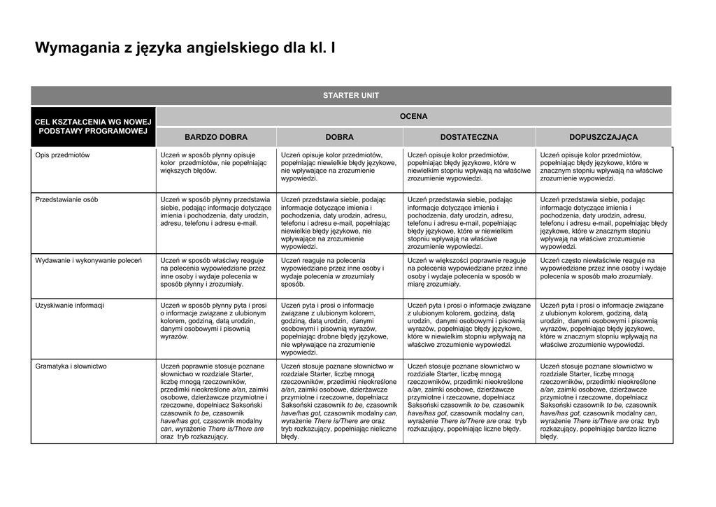 Wymagania z języka angielskiego dla kl. I STARTER UNIT CEL KSZTAŁCENIA WG NOWEJ PODSTAWY PROGRAMOWEJ OCENA BARDZO DOBRA DOBRA DOSTATECZNA DOPUSZCZAJĄCA Opis przedmiotów Uczeń w sposób płynny opisuje kolor przedmiotów, nie popełniając większych błędów. Uczeń opisuje kolor przedmiotów, popełniając niewielkie błędy językowe, nie wpływające na zrozumienie wypowiedzi. Uczeń opisuje kolor przedmiotów, popełniając błędy językowe, które w niewielkim stopniu wpływają na właściwe zrozumienie wypowiedzi. Uczeń opisuje kolor przedmiotów, popełniając błędy językowe, które w znacznym stopniu wpływają na właściwe zrozumienie wypowiedzi. Przedstawianie osób Uczeń w sposób płynny przedstawia siebie, podając informacje dotyczące imienia i pochodzenia, daty urodzin, adresu, telefonu i adresu e-mail. Uczeń przedstawia siebie, podając informacje dotyczące imienia i pochodzenia, daty urodzin, adresu, telefonu i adresu e-mail, popełniając niewielkie błędy językowe, nie wpływające na zrozumienie wypowiedzi. Uczeń przedstawia siebie, podając informacje dotyczące imienia i pochodzenia, daty urodzin, adresu, telefonu i adresu e-mail, popełniając błędy językowe, które w niewielkim stopniu wpływają na właściwe zrozumienie wypowiedzi. Uczeń przedstawia siebie, podając informacje dotyczące imienia i pochodzenia, daty urodzin, adresu, telefonu i adresu e-mail, popełniając błędy językowe, które w znacznym stopniu wpływają na właściwe zrozumienie wypowiedzi. Wydawanie i wykonywanie poleceń Uczeń w sposób właściwy reaguje na polecenia wypowiedziane przez inne osoby i wydaje polecenia w sposób płynny i zrozumiały. Uczeń reaguje na polecenia wypowiedziane przez inne osoby i wydaje polecenia w zrozumiały sposób. Uczeń w większości poprawnie reaguje na polecenia wypowiedziane przez inne osoby i wydaje polecenia w sposób w miarę zrozumiały. Uczeń często niewłaściwie reaguje na wypowiedziane przez inne osoby i wydaje polecenia w sposób mało zrozumiały. Uzyskiwanie informacji Uczeń w sposób płynny pyta i prosi o informacje związane z ulubionym kolorem, godziną, datą urodzin, danymi osobowymi i pisownią wyrazów. Uczeń pyta i prosi o informacje związane z ulubionym kolorem, godziną, datą urodzin, danymi osobowymi i pisownią wyrazów, popełniając drobne błędy językowe, nie wpływające na zrozumienie wypowiedzi. Uczeń pyta i prosi o informacje związane z ulubionym kolorem, godziną, datą urodzin, danymi osobowymi i pisownią wyrazów, popełniając błędy językowe, które w niewielkim stopniu wpływają na właściwe zrozumienie wypowiedzi. Uczeń pyta i prosi o informacje związane z ulubionym kolorem, godziną, datą urodzin, danymi osobowymi i pisownią wyrazów, popełniając błędy językowe, które w znacznym stopniu wpływają na właściwe zrozumienie wypowiedzi. Gramatyka i słownictwo Uczeń poprawnie stosuje poznane słownictwo w rozdziale Starter, liczbę mnogą rzeczowników, przedimki nieokreślone a/an, zaimki osobowe, dzierżawcze przymiotne i rzeczowne, dopełniacz Saksoński czasownik to be, czasownik have/has got, czasownik modalny can, wyrażenie There is/There are oraz tryb rozkazujący. Uczeń stosuje poznane słownictwo w rozdziale Starter, liczbę mnogą rzeczowników, przedimki nieokreślone a/an, zaimki osobowe, dzierżawcze przymiotne i rzeczowne, dopełniacz Saksoński czasownik to be, czasownik have/has got, czasownik modalny can, wyrażenie There is/There are oraz tryb rozkazujący, popełniając nieliczne błędy. Uczeń stosuje poznane słownictwo w rozdziale Starter, liczbę mnogą rzeczowników, przedimki nieokreślone a/an, zaimki osobowe, dzierżawcze przymiotne i rzeczowne, dopełniacz Saksoński czasownik to be, czasownik have/has got, czasownik modalny can, wyrażenie There is/There are oraz tryb rozkazujący, popełniając liczne błędy. Uczeń stosuje poznane słownictwo w rozdziale Starter, liczbę mnogą rzeczowników, przedimki nieokreślone a/an, zaimki osobowe, dzierżawcze przymiotne i rzeczowne, dopełniacz Saksoński czasownik to be, czasownik have/has got, czasownik modalny can, wyrażenie There is/There are oraz tryb rozkazujący, popełniając bardzo liczne błędy. UNIT 1 CEL KSZTAŁCENIA WG NOWEJ PODSTAWY PROGRAMOWEJ OCENA DOSTATECZNA DOPUSZCZAJĄCA BARDZO DOBRA DOBRA Przedstawianie osób Uczeń w sposób płynny przedstawia siebie i inne osoby, podając informacje dotyczące imienia, wieku, miejsca zamieszkania, szkoły, znajomych, upodobań, hobby i codziennych czynności. Uczeń przedstawia siebie i inne osoby, podając informacje dotyczące imienia i wieku, miejsca zamieszkania, szkoły, znajomych, upodobań, hobby i codziennych czynności, popełniając niewielkie błędy językowe, nie wpływające na zrozumienie wypowiedzi. Uczeń przedstawia siebie i inne osoby, podając informacje dotyczące imienia i wieku, miejsca zamieszkania, szkoły, znajomych, upodobań, hobby i codziennych czynności, popełniając błędy językowe, które w niewielkim stopniu wpływają na właściwe zrozumienie wypowiedzi. Uczeń przedstawia siebie i inne osoby, podając informacje dotyczące imienia i wieku, miejsca zamieszkania, szkoły, znajomych, upodobań, hobby i codziennych czynności, popełniając błędy językowe, które w znacznym stopniu wpływają na właściwe zrozumienie wypowiedzi. Opis czynności Uczeń w sposób płynny opisuje swój plan dnia i plan lekcji oraz czynności wykonywane w czasie wolnym, nie popełniając większych błędów. Uczeń opisuje swój plan dnia i plan lekcji oraz czynności wykonywane w czasie wolnym, popełniając niewielkie błędy językowe, nie wpływające na zrozumienie wypowiedzi. Uczeń opisuje swój plan dnia i plan lekcji oraz czynności wykonywane w czasie wolnym, popełniając błędy językowe, które w niewielkim stopniu wpływają na właściwe zrozumienie wypowiedzi. Uczeń opisuje swój plan dnia 