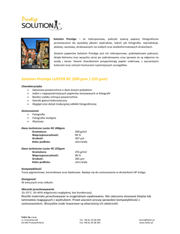 Solution Prestige – to mikroporowe, pokryte żywicą papiery fotograficzne przeznaczone do wysokiej jakości wydruków, takich jak fotografia, reprodukcje, plakaty, wystawy, drukowanych na małych oraz wielkoformatowych drukarkach. Atutem papierów Solution Prestige jest ich mikroporowe, polietylenowe pokrycie, dzięki któremu tusz wysycha zaraz po zadrukowaniu oraz sprawia że są odporne na wodę i tarcie. Swoim charakterem przypominają papier srebrowy, z wyrazistymi kolorami oraz ostrymi konturami najmniejszych szczegółów. Solution Prestige LUSTER RC (200 gsm / 255 gsm) Charakterystyka • Satynowa powierzchnia o dość dużym połyskiem • Jeden z najpopularniejszych papierów stosowanych w fotografii • Bardzo szybko schnąca powierzchnia • Szeroki gamut kolorystyczny • Wygląd oraz dotyk tradycyjnej odbitki fotograficznej Zastosowanie • Fotografia • Fotografia studyjna • Wystawy Dane techniczne Luster RC 200gsm Gramatura: Nieprzepuszczalność: Grubość: Kolor podłoża: 200 g/m2 94 % 207 μm ultra biały Dane techniczne Luster RC 255gsm Gramatura: Nieprzepuszczalność: Grubość: Kolor podłoża: 255 g/m2 96 % 265 μm ultra biały Kompatybilność Tusze pigmentowe, barwnikowe oraz lateksowe. Nadaje się do zastosowania w drukarkach HP Indigo. Dostępność W arkuszach oraz rolkach. Warunki przechowywania 15–25°C, 35–65% wilgotności względnej, bez kondensacji. Resztki materiału przechowywać w oryginalnym opakowaniu. Nie zalecamy stosować klejów lub laminatów reagujących z wydrukiem. Przed użyciem proszę sprawdzić kompatybilność z zastosowaniem. Wszystkie znaki towarowe są własnością ich właścicieli. Falter Sp. z o.o. ul. Poznańska 69 62-045 Pniewy/Poland Tel. +48 61 29 38 300 Fax +48 61 29 38 301 [email protected] www.falter.pl