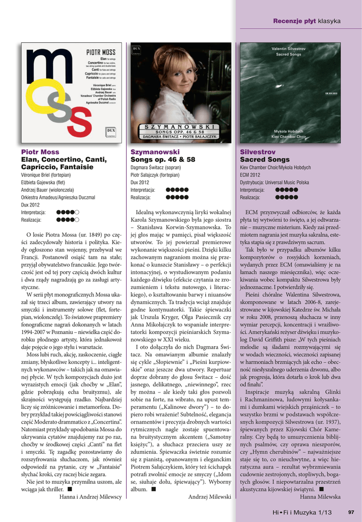 klasyka Piotr Moss Elan, Concertino, Canti, Capriccio, Fantaisie Szymanowski Songs op. 46 & 58 §§§§§ §§§§§ §§§§¨ §§§§¨ O losie Piotra Mossa (ur. 1849) po części zadecydowały historia i polityka. Kiedy ogłoszono stan wojenny, przebywał we Francji. Postanowił osiąść tam na stałe; przyjął obywatelstwo francuskie. Jego twórczość jest od tej pory częścią dwóch kultur i dwa rządy nagradzają go za zasługi artystyczne. W serii płyt monograficznych Mossa ukazał się trzeci album, zawierający utwory na smyczki i instrumenty solowe (flet, fortepian, wiolonczelę). To światowe prapremiery fonograficzne nagrań dokonanych w latach 1994-2007 w Poznaniu – niewielka część dorobku płodnego artysty, która jednakowoż daje pojęcie o jego stylu i warsztacie. Moss lubi ruch, akcję, zaskoczenie, ciągłe zmiany, błyskotliwe koncepty i... inteligentnych wykonawców – takich jak na omawianej płycie. W tych kompozycjach dużo jest wyrazistych emocji (jak choćby w „Elan”, gdzie pobrzękują echa bruityzmu), ale skrajności występują rzadko. Najbardziej liczy się zróżnicowanie i metamorfoza. Dobry przykład takiej powściągliwości stanowi część Moderato drammatico z „Concertina”. Natomiast przykłady upodobania Mossa do ukrywania cytatów znajdujemy raz po raz, choćby w środkowej części „Canti” na flet i smyczki. Tę zagadkę pozostawiamy do rozszyfrowania słuchaczom, jak również odpowiedź na pytanie, czy w „Fantaisie” słychać kroki, czy raczej bicie zegara. Nie jest to muzyka przymilna uszom, ale wciąga jak thriller. ■ Hanna i Andrzej Milewscy Idealną wykonawczynią liryki wokalnej Karola Szymanowskiego była jego siostra – Stanisława Korwin-Szymanowska. To jej głos mając w pamięci, pisał większość utworów. To jej powierzał premierowe wykonanie większości pieśni. Dzięki kilku zachowanym nagraniom można się przekonać o kunszcie Stanisławy – o perfekcji intonacyjnej, o wystudiowanym podaniu każdego dźwięku (efekcie czytania ze zrozumieniem i tekstu nutowego, i literackiego), o kształtowaniu barwy i niuansów dynamicznych. Ta tradycja wciąż znajduje godne kontynuatorki. Takie śpiewaczki jak Urszula Kryger, Olga Pasiecznik czy Anna Mikołajczyk to wspaniałe interpretatorki kompozycji pieśniarskich Szymanowskiego w XXI wieku. I oto dołączyła do nich Dagmara Świtacz. Na omawianym albumie znalazły się cykle „Słopiewnie” i „Pieśni kurpiowskie” oraz jeszcze dwa utwory. Repertuar doprze dobrany do głosu Świtacz – dość jasnego, delikatnego, „niewinnego”, rzec by można – ale kiedy taki głos pozwoli sobie na forte, na wibrato, na upust temperamentu („Kalinowe dwory”) – to dopiero robi wrażenie! Subtelność, elegancja ornamentów i precyzja drobnych wartości rytmicznych nagle zostaje spuentowana bruitystycznym akcentem („Samotny księżyc”), a słuchacz przeciera uszy ze zdumienia. Śpiewaczka świetnie rozumie się z pianistą, opanowanym i eleganckim Piotrem Sałajczykiem, który też ścichapęk potrafi zwolnić emocje ze smyczy („Idom se, siuhaje dołu, śpiewający”). Wyborny album. ■ Andrzej Milewski Silvestrov Sacred Songs §§§§§ §§§§§ ECM przyzwyczaił odbiorców, że każda płyta tej wytwórni to święto, a jej odtwarzanie – muzyczne misterium. Kiedy zaś przedmiotem nagrania jest muzyka sakralna, estetyka stapia się z prawdziwym sacrum. Tak było w przypadku albumów kilku kompozytorów o rosyjskich korzeniach, wydanych przez ECM (omawialiśmy je na łamach naszego miesięcznika), więc oczekiwania wobec kompaktu Silwestrowa były jednoznaczne. I potwierdziły się. Pieśni chóralne Walentina Silwestrowa, skomponowane w latach 2006-8, zarejestrowane w kijowskiej Katedrze św. Michała w roku 2008, przenoszą słuchacza w inny wymiar percepcji, koncentracji i wrażliwości. Amerykański reżyser dźwięku i muzykolog David Griffith pisze: „W tych pieśniach melodie są śladami rozmywającymi się w wodach wieczności, wieczności zapisanej w harmoniach brzmiących jak echo – obecność niesłyszalnego uderzenia dzwonu, albo jak progresja, która dotarła o krok lub dwa od finału”. Inspiracje muzyką sakralną Glinki i Rachmaninowa, ludowymi kołysankami i dumkami wiejskich prząśniczek – to wszystko brzmi w podstawach współczesnych kompozycji Silwestrowa (ur. 1937), śpiewanych przez Kijowski Chór Kameralny. Czy będą to umuzycznienia biblijnych psalmów, czy oprawa nieszporów, czy „Hymn cherubinów” – najważniejsze staje się to, co nieuchwytne, a więc hieratyczna aura – rezultat wybrzmiewania cudownie zestrojonych, stopliwych, bogatych głosów. I niepowtarzalna przestrzeń akustyczna kijowskiej świątyni. ■ Hanna Milewska 97 klasyka John Tilbury for Tomasz Sikorski John Tilbury §§§§§ §§§§§ I w oficjalnych publikacjach, i w prywatnych rozmowach nieustannie daje się wyczuć żal z powodu przedwczesnej śmierci Tomasza Sikorskiego (1939-88). Utalentowany kompozytor oraz pianista, uważany za jedynego prawdziwego polskiego sonorystę, za prawdziwie twórczego minimalistę, pozostawił dorobek nieprzerwanie oddziałujący na następne pokolenia muzyków. Płyta, o której tu mowa, jest przykładem niezwykłego hołdu dla pamięci artysty. Kompakt ma też wysmakowaną szatę graficzną. John Tilbury (ur. 1936), brytyjski pianista specjalizujący się w muzyce współczesnej, na początku lat 60. przebywał w Warszawie na stypendium. W klasie Zbigniewa Drzewieckiego poznał Tomasza Sikorskiego. Osobowość młodego muzyka, jak i późniejsze rzadkie kontakty musiały zrobić na Tilburym na tyle silne wrażenie, że po latach nie tylko postanowił nagrać kilka kompozycji Polaka, lecz również zarejestrować własną improwizację dedykowaną Sikorskiemu. Tilbury wybrał trzy utwory reprezentatywne dla dzieł na fortepian solo Sikorskiego – „Autograf ” (1980), „Rondo” (w oryginale 