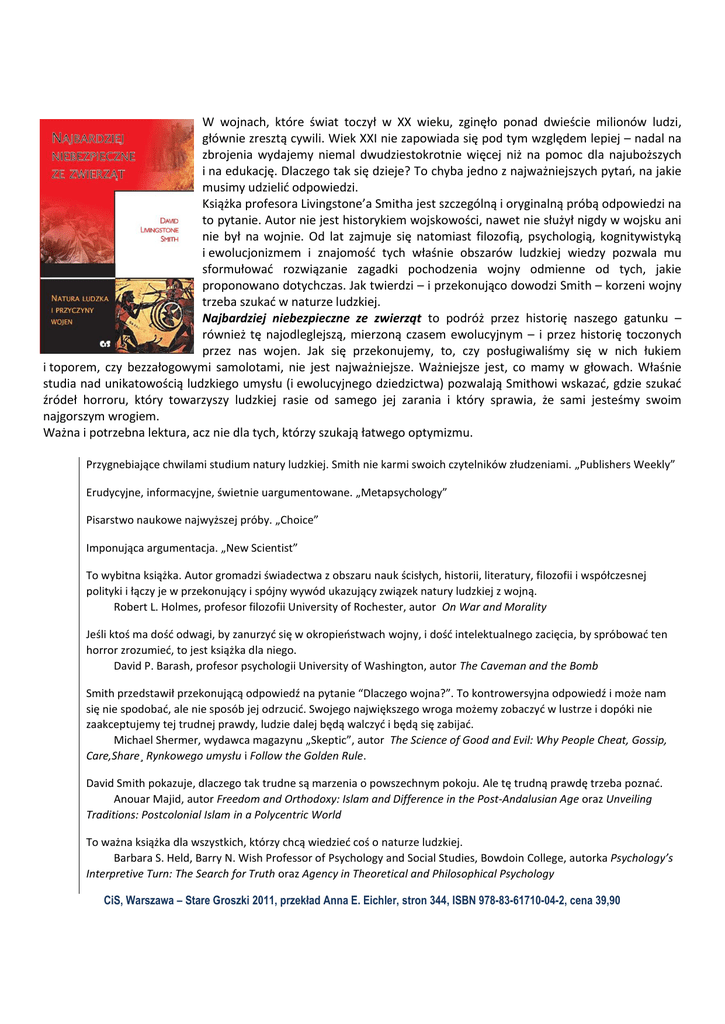 W wojnach, które świat toczył w XX wieku, zginęło ponad dwieście milionów ludzi, głównie zresztą cywili. Wiek XXI nie zapowiada się pod tym względem lepiej – nadal na zbrojenia wydajemy niemal dwudziestokrotnie więcej niż na pomoc dla najuboższych i na edukację. Dlaczego tak się dzieje? To chyba jedno z najważniejszych pytań, na jakie musimy udzielić odpowiedzi. Książka profesora Livingstone’a Smitha jest szczególną i oryginalną próbą odpowiedzi na to pytanie. Autor nie jest historykiem wojskowości, nawet nie służył nigdy w wojsku ani nie był na wojnie. Od lat zajmuje się natomiast filozofią, psychologią, kognitywistyką i ewolucjonizmem i znajomość tych właśnie obszarów ludzkiej wiedzy pozwala mu sformułować rozwiązanie zagadki pochodzenia wojny odmienne od tych, jakie proponowano dotychczas. Jak twierdzi – i przekonująco dowodzi Smith – korzeni wojny trzeba szukać w naturze ludzkiej. Najbardziej niebezpieczne ze zwierząt to podróż przez historię naszego gatunku – również tę najodleglejszą, mierzoną czasem ewolucyjnym – i przez historię toczonych przez nas wojen. Jak się przekonujemy, to, czy posługiwaliśmy się w nich łukiem i toporem, czy bezzałogowymi samolotami, nie jest najważniejsze. Ważniejsze jest, co mamy w głowach. Właśnie studia nad unikatowością ludzkiego umysłu (i ewolucyjnego dziedzictwa) pozwalają Smithowi wskazać, gdzie szukać źródeł horroru, który towarzyszy ludzkiej rasie od samego jej zarania i który sprawia, że sami jesteśmy swoim najgorszym wrogiem. Ważna i potrzebna lektura, acz nie dla tych, którzy szukają łatwego optymizmu. Przygnebiające chwilami studium natury ludzkiej. Smith nie karmi swoich czytelników złudzeniami. „Publishers Weekly” Erudycyjne, informacyjne, świetnie uargumentowane. „Metapsychology” Pisarstwo naukowe najwyższej próby. „Choice” Imponująca argumentacja. „New Scientist” To wybitna książka. Autor gromadzi świadectwa z obszaru nauk ścisłych, historii, literatury, filozofii i współczesnej polityki i łączy je w przekonujący i spójny wywód ukazujący związek natury ludzkiej z wojną. Robert L. Holmes, profesor filozofii University of Rochester, autor On War and Morality Jeśli ktoś ma dość odwagi, by zanurzyć się w okropieństwach wojny, i dość intelektualnego zacięcia, by spróbować ten horror zrozumieć, to jest książka dla niego. David P. Barash, profesor psychologii University of Washington, autor The Caveman and the Bomb Smith przedstawił przekonującą odpowiedź na pytanie “Dlaczego wojna?”. To kontrowersyjna odpowiedź i może nam się nie spodobać, ale nie sposób jej odrzucić. Swojego największego wroga możemy zobaczyć w lustrze i dopóki nie zaakceptujemy tej trudnej prawdy, ludzie dalej będą walczyć i będą się zabijać. Michael Shermer, wydawca magazynu „Skeptic”, autor The Science of Good and Evil: Why People Cheat, Gossip, Care,Share¸ Rynkowego umysłu i Follow the Golden Rule. David Smith pokazuje, dlaczego tak trudne są marzenia o powszechnym pokoju. Ale tę trudną prawdę trzeba poznać. Anouar Majid, autor Freedom and Orthodoxy: Islam and Difference in the Post-Andalusian Age oraz Unveiling Traditions: Postcolonial Islam in a Polycentric World To ważna książka dla wszystkich, którzy chcą wiedzieć coś o naturze ludzkiej. Barbara S. Held, Barry N. Wish Professor of Psychology and Social Studies, Bowdoin College, autorka Psychology’s Interpretive Turn: The Search for Truth oraz Agency in Theoretical and Philosophical Psychology CiS, Warszawa – Stare Groszki 2011, przekład Anna E. Eichler, stron 344, ISBN 978-83-61710-04-2, cena 39,90
