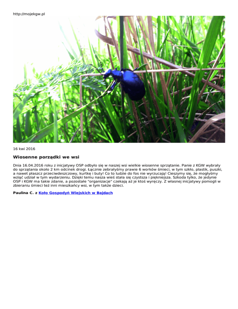 http://mojekgw.pl 16 kwi 2016 Wiosenne porządki we wsi Dnia 16.04.2016 roku z inicjatywy OSP odbyło się w naszej wsi wielkie wiosenne sprzątanie. Panie z KGW wybrały do sprzątania około 2 km odcinek drogi. Łącznie zebrałyśmy prawie 6 worków śmieci, w tym szkło, plastik, puszki, a nawet płaszcz przeciwdeszczowy, kurtkę i buty! Co to ludzie do fos nie wyrzucają! Cieszymy się, że mogłyśmy wziąć udział w tym wydarzeniu. Dzięki temu nasza wieś stała się czystsza i piękniejsza. Szkoda tylko, że jedynie OSP i KGW ma takie zdanie, a pozostałe "organizacje" czekają aż je ktoś wyręczy. Z własnej inicjatywy pomogli w zbieraniu śmieci też inni mieszkańcy wsi, w tym także dzieci. Paulina C. z Koło Gospodyń Wiejskich w Bajdach