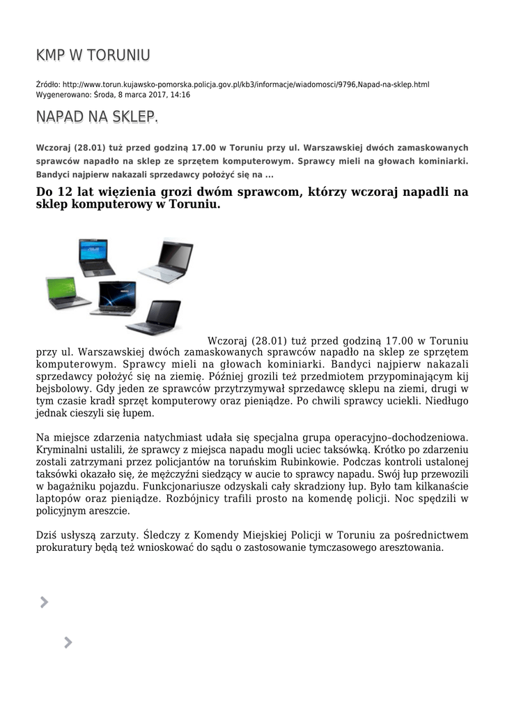 KMP W TORUNIU Źródło: http://www.torun.kujawsko-pomorska.policja.gov.pl/kb3/informacje/wiadomosci/9796,Napad-na-sklep.html Wygenerowano: Środa, 8 marca 2017, 14:16 NAPAD NA SKLEP. Wczoraj (28.01) tuż przed godziną 17.00 w Toruniu przy ul. Warszawskiej dwóch zamaskowanych sprawców napadło na sklep ze sprzętem komputerowym. Sprawcy mieli na głowach kominiarki. Bandyci najpierw nakazali sprzedawcy położyć się na ... Do 12 lat więzienia grozi dwóm sprawcom, którzy wczoraj napadli na sklep komputerowy w Toruniu. Wczoraj (28.01) tuż przed godziną 17.00 w Toruniu przy ul. Warszawskiej dwóch zamaskowanych sprawców napadło na sklep ze sprzętem komputerowym. Sprawcy mieli na głowach kominiarki. Bandyci najpierw nakazali sprzedawcy położyć się na ziemię. Później grozili też przedmiotem przypominającym kij bejsbolowy. Gdy jeden ze sprawców przytrzymywał sprzedawcę sklepu na ziemi, drugi w tym czasie kradł sprzęt komputerowy oraz pieniądze. Po chwili sprawcy uciekli. Niedługo jednak cieszyli się łupem. Na miejsce zdarzenia natychmiast udała się specjalna grupa operacyjno–dochodzeniowa. Kryminalni ustalili, że sprawcy z miejsca napadu mogli uciec taksówką. Krótko po zdarzeniu zostali zatrzymani przez policjantów na toruńskim Rubinkowie. Podczas kontroli ustalonej taksówki okazało się, że mężczyźni siedzący w aucie to sprawcy napadu. Swój łup przewozili w bagażniku pojazdu. Funkcjonariusze odzyskali cały skradziony łup. Było tam kilkanaście laptopów oraz pieniądze. Rozbójnicy trafili prosto na komendę policji. Noc spędzili w policyjnym areszcie. Dziś usłyszą zarzuty. Śledczy z Komendy Miejskiej Policji w Toruniu za pośrednictwem prokuratury będą też wnioskować do sądu o zastosowanie tymczasowego aresztowania. nadkom. Wioletta Dąbrowska mł. asp. Artur Rzepka KMP Toruń Zespół Komunikacji Społecznej Autor: torun Publikacja: torun Ocena: 0/5 (0) Tweetnij