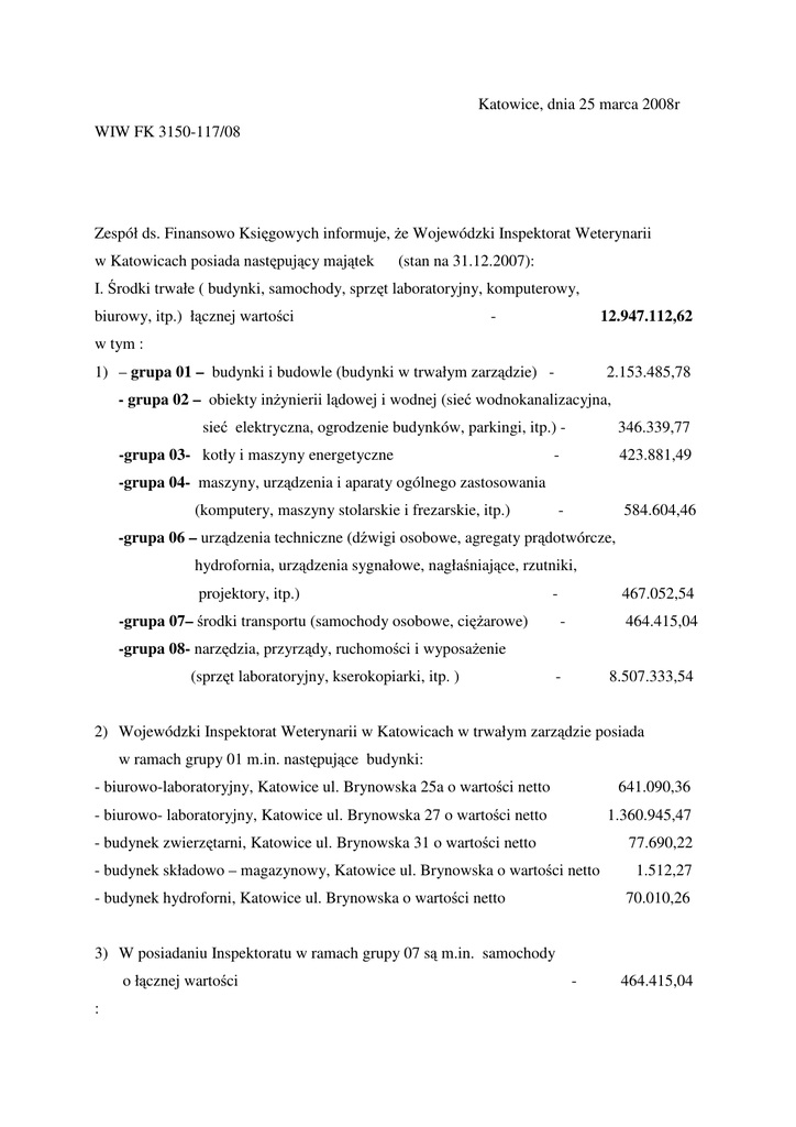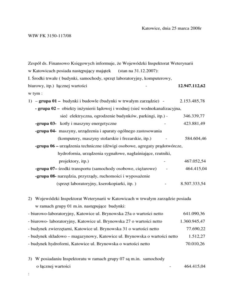 Katowice, dnia 25 marca 2008r WIW FK 3150-117/08 Zespół ds. Finansowo Księgowych informuje, że Wojewódzki Inspektorat Weterynarii w Katowicach posiada następujący majątek (stan na 31.12.2007): I. Środki trwałe ( budynki, samochody, sprzęt laboratoryjny, komputerowy, biurowy, itp.) łącznej wartości - 12.947.112,62 w tym : 1) – grupa 01 – budynki i budowle (budynki w trwałym zarządzie) - 2.153.485,78 - grupa 02 – obiekty inżynierii lądowej i wodnej (sieć wodnokanalizacyjna, sieć elektryczna, ogrodzenie budynków, parkingi, itp.) -grupa 03- kotły i maszyny energetyczne 346.339,77 - 423.881,49 - 584.604,46 -grupa 04- maszyny, urządzenia i aparaty ogólnego zastosowania (komputery, maszyny stolarskie i frezarskie, itp.) -grupa 06 – urządzenia techniczne (dźwigi osobowe, agregaty prądotwórcze, hydrofornia, urządzenia sygnałowe, nagłaśniające, rzutniki, projektory, itp.) - -grupa 07– środki transportu (samochody osobowe, ciężarowe) 467.052,54 - 464.415,04 - 8.507.333,54 -grupa 08- narzędzia, przyrządy, ruchomości i wyposażenie (sprzęt laboratoryjny, kserokopiarki, itp. ) 2) Wojewódzki Inspektorat Weterynarii w Katowicach w trwałym zarządzie posiada w ramach grupy 01 m.in. następujące budynki: - biurowo-laboratoryjny, Katowice ul. Brynowska 25a o wartości netto 641.090,36 - biurowo- laboratoryjny, Katowice ul. Brynowska 27 o wartości netto 1.360.945,47 - budynek zwierzętarni, Katowice ul. Brynowska 31 o wartości netto 77.690,22 - budynek składowo – magazynowy, Katowice ul. Brynowska o wartości netto - budynek hydroforni, Katowice ul. Brynowska o wartości netto 1.512,27 70.010,26 3) W posiadaniu Inspektoratu w ramach grupy 07 są m.in. samochody o łącznej wartości : - 464.415,04 - SAMOCHÓD TRANSPORTOWY RENAULT KANGOO- - SAMOCHÓD OSOBOWY NISSAN ALMERA- - SAMOCHÓD OSOBOWY TOYOTA AVENSIS- - SAMOCHÓD – CHŁODNIA – SEAT INCA- - PEUGEOT PARTNER – - PEUGEOT PARTNER- - PEUGEOT 807- II. Dla zapewnienia ciągłości pracy oraz sprawnej obsługi klientów pomieszczenia wyposażone są w meble laboratoryjne i biurowe oraz sprzęty o wartości 2.057.121,42 III. Ewidencja środków trwałych oraz pozostałych środków trwałych prowadzona jest w systemie komputerowym. Sporządził : A. Cich Sprawdził : Z. Czardyban