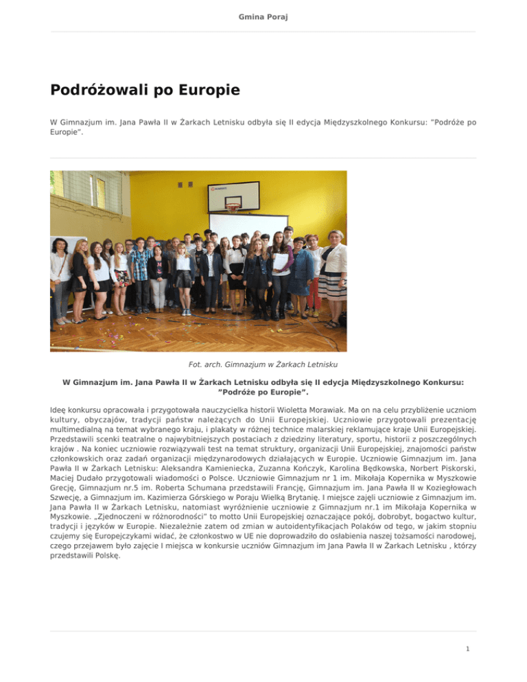 Gmina Poraj Podróżowali po Europie W Gimnazjum im. Jana Pawła II w Żarkach Letnisku odbyła się II edycja Międzyszkolnego Konkursu: ”Podróże po Europie”. Fot. arch. Gimnazjum w Żarkach Letnisku W Gimnazjum im. Jana Pawła II w Żarkach Letnisku odbyła się II edycja Międzyszkolnego Konkursu: ”Podróże po Europie”. Ideę konkursu opracowała i przygotowała nauczycielka historii Wioletta Morawiak. Ma on na celu przybliżenie uczniom kultury, obyczajów, tradycji państw należących do Unii Europejskiej. Uczniowie przygotowali prezentację multimedialną na temat wybranego kraju, i plakaty w różnej technice malarskiej reklamujące kraje Unii Europejskiej. Przedstawili scenki teatralne o najwybitniejszych postaciach z dziedziny literatury, sportu, historii z poszczególnych krajów . Na koniec uczniowie rozwiązywali test na temat struktury, organizacji Unii Europejskiej, znajomości państw członkowskich oraz zadań organizacji międzynarodowych działających w Europie. Uczniowie Gimnazjum im. Jana Pawła II w Żarkach Letnisku: Aleksandra Kamieniecka, Zuzanna Kończyk, Karolina Będkowska, Norbert Piskorski, Maciej Dudało przygotowali wiadomości o Polsce. Uczniowie Gimnazjum nr 1 im. Mikołaja Kopernika w Myszkowie Grecję, Gimnazjum nr.5 im. Roberta Schumana przedstawili Francję, Gimnazjum im. Jana Pawła II w Koziegłowach Szwecję, a Gimnazjum im. Kazimierza Górskiego w Poraju Wielką Brytanię. I miejsce zajęli uczniowie z Gimnazjum im. Jana Pawła II w Żarkach Letnisku, natomiast wyróżnienie uczniowie z Gimnazjum nr.1 im Mikołaja Kopernika w Myszkowie. „Zjednoczeni w różnorodności” to motto Unii Europejskiej oznaczające pokój, dobrobyt, bogactwo kultur, tradycji i języków w Europie. Niezależnie zatem od zmian w autoidentyfikacjach Polaków od tego, w jakim stopniu czujemy się Europejczykami widać, że członkostwo w UE nie doprowadziło do osłabienia naszej tożsamości narodowej, czego przejawem było zajęcie I miejsca w konkursie uczniów Gimnazjum im Jana Pawła II w Żarkach Letnisku , którzy przedstawili Polskę. 1