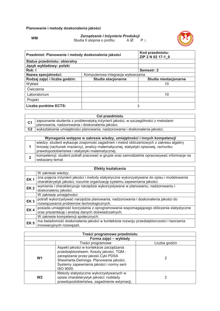 Planowanie i metody doskonalenia jako ci Zarz dzanie i In ynieria Produkcji Studia II stopnia o profilu: A P WM Kod przedmiotu: ZIP 2 N 02 17-1_0 Przedmiot: Planowanie i metody doskonalenia jako ci Status przedmiotu: obieralny J zyk wykładowy: polski Rok: I Nazwa specjalno ci: Rodzaj zaj i liczba godzin: Wykład wiczenia Laboratorium Projekt Liczba punktów ECTS: C1 C2 1 2 EK 1 EK 2 EK 3 EK 4 EK 5 Semestr: 2 Komputerowa integracja wytwarzania Studia stacjonarne Studia niestacjonarne 10 10 3 Cel przedmiotu zapoznanie studenta z problematyk in ynierii jako ci, w szczególno ci z metodami planowania, nadzorowania i doskonalenia jako ci. wykształcenie umiej tno ci planowania, nadzorowania i doskonalenia jako ci. Wymagania wst pne w zakresie wiedzy, umiej tno ci i innych kompetencji wiedzy: student wykazuje znajomo zagadnie i metod obliczeniowych z zakresu algebry liniowej (rachunek macierzy), analizy matematycznej, statystyki opisowej, rachunku prawdopodobie stwa i statystyki matematycznej. kompetencji: student potrafi pracowa w grupie oraz samodzielnie opracowywa informacje na wskazany temat Efekty kształcenia W zakresie wiedzy: zna poj cia in ynierii jako ci i metody statystyczne wykorzystywane do opisu i modelowania charakterystyk jako ci; rozumie organizacj systemu zapewniania jako ci. wymienia i charakteryzuje narz dzia wykorzystywane w planowaniu, nadzorowaniu i doskonaleniu jako ci. W zakresie umiej tno ci: potrafi wykorzystywa narz dzia planowania, nadzorowania i doskonalenia jako ci do rozwi zywania problemów technologicznych. posiada umiej tno korzystania z oprogramowania wspomagaj cego obliczenia statystyczne oraz prezentacj i analiz danych do wiadczalnych. W zakresie kompetencji społecznych: ma wiadomo doskonalenia jako ci w kontek cie rozwoju przedsi biorczo ci i tworzenia innowacyjnych rozwi za . W1 W2 Tre ci programowe przedmiotu Forma zaj – wykłady Tre ci programowe Aspekt jako ci w kontek cie zarz dzania przedsi biorstwem. Koszty jako ci. TQM zarz dzanie przez jako .Cykl PDSA Shewharta-Deminga. Planowanie jako ci. Systemy zapewniania jako ci i normy serii ISO 9000. Metody statystyczne wykorzystywanych w opisie charakterystyk jako ci: rozkłady prawdopodobie stwa, zagadnienie estymacji, Liczba godzin 2 2 W3 W4 W5 W6 W7 L1 L2 L3 L4 weryfikacja hipotez statystycznych: porównanie warto ci rednich i wariancji. Centralne twierdzenie graniczne. Przedziały ufno ci Charakterystyka podstawowych technik analizy, interpretacji i prezentacji wyników pomiarów wykorzystywanych w in ynierii jako ci – tzw. „magiczna siódemka”: histogram (wykaz), karty przebiegu, analiza Pareto, wykres przyczynowo-skutkowy Ishikawy, wykresy ramkowe, wykres rozrzutu, karty kontrolne – wprowadzenie. Charakterystyka zaawansowanych narz dzi in ynierii jako ci: planowanie jako ci – QFD „Dom jako ci”, analiza FMEA, DOE modelowanie empiryczne. Wykorzystanie narz dzi in ynierii jako ci w cyklu PDSA Shewharta-Deminga. Przykłady zastosowa . Wprowadzenie do statystycznej kontroli jako ci. Nadzorowanie procesu z zastosowaniem kart kontrolnych X/R. Interpretacja wyników kart kontrolnych – reguły WE. Zagadnienie statystycznego sterowania procesem. Zdolno procesu. Wybrane, liczbowe wska niki zdolno ci procesu. Odniesienie liczbowych wska ników zdolno ci do kart kontrolnych i poprawno ci prowadzenia procesu. Metodyka 6-SIGMA jako jeden ze sposobów sposób wdra ania statystycznych metod kontroli i doskonalenia jako ci procesów wytwórczych. Przykłady zastosowa . Suma godzin: Forma zaj – laboratoria Tre ci programowe Wprowadzenie do obsługi oprogramowania wspomagaj cego obliczenia statystyczne, prezentacje i analiz wyników pomiarów, wykorzystywanego w toku zaj . Statystyki opisowe. Podstawowe metody prezentacji i analizy wyników pomiarów. Zagadnienie estymacji parametrów rozkładu normalnego. Przedział ufno ci. Weryfikacja hipotez statystycznych. Zadania i problemy ilustruj ce zastosowanie metod statystycznych w rozwi zywaniu problemów in ynierii jako ci. Zastosowania elementarnych i zaawansowanych technik in ynierii jako ci: histogram (wykaz), karty przebiegu, analiza Pareto, wykres przyczynowo-skutkowy Ishikawy, wykresy ramkowe, wykres rozrzutu, analiza FMEA, planowanie jako ci – „Dom jako ci” Procedura kre lenia kart kontrolnych X/R. Interpretacja wyników kart kontrolnych. Dobór parametrów kart kontrolnych i ich wpływ na wiarygodno nadzorowania procesu. Przykłady wdro e kart kontrolnych. 1 1 2 1 1 10 Liczba godzin 1 2 1 2 L5 L6 L7 Zdolno procesu. Wska niki liczbowe zdolno ci – oszacowanie wska ników na podstawie histogramu i wyników kart kontrolnych. Wykresy wska ników zdolno ci. Interpretacja warto ci wska ników liczbowych i ich odniesienie do wyników kart kontrolnych. Wykorzystanie statystycznych metod kontroli i doskonalenia jako ci procesów do rozwi zania zada problemowych - projekt wdro enia metodyki 6 SIGMA. 1 1 Prezentacja i ocena wyników projektów 2 Suma godzin: 1 2 3 F1 F2 P1 Narz dzia dydaktyczne Wykład z prezentacj multimedialn . wiczenia laboratoryjne. Rozwi zywanie zada z wykorzystaniem oprogramowania wspomagaj cego obliczenia, analiz i prezentacj wyników bada do wiadczalnych. Projekt – praca indywidualna/praca w grupach. Sposoby oceny Ocena formuj ca Ocena poprawno ci rozwi zania projektu. Ocena poprawno ci wykonania poszczególnych wicze laboratoryjnych Ocena podsumowuj ca Ocena sumaryczna uwzgl dniaj ca oceny formuj ce (F1 i F2) oraz wynik kolokwium weryfikuj cego wiedz i umiej tno ci. Obci Forma aktywno ci Godziny kontaktowe z wykładowc Konsultacje, zaliczenie Przygotowanie si do laboratorium Wykonanie projektu Suma Sumaryczna liczba punktów ECTS dla przedmiotu 1 2 3 4 5 6 7 10 enie prac studenta rednia liczba godzin na zrealizowanie aktywno ci 20 2 26 27 75 3 Literatura podstawowa S. Płaska, D. Samociuk, „Systemy zapewniania jako ci formułowane przez normy ISO serii 9000”; Wydawnictwa Uczelniane Politechniki Lubelskiej, Lublin 1
