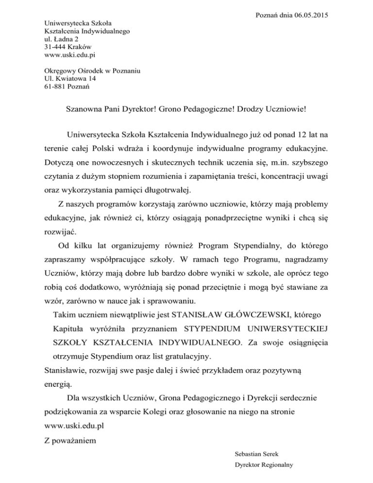 Poznań dnia 06.05.2015 Uniwersytecka Szkoła Kształcenia Indywidualnego ul. Ładna 2 31-444 Kraków www.uski.edu.pi Okręgowy Ośrodek w Poznaniu Ul. Kwiatowa 14 61-881 Poznań Szanowna Pani Dyrektor! Grono Pedagogiczne! Drodzy Uczniowie! Uniwersytecka Szkoła Kształcenia Indywidualnego już od ponad 12 lat na terenie całej Polski wdraża i koordynuje indywidualne programy edukacyjne. Dotyczą one nowoczesnych i skutecznych technik uczenia się, m.in. szybszego czytania z dużym stopniem rozumienia i zapamiętania treści, koncentracji uwagi oraz wykorzystania pamięci długotrwałej. Z naszych programów korzystają zarówno uczniowie, którzy mają problemy edukacyjne, jak również ci, którzy osiągają ponadprzeciętne wyniki i chcą się rozwijać. Od kilku lat organizujemy również Program Stypendialny, do którego zapraszamy współpracujące szkoły. W ramach tego Programu, nagradzamy Uczniów, którzy mają dobre lub bardzo dobre wyniki w szkole, ale oprócz tego robią coś dodatkowo, wyróżniają się ponad przeciętnie i mogą być stawiane za wzór, zarówno w nauce jak i sprawowaniu. Takim uczniem niewątpliwie jest STANISŁAW GŁÓWCZEWSKI, którego Kapituła wyróżniła przyznaniem STYPENDIUM UNIWERSYTECKIEJ SZKOŁY KSZTAŁCENIA INDYWIDUALNEGO. Za swoje osiągnięcia otrzymuje Stypendium oraz list gratulacyjny. Stanisławie, rozwijaj swe pasje dalej i świeć przykładem oraz pozytywną energią. Dla wszystkich Uczniów, Grona Pedagogicznego i Dyrekcji serdecznie podziękowania za wsparcie Kolegi oraz głosowanie na niego na stronie www.uski.edu.pl Z poważaniem Sebastian Serek Dyrektor Regionalny