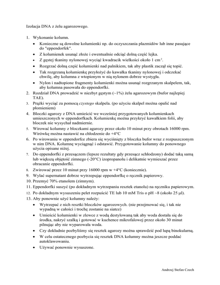 Izolacja DNA z żelu agarozowego. 1. Wykonanie kolumn. Konieczne są dowolne kolumienki np. do oczyszczania plazmidów lub inne pasujące do "eppendorfek". Z kolumienek usunąć złoże i ewentualnie odciąć dolną część lejka. Z gęstej tkaniny nylonowej wyciąć kwadracik wielkości około 1 cm 2. Rozgrzać dolną część kolumienki nad palnikiem, tak aby plastik zaczął się topić. Tak rozgrzaną kolumienkę przyłożyć do kawałka tkaniny nylonowej i odczekać chwilę, aby kolumna z wtopionym w nią nylonem dobrze wystygła. Nylon i nadtopione fragmenty kolumienki można usunąć rozgrzanym skalpelem, tak, aby kolumna pasowała do eppendorfki. 2. Rozdział DNA prowadzić w niezbyt gęstym (~1%) żelu agarozowym (bufor najlepiej TAE). 3. Prążki wyciąć za pomocą czystego skalpela. (po użyciu skalpel można opalić nad płomieniem) 4. Bloczki agarozy z DNA umieścić we wcześniej przygotowanych kolumienkach umieszczonych w eppendorfkach. Kolumienkę można przykryć kawałkiem folii, aby bloczek nie wysychał nadmiernie. 5. Wirować kolumny z bloczkami agarozy przez około 10 minut przy obrotach 16000 rpm. Wirówkę można nastawić na chłodzenie do +4C 6. Po wirowaniu w eppendorfce zbiera się wyciśnięty z bloczka bufor wraz z rozpuszczonym w nim DNA. Kolumnę wyciągnąć i odstawić. Przygotowanie kolumny do ponownego użycia opisane niżej. 7. Do eppendorfki z przesączem (lepsze rezultaty gdy przesącz schłodzony) dodać taką samą lub większą objętość zimnego (-20C) izopropanolu i delikatnie wymieszać przez obracanie eppendorfki. 8. Zwirować przez 10 minut przy 16000 rpm w +4C (koniecznie). 9. Wylać supernatant dobrze wytrzepując eppendorfkę o ręcznik papierowy. 10. Przemyć 70% etanolem (zimnym). 11. Eppendorfki suszyć (po dokładnym wytrzepaniu resztek etanolu) na ręczniku papierowym. 12. Po dokładnym wysuszeniu pelet rozpuścić TE lub 10 mM Tris o pH ~8 (około 25 l). 13. Aby ponownie użyć kolumny należy: Wytrzepać z nich resztki bloczków agarozowych. (nie przejmować się, i tak nie wypadną w całości i trochę zostanie na siatce) Umieścić kolumienki w zlewce z wodą destylowaną tak aby woda dostała się do środka, nakryć szalką i gotować w kuchence mikrofalowej przez około 30 minut pilnując aby nie wyparowała woda. Czy dokładnie pozbyliśmy się resztek agarozy można sprawdzić pod lupą binokularną. W celu ostatecznego pozbycia się resztek DNA kolumny można jeszcze poddać autoklawowaniu. Używać ponownie wysuszone. Andrzej Stefan Czech