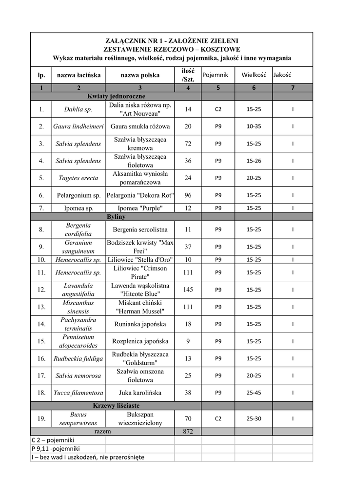 ZAŁĄCZNIK NR 1 - ZAŁOŻENIE ZIELENI ZESTAWIENIE RZECZOWO – KOSZTOWE Wykaz materiału roślinnego, wielkość, rodzaj pojemnika, jakość i inne wymagania lp. nazwa łacińska 1 2 1. nazwa polska 3 Kwiaty jednoroczne Dalia niska różowa np. Dahlia sp. "Art Nouveau" 2. Gaura lindheimeri 3. Salvia splendens 4. Salvia splendens 5. Tagetes erecta 6. Pelargonium sp. Pelargonia "Dekora Rot" 7. 8. 9. 10. 11. 12. 13. 14. 15. 16. 17. 18. Ipomea sp. Gaura smukła różowa Szałwia błyszcząca kremowa Szałwia błyszcząca fioletowa Aksamitka wyniosła pomarańczowa Ipomea "Purple" Byliny Bergenia Bergenia sercolistna cordifolia Geranium Bodziszek krwisty "Max sanguineum Frei" Hemerocallis sp. Liliowiec "Stella d'Oro" Liliowiec "Crimson Hemerocallis sp. Pirate" Lavandula Lawenda wąskolistna angustifolia "Hitcote Blue" Miscanthus Miskant chiński sinensis "Herman Mussel" Pachysandra Runianka japońska terminalis Pennisetum Rozplenica japońska alopecuroides Rudbekia błyszczaca Rudbeckia fuldiga "Goldsturm" Szałwia omszona Salvia nemorosa fioletowa Yucca filamentosa Juka karolińska Krzewy liściaste Buxus Bukszpan 19. semperwirens wieczniezielony razem C 2 – pojemniki P 9,11 -pojemniki I – bez wad i uszkodzeń, nie przerośnięte ilość /Szt. 4 Pojemnik Wielkość Jakość 5 6 7 14 C2 15-25 I 20 P9 10-35 I 72 P9 15-25 I 36 P9 15-26 I 24 P9 20-25 I 96 P9 15-25 I 12 P9 15-25 I 11 P9 15-25 I 37 P9 15-25 I 10 P9 15-25 I 111 P9 15-25 I 145 P9 15-25 I 111 P9 15-25 I 18 P9 15-25 I 9 P9 15-25 I 13 P9 15-25 I 25 P9 20-25 I 38 P9 25-45 I 70 C2 25-30 I 872 załacznik