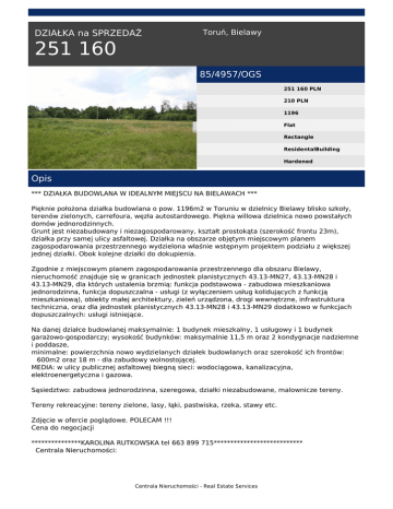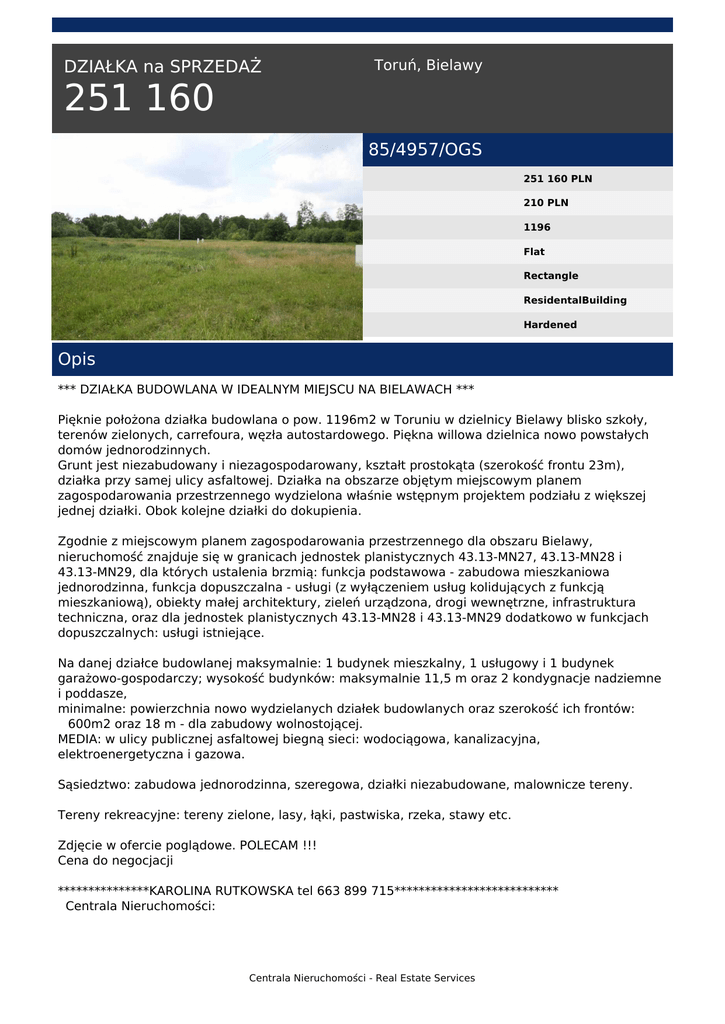 DZIAŁKA na SPRZEDAŻ Toruń, Bielawy 251 160 85/4957/OGS 251 160 PLN 210 PLN 1196 Flat Rectangle ResidentalBuilding Hardened Opis *** DZIAŁKA BUDOWLANA W IDEALNYM MIEJSCU NA BIELAWACH *** Pięknie położona działka budowlana o pow. 1196m2 w Toruniu w dzielnicy Bielawy blisko szkoły, terenów zielonych, carrefoura, węzła autostardowego. Piękna willowa dzielnica nowo powstałych domów jednorodzinnych. Grunt jest niezabudowany i niezagospodarowany, kształt prostokąta (szerokość frontu 23m), działka przy samej ulicy asfaltowej. Działka na obszarze objętym miejscowym planem zagospodarowania przestrzennego wydzielona właśnie wstępnym projektem podziału z większej jednej działki. Obok kolejne działki do dokupienia. Zgodnie z miejscowym planem zagospodarowania przestrzennego dla obszaru Bielawy, nieruchomość znajduje się w granicach jednostek planistycznych 43.13-MN27, 43.13-MN28 i 43.13-MN29, dla których ustalenia brzmią: funkcja podstawowa - zabudowa mieszkaniowa jednorodzinna, funkcja dopuszczalna - usługi (z wyłączeniem usług kolidujących z funkcją mieszkaniową), obiekty małej architektury, zieleń urządzona, drogi wewnętrzne, infrastruktura techniczna, oraz dla jednostek planistycznych 43.13-MN28 i 43.13-MN29 dodatkowo w funkcjach dopuszczalnych: usługi istniejące. Na danej działce budowlanej maksymalnie: 1 budynek mieszkalny, 1 usługowy i 1 budynek garażowo-gospodarczy; wysokość budynków: maksymalnie 11,5 m oraz 2 kondygnacje nadziemne i poddasze, minimalne: powierzchnia nowo wydzielanych działek budowlanych oraz szerokość ich frontów: −600m2 oraz 18 m - dla zabudowy wolnostojącej. MEDIA: w ulicy publicznej asfaltowej biegną sieci: wodociągowa, kanalizacyjna, elektroenergetyczna i gazowa. Sąsiedztwo: zabudowa jednorodzinna, szeregowa, działki niezabudowane, malownicze tereny. Tereny rekreacyjne: tereny zielone, lasy, łąki, pastwiska, rzeka, stawy etc. Zdjęcie w ofercie poglądowe. POLECAM !!! Cena do negocjacji ***************KAROLINA RUTKOWSKA tel 663 899 715*************************** Centrala Nieruchomości: Centrala Nieruchomości - Real Estate Services ZAPEWNIAMY BEZPŁATNE I PROFESJONALNE DORADZTWO ZARÓWNO W ZAKRESIE NIERUCHOMOŚCI JAK I POZYSKIWANIU POD NIE KREDYTÓW HIPOTECZNYCH Powyższe informacje zostały sporządzone na podstawie oświadczeń właścicieli i nie są ofertą w rozumieniu przepisów Kodeksu Cywilnego. Mają one jedynie charakter informacyjny. Większość naszych klientów pochodzi z polecenia - ZAUFAJ NAM I TY I NIE CZEKAJ, AŻ KTOŚ CIĘ WYPRZEDZI! Zadzwoń i umów się na prezentację ! Nr licencji pośrednika odpowiedzialnego za wykonanie umowy pośrednictwa 14260. zobacz inne nasze oferty na www.centralanieruchomosci.pl facebook.com/Centrala.N Karolina Rutkowska tel. (+48) 663 899 715 email: [email protected] Centrala Nieruchomości - Real Estate Services Powered by TCPDF (www.tcpdf.org)