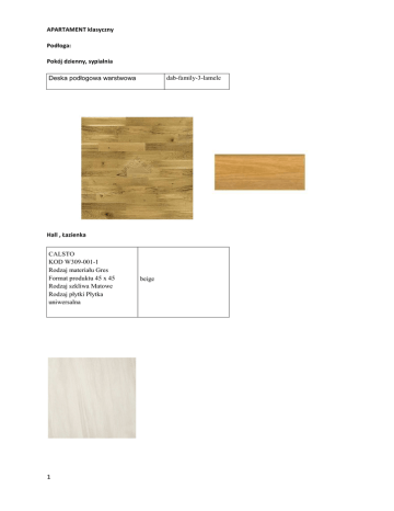 APARTAMENT klasyczny Podłoga: Pokój dzienny, sypialnia Deska podłogowa warstwowa dab-family-3-lamele Hall , Łazienka CALSTO KOD W309-001-1 Rodzaj materiału Gres Format produktu 45 x 45 Rodzaj szkliwa Matowe Rodzaj płytki Płytka uniwersalna 1 beige Kolory ścian- dekoracje ścienne Pokój dzienny Farba lateksowa matowa ; jasnobeżowa, beżowa Stegu California 1 desert krem SYPIALNIA Farba lateksowa matowa ; jasnobeżowa, beżowa Farba lateksowa matowa ; jasnobeżowa, beżowa 2 Półpalisada LM Półpalisada marrone sobex 250/3,5/7 tapeta-pouf Szerokość: 53 cm Rodzaj: winylowa na flizelinie Nr referencyjny: 43516690 Hall Farba lateksowa matowa ; jasnobeżowa, beżowa 3 Półpalisada Stegu Półpalisada marrone sobex 250/3,5/7 California 1 desert Stolarka: Sempre onda w07 4 Silkstone Sempre Onda W07 dab polski Meble Pokój dzienny: meble bogart komoda dover 12 Szerokość 149 cm Głębokość 42 cm Wysokość 89 cm wisnia promavera meble bogart Półka Dover 03 wisząca przeszklona Szerokość 100 cm Głębokość 26 cm Wysokość 43 cm wisnia promavera 5 meble bogart stolik dover 41 70/70/45 wisnia promavera Meble bogart Narożnik ewelina 245/155/80 pow sp. 200/143 z 1 półką wyższą Mineva 3 6 Pufa Bizon 51/51/46 Mineva 3 meble bogart stól dover 42 90/120/90/75 wisnia promavera halmar k149 beżowe Em 7 Zegar lingua 51/51/5 arte Dywan Agnella Amareno Ara kremowy, brązowy, brą rdzawy, Koral 160x230 czarny,, oliwkowy Dywan Balta Julia 31024 500 160x230 Fotodruk.pl 8 jasny beż Obraz płótno canvas canv sosnowe krosno 3d, wernikss mat 120/70 różne zdjęcia Kuchnia Blat i widoczny bok szafki dolnej na 205/60 cm Rtv/agd Rtv/agd 9 Montelli basic 365,5/76 cm Kolor ivory 231 ZLEW GRANITOWY FRANKE EUROFORM EFG 614-78 FRAGRANIT bez Kuchenna franke | nr kat. 118466 beżoy bahia Sypialnia MEBLE BOGART MEBLE BOGART 10 Łóżko Dover 76 Szerokość 165 cm Głębokość 207 cm Wysokość 89/44 cm wiśnia primavera Szerokość 149 cm Głębokość 61 cm Wysokość 194 cm dover 23 wiśnia primavera BRW Szafka nocna: ORIENT-KOM1S Gł 35,5 cm /Szer 58 cm/ Wys 37,5 cm EM Stolik Servi .46/46/wys 51 LM Dywan LUCCA INSPIRE Wymiary: 60 x 120 cm Skład: 100% poliester czekladowy Jysk Koc letizia 140x200cm mokka czarny 11 JABŁOŃ PLATO biały jysk Poduszka ozd. JENA 40x60cm brązowa 40 Hall JYSK Pufa AJSTRUP krem skóra ekologiczna kremowa Wieszak umbra sticks multi Czarny 12 brązowa Oświetlenie Pokój dzienny Lampa sufitowa plafon Lampa zwis Kinkiety Lipo ceiling light 55618 05 10 miedź Lampa wisząca ALICE I M coffee 3465 Nowodvorski beżowa żowa Lipo spot 55610 05 10 . beż Sypialnia em/massive Kinkiet ISLAND incl.1xG9 40W . wenge + chrom em/massive Lampa listwa chrom ISLAND wenge 3xG9 wenge + chrom Hall EM/MASSIVE 13 Massive Lipo 55612/05/10 patyna, miedź Łazienka Kinkiet/ halogeny Półka g/k pod sufitem + 4 szt oprawka halogenowa kwadrat ohk15 matowy chrom .(kobi) Oświetlenie sufitowe Paulmann nn falima plafon ip44 max.60w e27 chrom/opal (70301) Łazienka Sanotechnik Brodzik akrylowy prostokątny 80x120 cm p128 Sanotechnik Kabina prysznicowa narożna profil chrom 80x120x185cm b16c Cersanit Como 80 kod k32-004-box otwór na baterię centralny sposób montażu meblowa szerokość [mm] 800 głębokość [mm] 450 Cersanit Facile kod k30-010 k30 szerokość [mm] 355 głębokość [mm] 525 14 Geberit Duofix basic Geberit Delta 50 115.135.21.1 Cersanit Facile kod k98-0067 k98 sposób zamykania wolnoopadająca tworzywo duroplast Okładziny ścienne bazowa 1 Okładziny podłogowe Dekory 1 Dekory drewnopododbny 15 Cersanit Cersanit Cersanit Cersanit Bianca kod w185-002-1 rodzaj materiału monoporosa format produktu 29,7 x 60 rodzaj szkliwa matowe rodzaj płytki płytka bazowa ścienna Biały mat BRISTO KOD W311-001-1 Rodzaj materiału Gres Format produktu 45 x 45 Rodzaj szkliwa Matowe Rodzaj płytki Płytka uniwersalna GREY CALSTO KOD W309-001-1 Rodzaj materiału Gres Format produktu 45 x 45 Rodzaj szkliwa Matowe Rodzaj płytki Płytka uniwersalna beige ANCONA KOD W218-016-1 Rodzaj materiału Gres Format produktu 14,4 x 59,3 Rodzaj szkliwa Matowe Rodzaj płytki Płytka uniwersalna ochra Wieszak na szlafroki Tiger Items Tiger items haczyk duży - chrom (284603) Uchwyt na papier Tiger Items Wieszak na papier toaletowy - stal szczotkowana - 284009. Szczotka wc Tiger Items Tiger items szczotka wc - chrom - 284903 Reling na ręczniki Tiger Items Tiger items wieszak na ręcznik kąpielowy chrom (283603) 16 Bateria umywalkowa dn15 grohe eurosmart cosmopolitan 32825 000 Chrom Bateria prysznicowa jednouchwytowa ścienna grohe eurosmart cosmopolitan 32837 000 Chrom Zestaw prysznicowy chrom trio grohe tempesta cosmopolitan 27579 000 Chrom Dekoracje okien Jysk Zasłona varpen 140/245 Krem Jysk Firana marisko 280x245 1 szt Biała JYSK Zasłona ANTEN 1x140x245cm 2 BEŻOWA SZT 17 18
