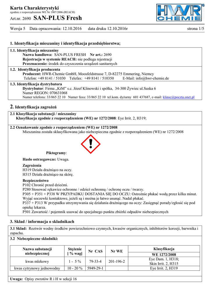 Karta Charakterystyki zgodnie z rozporządzeniem WE Nr 1907/2006 (REACH) Art.nr. 2690 Wersja 5 SAN-PLUS Fresh Data opracowania: 12.10.2016 data druku 12.10.2016r strona 1/5 1. Identyfikacja mieszaniny i identyfikacja przedsiębiorstwa; 1.1. Identyfikacja mieszaniny Nazwa handlowa: SAN-PLUS FRESH Nr art.: 2690 Rejestracja w systemie REACH: nie podlega rejestracji Przeznaczenie: środek do czyszczenia urządzeń sanitarnych 1.2. Identyfikacja producenta Producent: HWR-Chemie GmbH, Moosfeldstrasse 7, D-82275 Emmering, Niemcy Telefon: +49 8141 / 51030 Telefax: +49 8141 / 510350 E-Mail: [email protected] 1.3. Identyfikacja dystrybutora Dystrybutor: Firma „KiM” s.c. Józef Klinowski i spółka, 34-300 Żywiec ul.Suska 6 Numer REGON: 070631068 Numer telefonu: 33/865 22 10 Numer faxu: 33/865 22 10 tel.kom. dyżurny 601 437687, e-mail: [email protected] 2. Identyfikacja zagrożeń 2.1 Klasyfikacja substancji / mieszaniny Klasyfikacja zgodnie z rozporządzeniem (WE) nr 1272/2008: Eye Irrit. 2, H319; 2.2 Oznakowanie zgodnie z rozporządzeniem (WE) nr 1272/2008 Mieszanina została sklasyfikowana jako niebezpieczna zgodnie z rozporządzeniem (WE) nr 1272/2008 Piktogramy: Hasło ostrzegawcze: Uwaga. Zagrożenia H319 Działa drażniąco na oczy. H315 Działa drażniąco na skórę. Bezpieczeństwo P102 Chronić przed dziećmi. P280 Stosować rękawice ochronne / odzież ochronną / ochronę oczu / twarzy. P305 + P351 + P338 W PRZYPADKU DOSTANIA SIĘ DO OCZU: Ostrożnie płukać wodą przez kilka minut. Wyjąć soczewki kontaktowe, jeżeli są i można je łatwo usunąć. Nadal płukać. P337 + P313 W przypadku utrzymywania się działania drażniącego na oczy: Zasięgnąć porady/zgłosić się pod opiekę lekarza. P501 Zawartość / pojemnik usuwać do specjalnego punktu zbiórki odpadów niebezpiecznych 3. Skład / informacja o składnikach 3.1 Skład: Roztwór wodny środków powierzchniowo czynnych, kwasów organicznych, inhibitorów korozji, barwnika i zapachu. 3.2 Niebezpieczne składniki: Nazwa substancji niebezpiecznej Stężenie [ % wag] Nr CAS Nr WE kwas mlekowy 1- 5% 79-33-4 201-196-2 kwas cytrynowy jednowodny 10 - 20 % 5949-29-1 Uwaga: Opisy zwrotów R i H w sekcji 16 Klasyfikacja WE 1272/2008 Eye Dam. 1, H318; Skin Irrit. 2, H315 Eye Irrit. 2, H319 Karta Charakterystyki zgodnie z rozporządzeniem WE Nr 1907/2006 (REACH) Art.nr. 2690 SAN-PLUS Fresh Wersja 5 Data opracowania: 12.10.2016 data druku 12.10.2016r strona 2/5 4. Pierwsza pomoc Informacje ogólne: W razie wątpliwości lub jeśli objawy występują, zasięgnąć porady lekarza Wdychanie: Osobie zapewnić dopływ świeżego powietrza. Kontakt ze skórą: Dokładnie spłukać wodą, Kontakt z oczami: W przypadku dostania się do oczu, należy przepłukać dużą ilością wody i w razie potrzeby skontaktować się z lekarzem. Spożycie: W razie połknięcia wypić dużą ilość wody, nie wywoływać wymiotów, natychmiast skontaktować się z lekarzem 5. Postępowanie w przypadku pożaru Odpowiednie środki gaśnicze: Rozproszony strumień wody/piana/CO2/suche środki gaśnicze Narażenie na sam produkt, jego produkty spalania lub gazy: nie znane Specjalne wyposażenie ochronne dla strażaków: nie wymagane 6. Postępowanie w przypadku niezamierzonego uwolnienia do środowiska Osobiste środki ostrożności: Unikać kontaktu z oczami i skórą Środki ochrony środowiska: Przy wycieku większych ilości, zatamować. Nie dopuścić do przedostania się nierozcieńczonego koncentratu do kanalizacji. Metoda oczyszczania: Zebrać za pomocą środka wiążącego płynne substancje (np.sorbent) i usunąć zgodnie z obowiązującymi. Można neutralizować za pomocą sody (tylko specjaliści). Odniesienia do innych sekcji Sprawdź środki ochronne w sekcjach 7 i 8 7. Postępowanie z mieszaniną i jej magazynowanie 7.1 Postępowanie z mieszaniną: . Wskazówki dla bezpiecznego użytkowania: Unikać kontaktu z oczami, skórą i ubraniem Środki ostrożności przed pożarem i wybuchem: Produkt nie jest łatwopalny 7.2 Magazynowanie: Przechowywać w oryginalnych szczelnie zamkniętych pojemnikach w chłodnym i suchym pomieszczeniu. 7.3 Wymagania wobec pomieszczeń magazynowych i pojemników Nie ma żadnych szczególnych zaleceń 8. Kontrola narażenia i środki ochrony indywidualnej 8.1 Wartości graniczne narażenia: Nie zawiera żadnych substancji, dla których są ustanowione dopuszczalne stężenia. 8.2 Kontrola narażenia w miejscu pracy: Patrz rozdział 7. Środki specjalne nie są konieczne 8.3 Środki ochrony osobistej: Ochrona dróg oddechowych: niewymagana Ochrona rąk: zalecane rękawice ochronne z NR, Cr, NBR, butylu, FKM albo PCW Ochrona oczu: zalecane okulary ochronne Ochrona skóry: zwykła odzież robocza 8.4 Wskazania ogólne: Umyć ręce przed przerwą w pracy i po zakończeniu pracy.. 8.5 Ograniczenie i kontrola ekspozycji środowiska : Patrz punkty 6 i 7 Karta Charakterystyki zgodnie z rozporządzeniem WE Nr 1907/2006 (REACH) Art.nr. 2690 SAN-PLUS Fresh Wersja 5 Data opracowania: 12.10.2016 data druku 12.10.2016r strona 3/5 9. Właściwości fizyczne i chemiczne Informacje ogólne Wygląd Ciecz Żółty Perfumowany Informacje ważne dla zdrowia, bezpieczeństwa oraz środowiska Ok. 1,2 pH koncentrat Ok. 3,1 pH roztwór(1%) 0 Ok.-10 Temperatura krzepnięcia w ( C) Ok.100 Temperatura wrzenia/zakres temp. wrzenia w (0C) 0 nie ma Temperatura zapłonu w ( C) 0 nie występuje Temperatura samozapłonu w ( C) Ok. 23 Prężność par [hPa] 3 0 Gęstość [g/cm ] w temp.20 C Ok.1,085 Rozpuszczalność Rozpuszczalny Rozpuszczalność w wodzie Praktycznie nierozpuszczalny Rozpuszczalność w innych rozpuszczalnikach 0 Lepkość dynamiczna [mPa s] w temp.20 C < 10 Inne informacje Inne dane fizyczne i chemiczne nie zostały określone. Rodzaj: Kolor: Zapach: 10. Stabilność i reaktywność 10.1 Reaktywność; Brak rozkładu w przypadku przechowywania i stosowania 10.2 Stabilność chemiczna ; Stabilny w normalnych warunkach 10.3 Mo