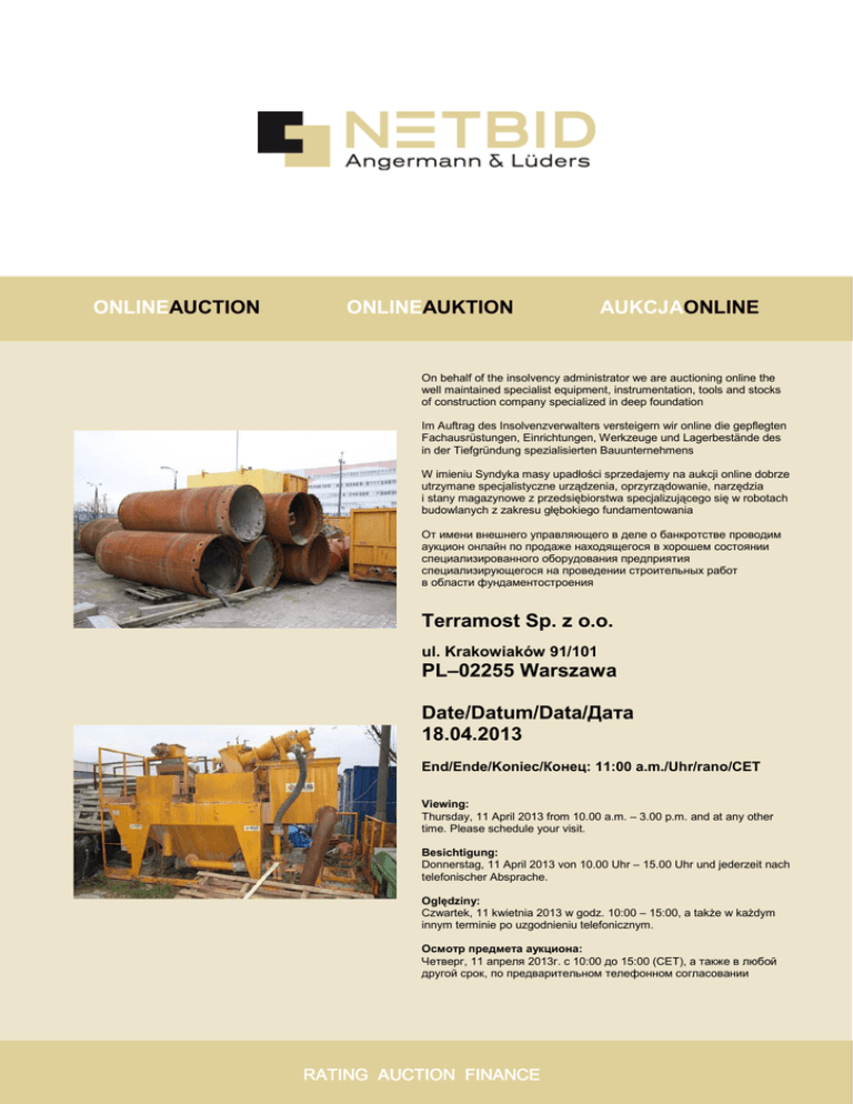 ONLINEAUCTION ONLINEAUKTION AUKCJAONLINE On behalf of the insolvency administrator we are auctioning online the well maintained specialist equipment, instrumentation, tools and stocks of construction company specialized in deep foundation Im Auftrag des Insolvenzverwalters versteigern wir online die gepflegten Fachausrüstungen, Einrichtungen, Werkzeuge und Lagerbestände des in der Tiefgründung spezialisierten Bauunternehmens W imieniu Syndyka masy upadłości sprzedajemy na aukcji online dobrze utrzymane specjalistyczne urządzenia, oprzyrządowanie, narzędzia i stany magazynowe z przedsiębiorstwa specjalizującego się w robotach budowlanych z zakresu głębokiego fundamentowania От имени внешнего управляющего в деле о банкротстве проводим аукцион онлайн по продаже находящегося в хорошем состоянии специализированного оборудования предприятия специализирующегося на проведении строительных работ в области фундаментостроения Terramost Sp. z o.o. ul. Krakowiaków 91/101 PL–02255 Warszawa Date/Datum/Data/Дата 18.04.2013 End/Ende/Koniec/Конец: 11:00 a.m./Uhr/rano/CET Viewing: Thursday, 11 April 2013 from 10.00 a.m. – 3.00 p.m. and at any other time. Please schedule your visit. Besichtigung: Donnerstag, 11 April 2013 von 10.00 Uhr – 15.00 Uhr und jederzeit nach telefonischer Absprache. Oględziny: Czwartek, 11 kwietnia 2013 w godz. 10:00 – 15:00, a takŜe w kaŜdym innym terminie po uzgodnieniu telefonicznym. Осмотр предмета аукциона: Четверг, 11 апреля 2013г. с 10:00 до 15:00 (CET), а также в любой другой срок, по предварительном телефонном согласовании www.netbid.com • [email protected] 11 RATING AUCTION FINANCE Angermann & Lüders Polska Sp. z o. o. Tel.: (+48 22) 636 02 70 / 636 36 97 X12705-1 Equipment for diaphragm walls The block position containing items from X12705-2 to X12705-3 X12705-30 2 Fuel tanks 1000 l with fuel pump X12705-31 8 warehouse containers with equipment, including: • 7 welders, • 6 electrical heaters, • 2 baskets for gas cylinders, • cut-off machine PICLE 1, • 4 optical levelling instruments, • 2 submersible pumps, • high-pressure cleaner, make Karcher, • 9 wardrobes, type Sum 420e, • workshop body for commercial vehicle, • extension cords and electrical wires, • aluminium cable 4x502 about 60m • lifting ropes, slings, ropes, thimbles, shackles • power tools and small equipment X12705-2 14 Stop End elements 800 mm, make SIP&T, L 3 do 12 m, 6 starter elements 800 mm, 4 lifting heads 800 mm, cleaning chisel 800 mm, 120 mb rodes for Stop End elements X12705-3 14 Stop End elements 600 mm, make SIP&T, L 3 - 12 m, 8 starter elements 600 mm, 8 lifting heads 600 mm, 2 cleaning chisels 600 mm, 4 platform suspension jigs 600 – 1200 mm, chisel X12705-10 10 Double wall casings Ø 1800/1700 mm, make SIP&T, L 2 - 5 m, cutting shoe Ø 1800/1700 mm, L 1 m, cutting shoe Ø 1800/1700 mm, L 0.5 m, double bottom bucket for soil Ø 1670 mm, soil auger Ø 1670 mm, twister (drive adaptor) for double wall casing Ø 1800/1700 mm X12705-33 Spare parts for desander Gosag X12705-12 Desander, make Gosag, type C-33/6, man. 2008 X12705-35 Rubber seals for slurry walls, L 25 m, make SIP&T X12705-14 Desander, make Gosag, type C-33/6, man. 2005, damaged X12705-38 Wooden beams 120 x 120 mm (scantling) X12705-17 Pump unit, make BAUER, type BP-125, man. 2008 X12705-39 8 switching stations, 2 measuring attachements X12705-20 Pump unit, make Selwood, type C100, man. 2003 X12705-40 Bentonite X12705-26 30 Aluminum pipes Ø 108 mm, L 6 m, 10 aluminum pipes Ø 108 mm, L 1 m, pipe fittings Ø 108 mm: elbows, three-wayadapters, valves, ends, 4 hoses for bentonite suspension 4", make Melisse, L 50 m, joints for hoses, make Vaindusa, Seals Ø 108 mm for aluminium pipes, make Klaudia X12705-41 Liebherr 855 crane cabin (damaged) X12705-27 25 Tremie pipes Ø 219 mm, L 1 - 3 m, 2 pipe shoes Ø 219 mm, L 3 m, 3 hoppers Ø 219 mm, 3 swivels Ø 219 mm, suspension jig Online item numbers: X12705-1 – X12705-41 Online bidding is possible immediately on www.netbid.com Please contact us for dismantling and transport www.netbid.com • [email protected] 2 Angermann & Lüders Polska Sp. z o. o. Tel.: (+48 22) 636 02 70 / 636 36 97 Confirmation / Potwierdzenie bankowe The undersigned bank herewith confirms that the customer named below has sufficient funds on its account(s) to pay the specified amount. / NiŜej podpisany bank potwierdza, Ŝe niniejszy klient jest wypłacalny i dysponuje podaną poniŜej kwotą. This letter serves solely as confirmation of the customer's financial standing. It does not constitute any direct liability on the part of the bank. / Niniejsze potwierdzenie stanowi wyłącznie dowód wypłacalności klienta. Jakakolwiek bezpośrednia odpowiedzialność banku jest wykluczona. _______________________________________ NetBid User name / Nazwa uŜytkownika NetBid _______________________________________ Account holder / Właściciel konta _______________________________________ E-mail address / Adres E-mail _______________________________________ Account no. / Numer konta _______________________________________ Amount in € / Kwota w € ______________________________________ Place, date / Miejscowość, data _______________________________________ Amount in words / Kwota słownie _______________________________________ Signature of account holder / Podpis właściciela konta _______________________________________ Bank / Bank _______________________________________ Stamp/signature of bank / Pieczątka/podpis banku _______________________________________ Bank code / Kod banku Please send this confirmation via fax or e-mail. / Prosimy wysłać
