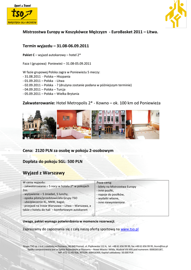 Mistrzostwa Europy w Koszykówce Mężczyzn - EuroBasket 2011 – Litwa. Termin wyjazdu – 31.08-06.09.2011 Pakiet C – wyjazd autokarowy – hotel 2* Faza I (grupowa) Poniewież – 31.08-05.09.2011 W fazie grupowej Polska zagra w Poniewieżu 5 meczy: - 31.08.2011 - Polska – Hiszpania - 01.09.2011 – Polska - Litwa - 02.09.2011 – Polska - ? (drużyna zostanie podana w późniejszym terminie) - 04.09.2011 – Polska – Turcja - 05.09.2011 – Polska – Wielka Brytania Zakwaterowanie: Hotel Metropolis 2* - Kowno – ok. 100 km od Poniewieża Cena: 2120 PLN za osobę w pokoju 2-osobowym Dopłata do pokoju SGL: 500 PLN Wyjazd z Warszawy W cenie wyjazdu: - zakwaterowanie – 5 nocy w hotelu 2* w pokojach 2os. - wyżywienie – 5 śniadao, 5 lunchy, - opieka pilota/przedstawiciela Grupy TSO - ubezpieczenie KL, NNW, bagaż, - przejazd na trasie Warszawa – Litwa – Warszawa, a także z hotelu do hali – komfortowym autokarem Poza ceną: - bilety na Mistrzostwa Europy - inne posiłki, - napoje do posiłków, - wydatki własne, - inne niewymienione Uwaga, pakiet wymaga potwierdzenia w momencie rezerwacji. Zapraszamy do zapoznania się z całą naszą ofertą sportową na www.tso.pl Grupa TSO sp. z o.o. z siedzibą w Poznaniu, 60-649 Poznao, ul. Piątkowska 112 A, tel. +48 61 656 99 99, fax +48 61 656 99 95, [email protected] Spółka zarejestrowana jest w Sądzie Rejonowym w Poznaniu – Nowe Miasto i Wilda, Wydział VIII KRS pod numerem: 0000265187, NIP: 972-11-45-928, REGON: 300416369, Kapitał zakładowy: 50.000 PLN Ramowy program wyjazdu: Dzień 1 – 31.08.2011 Spotkanie z pilotem na miejscu zbiórki w Warszawie. Rozdanie dokumentów podróży i wyjazd do Poniewieża. Po drodze planowane są postoje. Przyjazd pod halę w Poniewieżu. Mecze Litwa – Wielka Brytania , Turcja - ? i Polska - Hiszpania. Po meczach, przejazd do hotelu w Kownie (ok. 100 km od Poniewieża), zakwaterowanie. Nocleg. Dzień 2 – 01.09.2011 Rano, czas do własnej dyspozycji, np. na zwiedzanie Kowna. Około 12.00 lunch w hotelu. Ok.13.00 wyjazd do Poniewieża. Mecze Polska – Litwa, ? - Hiszpania i Wielka Brytania – Turcja. Po meczach, przejazd do hotelu w Kownie (ok. 100 km od Poniewieża). Nocleg. Dzień 3 – 02.09.2011 Rano, czas do własnej dyspozycji, np. na zwiedzanie Kowna. Około 12.00 lunch w hotelu. Ok.13.00 wyjazd do Poniewieża. Mecze ? – Polska, Turcja – Litwa i Hiszpania - Wielka Brytania. Po meczach, przejazd do hotelu w Kownie (ok. 100 km od Poniewieża). Nocleg. Dzień 4 – 03.09.2011 Dzieo do własnej dyspozycji, np. na zwiedzanie Kowna. Około 13.00 lunch w hotelu. Nocleg. Dzień 5 – 04.09.2011 Rano, czas do własnej dyspozycji, np. na zwiedzanie Kowna. Około 12.00 lunch w hotelu. Ok.13.00 wyjazd do Poniewieża. Mecze Polska – Turcja, Wielka Brytania - ? i Litwa – Hiszpania. Po meczach, przejazd do hotelu w Kownie (ok. 100 km od Poniewieża). Nocleg. Dzień 6 – 05.09.2011/06.09.2011 Rano, czas do własnej dyspozycji, np. na zwiedzanie Kowna. Około 12.00 wykwaterowanie i lunch w hotelu. Ok.13.00 wyjazd do Poniewieża. Mecze Polska – Wielka Brytania, Hiszpania – Turcja, ? - Litwa. Po meczach, wyjazd w stronę Polski Po drodze planowane są postoje. Przyjazd do Polski rano następnego dnia. Grupa TSO sp. z o.o. z siedzibą w Poznaniu, 60-649 Poznao, ul. Piątkowska 112 A, tel. +48 61 656 99 99, fax +48 61 656 99 95, [email protected] Spółka zarejestrowana jest w Sądzie Rejonowym w Poznaniu – Nowe Miasto i Wilda, Wydział VIII KRS pod numerem: 0000265187, NIP: 972-11-45-928, REGON: 300416369, Kapitał zakładowy: 50.000 PLN