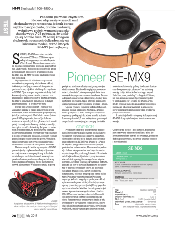HI-FI Słuchawki 1100–1500 zł TEST Podobnie jak wiele innych firm, Pioneer włącza się w szeroki nurt słuchawkowego renesansu, jednak bardzo szybko rosnąca oferta, a także niedawny, wyjątkowy projekt wzmacniacza słuchawkowego U-05 pokazują, że ambicje są bardzo duże. W samej kategorii słuchawek nausznych doliczyłem się aż kilkunastu modeli, wśród których SE-MX9 jest najlepszy. S E-MX9, SE-MX7 oraz dwa modele douszne (CX9 oraz CX8) tworzą wyodrębnioną gamę o nazwie Superior Club Sound. Mam mieszane uczucia co do skuteczności takiej strategii, przywoływanie „klubowych” hałasów może zawęzić grono potencjalnych odbiorców, a tymczasem ani SE-MX7, ani SE-MX9 na takie szufladkowanie nie zasługują. W przypadku SE-MX9 Pioneer porzucił wszelkie eksperymenty i dodatkowe układy, takie jak podwójny przetwornik i regulacja poziomu basu, z jakimi mieliśmy do czynienia w SE-MX7. Tym samym flagowiec stał się dość konwencjonalny, co wcale nie powinno nas zniechęcać, aczkolwiek jest to zastanawiające. SE-MX9 to konstrukcja zamknięta, z dużymi przetwornikami – o średnicy 50 mm. Biorąc pod uwagę kształt i rozmiar nauszników, należy je raczej zaliczyć do grona nausznych, a nie wokółusznych (przynajmniej ja tak je postrzegam). Dość duża masa (nieco ponad 300 g) sprawia, że czuć je dobrze zarówno w rękach, jak i na głowie, choć szeroki pałąk i raczej umiarkowany uścisk pozwalają ten ciężar znosić z łatwością. Jedyne, co może nam przeszkadzać, to dość sztywny skóropodobny materiał (oraz wewnętrzne wypełnienie), z którego wykonano poduszki, oraz ich rozmiar, przyciskający część ucha do głowy. Wynikiem takiej konstrukcji jest również umiarkowana skuteczność izolacji od dźwięków z zewnątrz. Dostarczony do testów egzemplarz SE-MX9 prezentuje się chyba najbardziej odjazdowo w całej stawce – ma specyficzny kolor (złamanie brązu ze złotem) muszli, wewnętrzne powierzchnie są w ciemnym brązie, takie są też poduszki zawieszone na tle ciemnografitowych elementów. W obszarze styku z głową Z takim kompletem akcesoriów SE-MX9 świetnie sprawdzą się w każdym otoczeniu, w domu i w podróży – jest nawet adapter samolotowy. 20 luty 2015 Pioneer SE-MX9 pałąk ma strukturę elastycznej gumy, ale jest dość sztywny. Słuchawki wyglądają nowocześnie i „odważnie”, dostępne są też dwie inne wersje kolorystyczne – czarna i srebrna. Trudno odeprzeć skojarzenia z klasyczną „trójką” kolorystyczną ze świata Apple, którego przenośne gadżety można nabyć w czerni, srebrze i złocie. Oprócz typowej regulacji pałąka (długość), muszle można obracać o 90 stopni, a także lekko pochylać. U dołu każdej muszli (kabel wystarczy podłączyć do jednej z nich) zainstalowano gniazdo 3,5 mm zaślepione gumowymi zatyczkami – usuwajmy je z uwagą, bo takie ODSŁUCH Producent zadbał o dostarczenie akcesoriów, które pozwalają korzystać ze słuchawek w każdych warunkach i z każdym sprzętem, dlatego bez obaw, ale z dużymi oczekiwaniami podłączyłem SE-MX9 do iPhone’a i iPada. W obydwu przypadkach nie ma większych problemów, uniwersalna, 32-omowa impedancja dobrze się sprawdza, bez kłopotu można uzyskać wysokie poziomy głośności. Brzmienie w takiej kombinacji jest nieco przyciemnione, ale miłośnicy potęgi i mocnego basu się nie zawiodą. Średnie tony nie są wyraźnie cofnięte, jednak nie jest to dźwięk błyszczący, nie iskrzy też w zakresie wysokich tonów, co pozwala urządzać długie sesje, nawet ze słabymi nagraniami, o ile nie zmęczą nas same niskie tony. Poznanie wszystkich zalet Pioneera wymaga jednak sięgnięcia po lepsze układy cyfrowo-analogowe niż te, jakimi dysponuje sprzęt przenośny, przynajmniej klasy popularnych smartfonów. Możliwa do osiągnięcia jest nawet lepsza równowaga tonalna, chociaż SE-MX9 zawsze będą przejawiać skłonność do generowania obfitego, zaokrąglonego dołu. Pozostawienie średnicy pół kroku z tyłu, zwłaszcza w jej wyższym podzakresie, powoduje charakterystyczną nosowość, czytelną na wokalach, mniej wyraźną na instrumentach. maleństwa łatwo się gubią. Producent dostarcza dwa przewody: „domowy” ze spiralną sekcją, dzięki której kabel rozciąga się od 2 do 3 m, oraz „mobilny” o długości 120 cm; na nim zainstalowano 3-przyciskowy pilot w konfiguracji MFI (Made for iPhone/iPad/ iPod), choć na pudełku znalazłem także logo zielonego robocika (Android) z adnotacją, że w takim przypadku działa tylko środkowy przycisk i mikrofon. Z ostatniej chwili – do gamy kolorystycznej SE-MX9 dołączyła kolejna, krwistoczerwona wersja. Gitary grają cieplej i bez ostrości, brzmienie jest zazwyczaj obszerne i miękkie, ale z dobrym materiałem potrafi się otworzyć, pokazać dobrą przejrzystość, a zawsze uniknie ostrości i metaliczności. SE-MX9 CENA: 1360 ZŁ DYSTRYBUTOR: DSV www.pioneer.pl WYKONANIE 50-mm przetworniki w muszlach wcale nie największych. Cztery wersje kolorystyczne. FUNKCJONALNOŚĆ Komplet akcesoriów na różne okazje. BRZMIENIE Mocny, ciężki bas determinuje charakter tych słuchawek – kochaj albo zrzuć. Typ: nauszne, zamknięte Masa [g]: 305 Impedancja [W] 32 Długość przewodu [m] 1,2/2–3 Wtyk [mm] 3,5/6,3 (przejściówka) Sterowanie (podst./MFI/Android) tak/tak/nie Inne miękkie etui transportowe, dwa komplety kabli, adapter samolotowy www.audio.com.pl