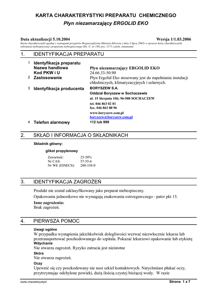 KARTA CHARAKTERYSTYKI PREPARATU CHEMICZNEGO yn niezamarzaj cy ERGOLID EKO Data aktualizacji 5.10.2004 Wersja 1/1.03.2006 Karta charakterystyki zgodna z wymogami przepisów Rozporz dzenia Ministra Zdrowia z dnia 3 lipca 2002r w sprawie karty charakterystyki substancji niebezpiecznej i preparatu niebezpiecznego (Dz. U. nr 140, poz. 1171 z pó n. zmianami) 1. IDENTYFIKACJA PREPARATU 1 Identyfikacja preparatu Nazwa handlowa Kod PKW i U 2 Zastosowanie 2. 3 Identyfikacja producenta 4 Telefon alarmowy yn niezamarzaj cy ERGOLID EKO 24.66.33-50.90 yn Ergolid Eko stosowany jest do nape niania instalacji ch odniczych, klimatyzacyjnych i solarnych. BORYSZEW S.A. Oddzia Boryszew w Sochaczewie ul. 15 Sierpnia 106; 96-500 SOCHACZEW tel. 046 863 02 01 fax. 046 863 00 96 www.boryszew.com.pl [email protected] 112 lub 999 SK AD I INFORMACJA O SK ADNIKACH Sk adnik g ówny: glikol propylenowy Zawarto : Nr CAS: Nr WE (EINECS): 3. 25-50% 57-55-6 200-338-0 IDENTYFIKACJA ZAGRO Produkt nie zosta zaklasyfikowany jako preparat niebezpieczny. Opakowania jednostkowe nie wymagaj znakowania ostrzegawczego - patrz pkt 15. Inne zagro enia: Brak zagro . 4. PIERWSZA POMOC Uwagi ogólne W przypadku wyst pienia jakichkolwiek dolegliwo ci wezwa niezw ocznie lekarza lub przetransportowa poszkodowanego do szpitala. Pokaza lekarzowi opakowanie lub etykiet Wdychanie Nie stwarza zagro . Ryzyko zatrucia jest nieistotne Skóra Nie stwarza zagro . Oczy Upewni si czy poszkodowany nie nosi szkie kontaktowych. Natychmiast p uka oczy, przytrzymuj c odchylone powieki, du ilo ci czystej bie cej wody. W razie karta charakterystyki Strona 1 z 7 WŁAŚCIWOŚCI FIZYKO - CHEMICZNE ERGOLID EKO® - 20 °C Niezamarzający płyn stosowany do układów chłodniczych, klimatyzacyjnych, grzewczych i solarnych oraz pompach ciepła, a zwłaszcza jako chłodziwo w przemyśle spożywczym Barwa Gęstość w 20 °C pH Rezerwa alkaliczna, nie niższa niż Lepkość kinematyczna * -10 °C +10 °C +20 °C +50 °C Temperatura krystalizacji, nie wyższa niż Temperatura zestalenia Temperatura wrzenia Temperatura zapłonu (tygiel otwarty) Prężność par +20°C +50°C +90°C Ciepło właściwe Ciepło parowania w temperaturze wrzenia (dot. glikolu) Przewodnictwo Temperatura rozkładu składnika głównego Rozszerzalność w zakresie temp. od 0°C do 80°C Zawartość glikolu propylenowego zielona ilość 1,038 7,5 - 9,5 8 0,1854 0,0651 0,0441 0,0164 - 20 25,3 104 132 11,9 91,7 283,8 3,38 707 2600-3700 Początek 250 5 39 j.m. g / cm³ cm³0,1 n HCL w 20 ml cm² / s cm² / s cm² / s cm² / s °C °C °C °C hPa hPa hPa KJ/kg deg KJ/kg µs / cm °C % % UWAGA: Glikol propylenowy stanowiący najistotniejszy składnik ERGOLIDU EKO znalazł się poza klasyfikacją toksyczności (wg. załącznika nr 1 do rozporządzenia Ministra Zdrowia i Opieki Społecznej z dn. 21 sierpnia 1997 r. w sprawie substancji chemicznych stanowiących zagrożenie dla zdrowia lub życia) oraz nie jest substancją niebezpieczną (załącznik nr 2 do w/w rozporządzenia) Dz.U.Nr.105, poz. 671 * Wartości mogą być obarczone niewielkim błędem KARTA CHARAKTERYSTYKI PREPARATU CHEMICZNEGO yn niezamarzaj cy ERGOLID EKO 4. PIERWSZA POMOC utrzymywania si dolegliwo ci (podra nienia) zwróci si o pomoc do lekarza okulisty Po kni cie Mo e spowodowa niewielkie podra nienie przewodu pokarmowego 5. POST POWANIE W PRZYPADKU PO ARU Zalecane rodki ga nicze: CO2, proszki ga nicze, piany ga nicze, mg a wodna. Nieodpowiednie rodki ga nicze: Zwarte strumienie wody podawane na powierzchni cieczy. Szczególne zagro enie ze strony produktów spalania i wydzielaj cych si gazów: W trakcie po aru mo e wydziela si tlenek w gla i inne niebezpieczne produkty rozk adu termicznego. Specjalne wyposa enie ochronne stra aków: Nosi izolacyjne aparaty oddechowe z niezale nym ród em powietrza i kombinezony ochronne. Inne uwagi: Usun ze strefy po aru wszystkie osoby postronne Pojemniki zagro one po arem ch odzi rozpylon wod i w miar mo liwo ci ewakuowa z zagro onego rejonu Nie dopuszcza do przedostawania si ska onej wody i innych rodków ga niczych do systemu kanalizacyjnego 6. POST POWANIE W PRZYPADKU NIEZAMIERZONEGO UWOLNIENIA DO RODOWISKA Indywidualne rodki ostro no ci: Zapewni odpowiedni wentylacj . Nosi osobiste rodki ochrony. rodki ostro no ci w zakresie ochrony rodowiska: Powstrzyma wyciek. Usun wszystkie ród a zap onu. Nie dopuszcza do przedostawania si produktu do kanalizacji (zabezpieczy studzienki kanalizacyjne), wód powierzchniowych i wód gruntowych. W przypadku uwolnienia du ych ilo ci produktu lub ska enia rodowiska powiadomi odpowiednie w adze i s by ratownictwa chemicznego. Metody oczyszczania/usuwania: Du e ilo ci uwolnionego produktu obwa owa i przepompowa do oznakowanych pojemników. Niewielkie ilo ci przesypa niepalnym materia em poch aniaj cym i zebra do oznakowanego, szczelnie zamykanego pojemnika na odpady. Miejsce wycieku sp uka wod . Uszkodzone opakowania umie ci w pojemniku na odpady. Usuwa zgodnie z zaleceniami przedstawionymi w punkcie 13. 7. POST POWANIE Z PREPARATEM I JEGO MAGAZYNOWANIE Post powanie z preparatem Przestrzega zasad i przepisów BHP dotycz cych pracy z chemikaliami. karta charakterystyki Strona 2 z 7 KARTA CHARAKTERYSTYKI PREPARATU CHEMICZNEGO yn niezamarzaj cy ERGOLID EKO 7. POST POWANIE Z PREPARATEM I JEGO MAGAZYNOWANIE Stosowa w odpowiednio wentylowanym miejscu Nosi odpowiedni odzie ochronn Podczas stosowania nie je , nie pi i nie pali tytoniu Unika kontaktu z ogniem i ród ami zap onu Magazynowanie Przechowywa w szczelnie zamkni tych, odpowiednio oznakowanych pojemnikach polietylenowych. Przechowywa w miejscu odpowiednio wentylowanym. W miejscu magazynowania produktu wprowadzi zakaz palenia tytoniu, u ywania otwartego ognia i spo ywania posi ków. 8. KONTROLA NARA ENIA I RODKI OCHRONY INDYWIDUALNEJ Dodatkowe zalecenia w zakresie rodków in ynieryjnych: Zapewni odpowiedni wentylacj ogóln pomieszcze magazynowych i stanowisk pracy. Inne wymagania – patrz pkt 7 Parametry kontr
