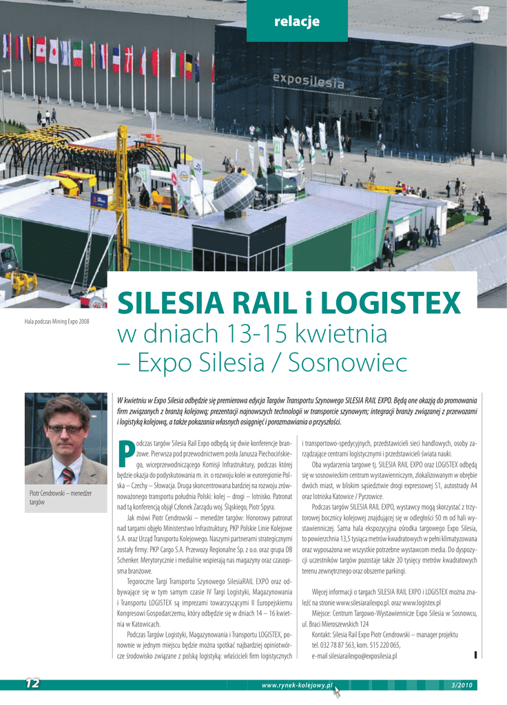 relacje Hala podczas Mining Expo 2008 SILESIA RAIL i LOGISTEX w dniach 13-15 kwietnia – Expo Silesia / Sosnowiec W kwietniu w Expo Silesia odbędzie się premierowa edycja Targów Transportu Szynowego SILESIA RAIL EXPO. Będą one okazją do promowania firm związanych z branżą kolejową; prezentacji najnowszych technologii w transporcie szynowym; integracji branży związanej z przewozami i logistyką kolejową, a także pokazania własnych osiągnięć i porozmawiania o przyszłości. P Piotr Cendrowski – menedżer targów 12 odczas targów Silesia Rail Expo odbędą się dwie konferencje branżowe. Pierwsza pod przewodnictwem posła Janusza Piechocińskiego, wiceprzewodniczącego Komisji Infrastruktury, podczas której będzie okazja do podyskutowania m. in. o rozwoju kolei w euroregionie Polska – Czechy – Słowacja. Druga skoncentrowana bardziej na rozwoju zrównoważonego transportu południa Polski: kolej – drogi – lotnisko. Patronat nad tą konferencją objął Członek Zarządu woj. Śląskiego, Piotr Spyra. Jak mówi Piotr Cendrowski – menedżer targów: Honorowy patronat nad targami objęło Ministerstwo Infrastruktury, PKP Polskie Linie Kolejowe S.A. oraz Urząd Transportu Kolejowego. Naszymi partnerami strategicznymi zostały firmy: PKP Cargo S.A. Przewozy Regionalne Sp. z o.o. oraz grupa DB Schenker. Merytorycznie i medialnie wspierają nas magazyny oraz czasopisma branżowe. Tegoroczne Targi Transportu Szynowego SilesiaRAIL EXPO oraz odbywające się w tym samym czasie IV Targi Logistyki, Magazynowania i Transportu LOGISTEX są imprezami towarzyszącymi II Europejskiemu Kongresowi Gospodarczemu, który odbędzie się w dniach 14 – 16 kwietnia w Katowicach. Podczas Targów Logistyki, Magazynowania i Transportu LOGISTEX, ponownie w jednym miejscu będzie można spotkać najbardziej opiniotwórcze środowisko związane z polską logistyką: właścicieli firm logistycznych i transportowo-spedycyjnych, przedstawicieli sieci handlowych, osoby zarządzające centrami logistycznymi i przedstawicieli świata nauki. Oba wydarzenia targowe tj. SILESIA RAIL EXPO oraz LOGISTEX odbędą się w sosnowieckim centrum wystawienniczym, zlokalizowanym w obrębie dwóch miast, w bliskim sąsiedztwie drogi expressowej S1, autostrady A4 oraz lotniska Katowice / Pyrzowice. Podczas targów SILESIA RAIL EXPO, wystawcy mogą skorzystać z trzytorowej bocznicy kolejowej znajdującej się w odległości 50 m od hali wystawienniczej. Sama hala ekspozycyjna ośrodka targowego Expo Silesia, to powierzchnia 13,5 tysiąca metrów kwadratowych w pełni klimatyzowana oraz wyposażona we wszystkie potrzebne wystawcom media. Do dyspozycji uczestników targów pozostaje także 20 tysięcy metrów kwadratowych terenu zewnętrznego oraz obszerne parkingi. Więcej informacji o targach SILESIA RAIL EXPO i LOGISTEX można znaleźć na stronie www.silesiarailexpo.pl. oraz www.logistex.pl Miejsce: Centrum Targowo-Wystawiennicze Expo Silesia w Sosnowcu, ul. Braci Mieroszewskich 124 Kontakt: Silesia Rail Expo Piotr Cendrowski – manager projektu tel. 032 78 87 563, kom. 515 220 065, e-mail [email protected] ❙ www.rynek-kolejowy.pl 3/2010