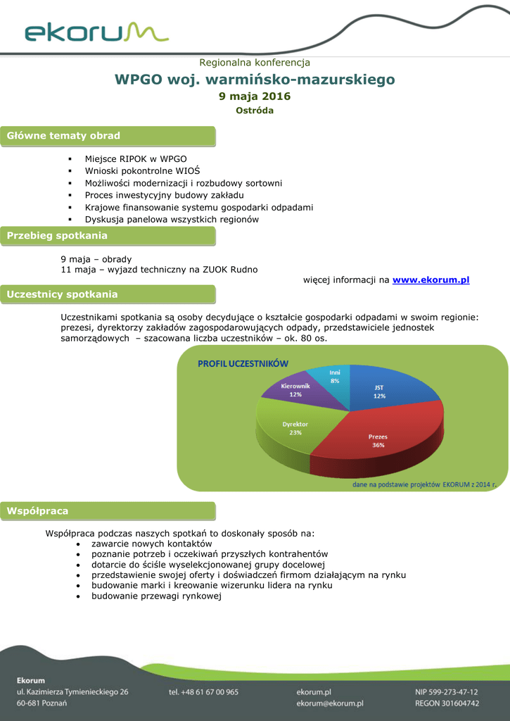 Regionalna konferencja WPGO woj. warmińsko-mazurskiego 9 maja 2016 Ostróda Główne tematy obrad Miejsce RIPOK w WPGO Wnioski pokontrolne WIOŚ Możliwości modernizacji i rozbudowy sortowni Proces inwestycyjny budowy zakładu Krajowe finansowanie systemu gospodarki odpadami Dyskusja panelowa wszystkich regionów Przebieg spotkania 9 maja – obrady 11 maja – wyjazd techniczny na ZUOK Rudno więcej informacji na www.ekorum.pl Uczestnicy spotkania Uczestnikami spotkania są osoby decydujące o kształcie gospodarki odpadami w swoim regionie: prezesi, dyrektorzy zakładów zagospodarowujących odpady, przedstawiciele jednostek samorządowych – szacowana liczba uczestników – ok. 80 os. Współpraca Współpraca podczas naszych spotkań to doskonały sposób na: zawarcie nowych kontaktów poznanie potrzeb i oczekiwań przyszłych kontrahentów dotarcie do ściśle wyselekcjonowanej grupy docelowej przedstawienie swojej oferty i doświadczeń firmom działającym na rynku budowanie marki i kreowanie wizerunku lidera na rynku budowanie przewagi rynkowej ZOSTAŃ PARTNEREM Dla firm chcących współpracować z nami jako partner przygotowaliśmy pakiety, zawierające naszym zdaniem optymalne formy prezentacji. Są to nasze propozycje, które możemy dostosować do potrzeb partnera. Oferta ważna do dnia 22 kwietnia 2016 r., po tym terminie zakres pakietów może ulec zmianie. Możliwość realizacji pakietów będzie potwierdzana przez organizatora. Partner Pakiet (pakiet do potwierdzenia) powierzchnia wystawiennicza (ok 3.m2) bezpłatny udział 2 os. (bez koszów noclegu) referat w materiałach (do 6 str., druk cz-b) reklama w materiałach (1 str. druk kolor) rozdanie materiałów partnera rabat 10% na udział 2 gości partnera Zamieszczenie logo: zaproszenie mailowe materiały konferencyjne prezentacja otwierająca program spotkania strona internetowa organizatora Kwota do ustalenia Pakiet Wystawca Dostępność pakietu do potwierdzenia powierzchnia wystawiennicza (ok 2.m2) bezpłatny udział 1 os. rozdanie materiałów firmowych 1 300 zł netto Pakiet Reklama reklama w materiałach (1 str. druk kolor) lub rozdanie materiałów firmowych 600 zł netto Kontakt: Paweł Szadziewicz tel. +48 61 67 00 965 lub 608 332 700 e-mail: [email protected] Regionalna konferencja WPGO woj. warmińsko-mazurskiego 9 maja 2016 Ostróda Formularz zamówienia Zgłoszenie skanem na e-maila [email protected] Zamawiam Pakiet: WARUNKI UCZESTNICTWA: Partner ……………………………………zł Wystawca ……………………………………zł Reklama/Foldery ……………………………………zł Całkowity koszt oferty brutto (z 23% VAT) ………....................... zł Prosimy o wystawienie faktury pro forma 2.Anulacji powyższego zgłoszenia można dokonać mailowo do dnia 22 kwietnia 2016 r. Rezygnacja po tym terminie zobowiązuje do zapłaty. Przy rezygnacji ze współpracy a przy realizacji części pakietu zobowiązuję się do pokrycia kosztów z tym związanych. 3.W razie niewykorzystania wcześniej zarezerwowanego noclegu zobowiązuję się do zapłaty za ten nocleg. 4.Wszelkie spory mogące wynikać z tytułu niniejszego zlecenia rozpatrywane będą wg prawa polskiego i przez Sąd właściwy dla siedziby zleceniobiorcy. Osoby zgłoszone w ramach pakietu: Imię ……………………………… Imię ……………………………… Nazwisko ……………………………… Nazwisko ……………………………… Stanowisko ……………………………… Stanowisko ……………………………… E-mail ……………………………… E-mail ……………………………… Rezerwację hotelu prosimy potwierdzić przesyłając standardową kartę zgłoszenia do udziału w spotkaniu Nazwa firmy 1.Karta zgłoszenia stanowi akceptację warunków zawartych w informacjach organizacyjnych, Ogólnych Warunków Uczestnictwa w imprezach organizowanych przez firmę Ekorum z Poznania, dostępnych na www.ekorum.pl, oraz zobowiązuje do zapłaty. ……………………………………………………………………… ……………………………………………………………………… Adres ……………………………………………………………………… NIP: ……………………………………………………………………… Osoba do kontaktu ……………………………………………………………………… Tel ……………………………………………………………………… Fax ……………………………………………………………………… E-mail ……………………………………………………………………… 5.Jeżeli przedstawiciel Państwa firmy będzie korzystał z noclegu i/lub wyżywienia podczas spotkania, w sposób inny niż określony w pakietach, konieczne jest wypełnienie i przesłanie karty zgłoszenia udziału w spotkaniu (oprócz powyższego zgłoszenia). 6.Osoba podpisująca formularz zgłoszenia w imieniu zgłaszającego oświadcza, iż posiada stosowne uprawnienia do działania w imieniu i na rzecz zgłaszającego. 7.Wyrażamy zgodę na przetwarzanie danych osobowych w celach marketingowych i promocyjnych przez Ekorum w Poznaniu zgodnie z Ustawą z dnia 29 sierpnia 1997 o ochronie danych osobowych tj. Dz. U. Nr 101 z 2002 r., poz. 926 z późn. zm.) 8.Wyrażam zgodę na przetwarzanie moich danych osobowych, w tym danych nie oznaczonych jako obligatoryjne, w celach marketingowych EKORUM. 9.Zgodnie z ustawą z dnia 30 maja 2014 r. o prawach konsumenta wyrażam zgodę na przesyłanie przez EKORUM informacji handlowych za pomocą telekomunikacyjnych urządzeń końcowych i automatycznych systemów wywołujących. 10. Zgodnie z ustawą z dnia 18 lipca 2002 r. o świadczeniu usług drogą elektroniczną wyrażam zgodę na przesyłanie przez EKORUM informacji handlowych za pomocą środków komunikacji elektronicznej. 