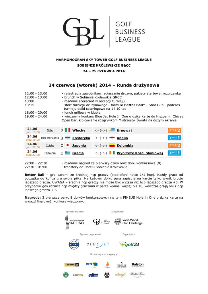 HARMONOGRAM SKY TOWER GOLF BUSINESS LEAGUE SOBIENIE KRÓLEWSKIE G&CC 24 – 25 CZERWCA 2014 24 czerwca (wtorek) 2014 – Runda drużynowa 12:00 - 13:00 12:00 - 13:00 13:00 13:15 18:00 - 20:00 19:00 - 24:00 24.06 - rejestracja zawodników, zgłaszanie drużyn, pakiety startowe, rozgrzewka brunch w Sobienie Królewskie G&CC rozdanie scorecard w recepcji turnieju start turnieju drużynowego - formuła Better Ball* - Shot Gun - podczas turnieju dołki cateringowe na 1 i 10 tee - lunch grillowy w klubie - wieczorny konkurs Blue Jet Hole In One o dziką kartę do Hiszpanii, Chivas Open Bar, kibicowanie rozgrywkom Mistrzostw Świata na dużym ekranie Natal D Włochy -:- (-:-) Urugwaj 24.06 Belo Horizonte D Kostaryka -:- (-:-) Anglia 24.06 Cuiaba C Japonia -:- (-:-) Kolumbia 24.06 Fortaleza C Grecja -:- (-:-) Wybrzeże Kości Słoniowej godz.18:00 godz.18:00 godz.22:00 godz.22:00 22:00 - 22:30 22:30 - 01:00 - rozdanie nagród za pierwszy dzień oraz dołki konkursowe (8) - transfery do Hotelu Sobienie Królewskie Better Ball – gra parami ze średniej hcp graczy (stableford netto 1/1 hcp). Każdy gracz od początku do końca gra swoją piłką. Na każdym dołku para zapisuje na karcie tylko wynik brutto lepszego gracza. UWAGA – średnia hcp graczy nie może być wyższa niż hcp lepszego gracza +5. W przypadku gdy różnica hcp między graczami w parze wynosi więcej niż 10, wówczas grają oni z hcp lepszego gracza + 5. Nagrody: 3 pierwsze pary, 8 dołków konkursowych (w tym FINEUS Hole in One o dziką kartę na wyjazd finałowy), konkurs wieczorny. HARMONOGRAM SKY TOWER GOLF BUSINESS LEAGUE SOBIENIE KRÓLEWSKIE G&CC 24 – 25 CZERWCA 2014 25 czerwca (środa) 2014 – Ruda indywidualna 9:00 - 10:30 9:30 - 11:00 10:00 - 11:30 15:00 - 17:00 17:00 - transfer zawodników z hotelu na pole golfowe odbiór scorecard i lunchpacków w recepcji turniejowej starty z 1 i 10 tee lunch w Sobienie Królewskie G&CC ceremonia zakończenia turnieju i wręczenie nagród dla zwycięzców Format gry: stableford netto ¾ HCP w 3 grupach handicapowych [0-12], [12,1 – 24], [24,1 – 32]. Zawodnicy o HCP wyższym niż 32, grają z HCP=32. Nagrody: 3 nagrody w każdej grupie handicapowej. Zwycięzca każdej z grup handicapowych otrzymuje opłacone zaproszenie do finałowego turnieju w Hiszpanii (11-16 listopada).