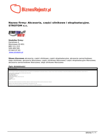 Nazwa firmy: Akcesoria, części silnikowe i eksploatacyjne. STROTOM s.c. Siedziba firmy: Garażowa 4 Warszawa 02-651 885 111 213 509 409 592 22 843 07 63 www.strotom.pl Słowa kluczowe akcesoria; części silnikowe; części eksploatacyjne; akcesoria samochodowe; oleje silnikowe; akcesoria Warszawa; części silnikowe Warszawa; części eksploatacyjne Warszawa; akcesoria samochodowe Warszawa; oleje silnikowe Warszawa Opis działalności Witamy w STROTOM MOTO! Najwi?kszy wybór cz??ci samochodowych, regeneracja wtryskiwaczy Nasza firma zajmuje si? sprzeda?? oraz profesjonalnym doborem cz??ci silnikowych oraz eksploatacyjnych do samochodów osobowych, ci??arowych, maszyn rolniczych oraz budowlanych. W naszej ofercie znajdziecie pa?stwo produkty renomowanych i uznanych marek m.in.: * zestawy uszczelek, uszczelki pojedyncze, simmeringi- Ajusa, Goetze, Elring * rolki i napinacze- Ina, Ruville, SKF * paski- Gates, Contitech * zawory- Gieffe, Osvat, Freccia * panewki- Glyco, AE, King * pier?cienie t?okowe- Schottle, Goetze, Prima, Grant * wa?ki rozrz?du * popychacze * d?wigienki zaworowe * oleje Ponadto, jeste?my oficjalnym dystrybutorem oleji marki Motul, najlepszych w dziedzinie smarowania silników aut zarówno sportowych jak i u?ytkowych. Zajmujemy si? tak?e regeneracj? wtryskiwaczy, pompowtryskiwaczy, pomp wtryskowych TDI, TDCi. Do?wiadczenie w bran?y motoryzacyjnej zawdzi?czamy m.in. sta?emu uczestnictwu w wy?cigach samochodowych. strona 1 / 1 Powered by TCPDF (www.tcpdf.org)