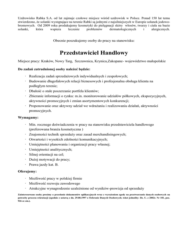 Uzdrowisko Rabka S.A. od lat zajmuje czołowe miejsce wśród uzdrowisk w Polsce. Ponad 150 lat temu stwierdzono, że solanki występujące na terenie Rabki są jednymi z najsilniejszych w Europie solanek jodowobromowych. Od 2009 roku produkujemy kosmetyki do pielęgnacji skóry włosów, twarzy i ciała na bazie solanki, która wspiera leczenie problemów dermatologicznych i alergicznych. Obecnie poszukujemy osoby do pracy na stanowisku: Przedstawiciel Handlowy Miejsce pracy: Kraków, Nowy Targ, Szczawnica, Krynica,Zakopane- województwo małopolskie Do zadań zatrudnionej osoby należeć będzie: • Realizacja zadań sprzedażowych indywidualnych i zespołowych; • Budowanie długofalowych relacji biznesowych i profesjonalna obsługa klienta na podległym terenie; • Dbałość o stałe poszerzanie portfela klientów; • Zbieranie informacji o rynku: m.in. monitorowanie udziałów półkowych, ekspozycyjnych, aktywności promocyjnych i zmian asortymentowych konkurencji; • Proponowanie oraz aktywny udział we wdrażaniu i realizowaniu działań, aktywności promocyjnych. Wymagamy: • Min. rocznego doświadczenia w pracy na stanowisku przedstawiciela handlowego (preferowana branża kosmetyczna ) • Znajomości technik sprzedaży oraz zasad merchandisingowych; • Otwartości i wysokich zdolności komunikacyjnych; • Umiejętności planowania i organizacji pracy własnej; • Umiejętności analitycznych; • Silnej orientacji na cel; • Dużej motywacji do pracy; • Prawa jazdy kat. B. Oferujemy: • Możliwość pracy w polskiej firmie • Możliwość rozwoju zawodowego • Atrakcyjne wynagrodzenie uzależnione od wyników-prowizja od sprzedaży Zainteresowane osoby prosimy o przesłanie dokumentów aplikacyjnych wraz z wyrażeniem zgody na przetwarzanie danych osobowych na potrzeby procesu rekrutacji (zgodnie z ustawą z dn. 29.08.1997 o Ochronie Danych Osobowych; tekst jednolity: Dz. U. z 2002r. Nr 101, poz. 926 ze zm.).