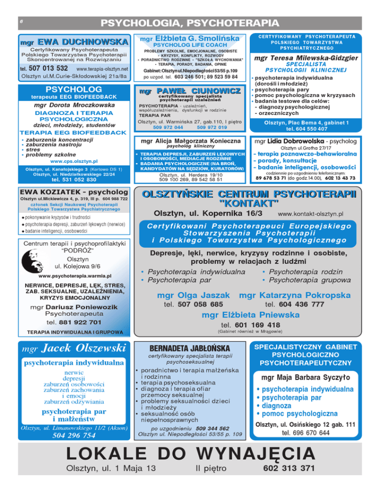 PSYCHOLOGIA, PSYCHOTERAPIA 66 mgr EWA DUCHNOWSKA Certyfikowany Psychoterapeuta Polskiego Towarzystwa Psychoterapii Skoncentrowanej na Rozwi¹zaniu tel. 507 013 532 www.terapia-olsztyn.net Olsztyn ul.M.Curie-Sk³odowskiej 21a/8a PSYCHOLOG terapeuta EEG BIOFEEDBACK mgr Dorota Mroczkowska DIAGNOZA I TERAPIA PSYCHOLOGICZNA dzieci, m³odzie¿y, studentów TERAPIA EEG BIOFEEDBACK zaburzenia koncentracji zaburzenia nastroju stres problemy szkolne www.cps.olsztyn.pl Olsztyn, ul. Kanafojskiego 3 (Kortowo DS 1) Olsztyn, ul. Niedzia³kowskiego 22/24 mgr El¿bieta G. Smoliñska PSYCHOLOG LIFE COACH PROBLEMY SZKOLNE, EMOCJONALNE, OSOBISTE KRYZYSY, KONFLIKTY, ROZWODY PORADNICTWO RODZINNE "SZKO£A WYCHOWANIA" TERAPIA, PORADY, BADANIA, OPINIE Gabinet: Olsztyn ul.Niepodleg³oci 53/55 p.109 po uzgod. tel. 603 246 501; 89 523 59 84 mgr PAWE£ CIUNOWICZ certyfikowany specjalista psychoterapii uzale¿nieñ PSYCHOTERAPIA - uzale¿nieñ, wspó³uzale¿nienia, dysfunkcji w rodzinie TERAPIA PAR Olsztyn ul.Mickiewicza 4, p. 319, III p. 604 988 722 cz³onek Sekcji Naukowej Psychoterapii Polskiego Towarzystwa Psychiatrycznego l pokonywanie kryzysów i trudnoci l psychoterapia depresji, zaburzeñ lêkowych (nerwice) l badanie inteligencji, osobowoci Centrum terapii i psychoprofilaktyki PODRÓ¯ Olsztyn ul. Kolejowa 9/6 www.psychoterapia.warmia.pl NERWICE, DEPRESJE, LÊK, STRES, ZAB. SEKSUALNE, UZALE¯NIENIA, KRYZYS EMOCJONALNY psychoterapia indywidualna nerwic depresji zaburzeñ osobowoci zaburzeñ zachowania i emocji zaburzeñ od¿ywiania psychoterapia par i ma³¿eñstw Olsztyn, ul. Limanowskiego 11/2 (Akson) 504 296 754 psychoterapia indywidualna (doroli i m³odzie¿) psychoterapia pary pomoc psychologiczna w kryzysach badania testowe dla celów: - diagnozy psychologicznej - orzeczniczych mgr Alicja Ma³gorzata Konieczna mgr Lidia Dobrowolska - psycholog TERAPIA DEPRESJI, ZABURZEÑ LÊKOWYCH I OSOBOWOCI, MEDIACJE RODZINNE BADANIA PSYCHOLOGICZNE (NA BROÑ, KANDYDATÓW NA SÊDZIÓW, KURATORÓW) - terapia poznawczo-behawioralna - porady, konsultacje - badanie inteligencji, osobowoci Olsztyn, ul. Herdera 19/10 509 100 269, 89 542 58 51 89 678 53 71 (do godz.14.00), 602 13 43 73 psycholog kliniczny Olsztyn ul.Grotha 27/17 codziennie po uzgodnieniu telefonicznym: OLSZTYÑSKIE CENTRUM PSYCHOTERAPII "KONTAKT" Olsztyn, ul. Kopernika 16/3 www.kontakt-olsztyn.pl Certyfikowani Psychoterapeuci Europejskiego Stowarzyszenia Psychoterapii i Polskiego Towarzystwa Psychologicznego Depresje, lêki, nerwice, kryzysy rodzinne i osobiste, problemy w relacjach z ludmi Psychoterapia indywidualna Psychoterapia rodzin Psychoterapia par Psychoterapia grupowa mgr Olga Jaszak tel. 507 058 685 mgr Katarzyna Pokropska tel. 604 436 777 mgr El¿bieta Pniewska tel. 601 169 418 (Gabinet równie¿ w Mr¹gowie) TERAPIA INDYWIDUALNA I GRUPOWA Jacek Olszewski SPECJALISTA PSYCHOLOGII KLINICZNEJ Olsztyn, Plac Bema 4, gabinet 1 tel. 604 550 407 mgr Dariusz Poniewozik Psychoterapeuta tel. 881 922 701 mgr mgr Teresa Milewska-Gidzgier Olsztyn, ul. Warmiñska 27, gab.110, I piêtro 509 972 044 509 972 019 tel. 531 052 830 EWA KOZIATEK - psycholog CERTYFIKOWANY PSYCHOTERAPEUTA POLSKIEGO TOWARZYSTWA PSYCHIATRYCZNEGO BERNADETA JAB£OÑSKA certyfikowany specjalista terapii psychoseksualnej poradnictwo i terapia ma³¿eñska i rodzinna terapia psychoseksualna diagnoza i terapia ofiar przemocy seksualnej problemy seksualnoci dzieci i m³odzie¿y seksualnoæ osób niepe³nosprawnych po uzgodnieniu 509 344 562 Olsztyn ul. Niepodleg³oci 53/55 p. 109 SPECJALISTYCZNY GABINET PSYCHOLOGICZNO PSYCHOTERAPEUTYCZNY mgr Maja Barbara Syczy³o psychoterapia indywidualna psychoterapia par diagnoza pomoc psychologiczna Olsztyn, ul. Osiñskiego 12 gab. 111 tel. 696 670 644 LOKALE DO WYNAJÊCIA Olsztyn, ul. 1 Maja 13 II piêtro 602 313 371