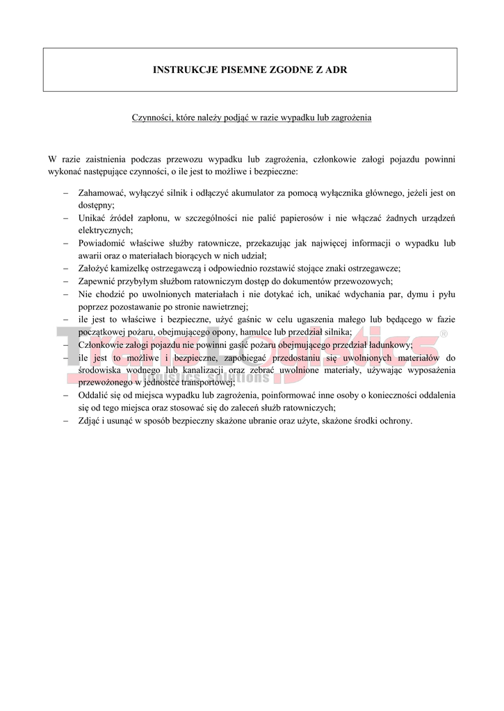 INSTRUKCJE PISEMNE ZGODNE Z ADR Czynności, które należy podjąć w razie wypadku lub zagrożenia W razie zaistnienia podczas przewozu wypadku lub zagrożenia, członkowie załogi pojazdu powinni wykonać następujące czynności, o ile jest to możliwe i bezpieczne: Zahamować, wyłączyć silnik i odłączyć akumulator za pomocą wyłącznika głównego, jeżeli jest on dostępny; Unikać źródeł zapłonu, w szczególności nie palić papierosów i nie włączać żadnych urządzeń elektrycznych; Powiadomić właściwe służby ratownicze, przekazując jak najwięcej informacji o wypadku lub awarii oraz o materiałach biorących w nich udział; Założyć kamizelkę ostrzegawczą i odpowiednio rozstawić stojące znaki ostrzegawcze; Zapewnić przybyłym służbom ratowniczym dostęp do dokumentów przewozowych; Nie chodzić po uwolnionych materiałach i nie dotykać ich, unikać wdychania par, dymu i pyłu poprzez pozostawanie po stronie nawietrznej; ile jest to właściwe i bezpieczne, użyć gaśnic w celu ugaszenia małego lub będącego w fazie początkowej pożaru, obejmującego opony, hamulce lub przedział silnika; Członkowie załogi pojazdu nie powinni gasić pożaru obejmującego przedział ładunkowy; ile jest to możliwe i bezpieczne, zapobiegać przedostaniu się uwolnionych materiałów do środowiska wodnego lub kanalizacji oraz zebrać uwolnione materiały, używając wyposażenia przewożonego w jednostce transportowej; Oddalić się od miejsca wypadku lub zagrożenia, poinformować inne osoby o konieczności oddalenia się od tego miejsca oraz stosować się do zaleceń służb ratowniczych; Zdjąć i usunąć w sposób bezpieczny skażone ubranie oraz użyte, skażone środki ochrony. Dodatkowe wskazówki dla członków załogi pojazdu związane z charakterystykami zagrożeń stwarzanych przez towary niebezpieczne w rozbiciu na poszczególne klasy oraz działania, które należy podjąć, z uwzględnieniem zaistniałych okoliczności Nalepki ostrzegawcze Charakterystyka zagrożeń Wskazówki dodatkowe (1) Materiały i przedmioty wybuchowe (2) Mogą mieć szereg właściwości powodujących efekty takie, jak wybuch masowy, rozrzut odłamków, intensywny ogień lub promieniowanie cieplne, świecenie, huk lub wydzielanie dymu. Wrażliwe na wstrząsy lub uderzenia lub podgrzewanie. (3) Schronić się i pozostać z dala od okien. Materiały i przedmioty wybuchowe Gazy palne Niewielkie zagrożenie wybuchem i pożarem. Schronić się. Zagrożenie pożarem. Zagrożenie wybuchem. Mogą znajdować się pod ciśnieniem. Zagrożenie działaniem duszącym. Mogą powodować poparzenia lub odmrożenia. Zagrożenie wybuchem w przypadku podgrzewania. Schronić się. Unikać zagłębień terenu. Zagrożenie działaniem duszącym. Mogą znajdować się pod ciśnieniem. Mogą powodować odmrożenia. Zagrożenie wybuchem w przypadku podgrzewania. Schronić się. Unikać zagłębień terenu. Zagrożenie zatruciem. Mogą znajdować się pod ciśnieniem. Mogąpowodować oparzenia chemiczne lub odmrożenia. Zagrożenie wybuchem w przypadku podgrzewania. Użyć maski ucieczkowej. Schronić się. Unikać zagłębień terenu. Zagrożenie pożarem. Zagrożenie wybuchem. Ładunek może wybuchnąć przypadku podgrzewania. Schronić się. Unikać zagłębień terenu. Zapobiegać przedostaniu się uwolnionych materiałów do środowiska wodnego lub systemu kanalizacji. Zagrożenie pożarem. Materiały łatwopalne lub palne. Mogą zapalić się na skutek działania ciepła, iskier lub otwartego płomienia. Ładunek może zawierać materiały samoreaktywne, zdolne do samoprzyspieszającego się, egzotermicznego rozkładu na skutek wydzielania ciepła, kontaktu z innymi substancjami (takimi jak kwasy, związki metali ciężkich lub aminy), tarcia lub uderzenia. Może to skutkować wydzielaniem szkodliwych, palnych par lub gazów. Ładunek może wybuchnąć w przypadku podgrzewania. Zapobiegać przedostaniu się uwolnionych materiałów do środowiska wodnego i systemu kanalizacji. Gazy niepalne i nietrujące Gazy trujące Materiały ciekłe palne Materiały stałe zapalne, materiały samoreaktywne i materiały wybuchowe stałe odczulone Materiały samozapalne Zagrożenie samozapaleniem w przypadku uszkodzenia sztuk przesyłki lub uwolnienia się zawartości. Mogą gwałtownie reagować z wodą. Materiały wytwarzające w zetknięciu z wodą gazy palne Zagrożenie pożarem i wybuchem na skutek zetknięcia z wodą. Uwolniony materiał powinien być utrzymywany w stanie suchym, pod przykryciem. Nalepki ostrzegawcze Charakterystyka zagrożeń Wskazówki dodatkowe (1) Materiały utleniające (2) (3) Zagrożenie pożarem i wybuchem. Zagrożenie gwałtowną reakcją kontakcie z materiałami palnymi. w Unikać zmieszania z materiałami palnymi (np. trocinami). Nadtlenki organiczne Zagrożenie rozkładem egzotermicznym wskutek wzrostu temperatury, kontaktu z innymi substancjami (takimi jak kwasy, związki metali ciężkich lub aminy), tarcia lub wstrząsu. Może to skutkować wydzielaniem się szkodliwychi palnych par lub gazów. Unikać zmieszania z materiałami palnymi (np. trocinami). Zagrożenie zatruciem. Zagrożenie w przypadku przedostania się do środowiska wodnego i systemu kanalizacji ściekowej. Użyć maski ucieczkowej. Materiały trujące Materiały zakaźne Zagrożenie zakażeniem. Zagrożenie w przypadku przedostania się do środowiska wodnego i systemu kanalizacji. Materiały promieniotwórcze Zagrożenie napromieniowaniem. Ograniczyć czas narażenia. Materiał rozszczepialny Zagrożenie reakcją łańcuchową. Materiały żrące Różne materiały i przedmioty niebezpieczne UWAGA 1: UWAGA 2: Mogą działać żrąco lub powodować oparzenia chemiczne. Mogą reagować gwałtownie ze sobą, z wodą lub z innymi substancjami. Zagrożenie w przypadku przedostania się do środowiska wodnego i systemu kanalizacji. Zapobiegać przedostaniu się uwolnionych materiałów do środowiska wodnego 