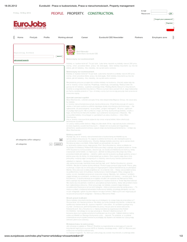 18.05.2012 Eurobuild : Praca w budownictwie, Praca w nieruchomościach, Property management E-mail Friday, 18 May 2012 Passw ord Forgot your password? Register Home Find job Profile Working abroad Career Eurobuild CEE Newsletter Partners Employers zone Em il Górecki Dziennikarz Eurobuild CEE Keyw ord (eg. Architect) search Dziew czyny na rusztow aniach adv anced search Kobiety w budow nictw ie? To już było. Lata temu murarki w yrabiały naw et 200 proc. normy, choć przodow ników pracy nie dościgały. Dziś kobiety-inżynierki są rów nie dobre, jak ich koledzy. Ale, niestety, nie są tak samo cenione. Dziew czyny na rusztow aniach Kobiety w budow nictw ie? To już było. Lata temu murarki w yrabiały naw et 200 proc. normy, choć przodow ników pracy nie dościgały. Dziś kobiety-inżynierki są rów nie dobre, jak ich koledzy. Ale, niestety, nie są tak samo cenione. Nie jesteśmy przyzw yczajeni do w idoku kobiety na budow ie, chociaż pojaw iają się one w branży coraz częściej. Projektują, nadzorują, zarządzają. Radzą sobie nie gorzej niż ich koledzy, a jednak zarabiają mniej. Według Banku Danych o Inżynierach, średnie w ynagrodzenie inżyniera w Polsce w ynosi nieco ponad 4,6 zł. Jego koleżanka po fachu zarabia praw ie o 1 tys. zł mniej, a przy tym na sw oją pozycję musi pracow ać znacznie ciężej. Gum iaki zam iast szpilek Eliza Wachow iec, członek zarządu firmy dew eloperskiej Magnus Group, nie zauw aża, by kobiety w branży nieruchomościow ej były dyskryminow ane. W jej firmie pracuje ich sporo. Jedna z nich jest szefem w ybitnie męskiego działu inżynieryjno-technicznego. – Na ogłoszenie, że poszukujemy, na przykład, „project managera”, 90 proc. zgłoszeń w ysyłają mężczyźni. Nie w ynika to z tego, że firmy dyskryminują kobiety, a tylko z tego, że techniczne kierunki studiów są w ybierane raczej przez chłopców . Nie w szystkie kobiety chcą biegać w gumiakach po placu budow y – mów i Eliza Wachow iec. Ale w branży rzeczyw iście pojaw ia się coraz w ięcej kobiet, które ukończyły techniczne uczelnie i w pracy radzą sobie dobrze. Mają zw ykle około 30 lat, najczęściej duże zdolności i św ieże dyplomy uczelni technicznych. – Dzięki nim na budow ach łagodnieje atmosfera, spada poziom emocji, a język staje się bardziej parlamentarny – śmieje się Eliza Wachow iec. all categories (offer category) all categories search Kobiecy zaw ód? Wydaje się, że w branży nieruchomościow o-budow lanej architektki są na uprzyw ilejow anej pozycji. To zajęcie w ybitnie techniczne, ale niezbędna jest tu w yobraźnia i zmysł estetyczny. Choćby dlatego kobiety pow inny się tu spraw dzać. Św iatow ej sław y architekt, Zaha Hadid uw aża jednak, że naw et w tej branży dziew czyny mają gorzej. Prof. Ew a Kuryłow icz, która w ykłada na Wydziale Architektury Politechniki Warszaw skiej i zajmuje się projektow aniem w firmie APA Kuryłow icz & Associates, obserw uje, że studia architektoniczne kończy mniej w ięcej tyle samo kobiet, co mężczyzn. Jednak na taką pracę decyduje się mniej przestaw icielek płci pięknej. – Jeżeli w jakiś zaw ód w pisane są długie godziny pracy i późne pow roty do domu, to mniej kobiet go w ybiera. One często mają nieco inne priorytety i w ięcej zajęć zw iązanych z rodziną, naw et przy bardzo partnerskich układach z mężem – tłumaczy Ew a Kuryłow icz. Jak sama przyznaje, bardziej znany jest jej mąż, prof. Stefan Kuryłow icz, prezes APAKA. Nie jest to żadna dyskryminacja. Firma to jego pomysł i jego konik. Praca, jaką w ykonuje, w iąże się ze stresującymi negocjacjami i odpow iedzialnością za pieniądze klienta. Ona zaw sze w olała projektow ać i to w łaśnie robi. – Kiedy zaczynałam pracę na politechnice, było mi trudniej w konkurencji z moimi kolegami. Żeby osiągnąć to samo, co oni, musiałam pracow ać znacznie w ięcej. Niestety, ten „kobiecy” problem ciągle istnieje na uczelniach, zw łaszcza w początkach ich kariery – uw aża prof. Ew a Kuryłow icz. Z dyskryminacją ze w zględu na płeć nie spotyka się Marzanna Walo, która zajmuje się doradztw em personalnym w budow nictw ie w firmie Naj International. Nie styka się ona jednak z ludźmi w początkow ej fazie kariery, kiedy taki problem może być najbardziej w idoczny. Choć przyznaje, że kobiety czasem mają mniejsze oczekiw ania finansow e od sw oich kolegów , mimo w ykonyw ania tej samej pracy. – To może w ynikać z kobiecej tożsamości kulturow ej: kobiety oczekują pieniędzy za coś, co już osiągnęły i gdzie są pew niejsze sw ojej w artości. Mężczyźni zaś negocjują już na poczet przyszłych osiągnięć – tłumaczy Marzanna Walo. Strach przed m atkam i Skoro kobiety-inżynierki dorów nują sw ym kolegom, to czego boją się pracodaw cy? Oczyw iście, ich macierzyństw a. Ale kiedy na rynku brakuje inżynierów i zmienia się społeczne nastaw ienie do „typow o męskich” zaw odów , to i problem zyskuje inny w ymiar. Zw łaszcza, jeśli kandydatka do pracy ma już pew ne dośw iadczenie. Koleżanki prof. Ew y Kuryłow icz z międzynarodow ej organizacji Unia Kobiet Architektów narzekają na sw oją sytuację w Stanach Zjednoczonych. W konserw atyw nym społeczeństw ie trudniej jest się im w ybić. Całkiem dobrze radzą sobie architektki ze Starego Kontynentu oraz... Japonki. Te ostatnie, w w ybitnie zmaskulizow anym społeczeństw ie przebijają się dopiero od niedaw na i zaczynają odnosić pierw sze sukcesy. Mniejsza kasa, ta sam a praca Jak sytuacja w ygląda w Polsce? Średnie w ynagrodzenie w ykonujących zaw ód inżynierski mężczyzn w ynosi 4679 zł. Kobiety zarabiają mniej – 3697 zł. Różnica jest w idoczna na każdym stanow isku i w każdym regionie. Te, które już zdecydują się zostać inżynierami, w ybierają takie www.eurojobscee.com/index.php?name=article&op=showarticle&id=27 1/2 18.05.2012 Eurobui