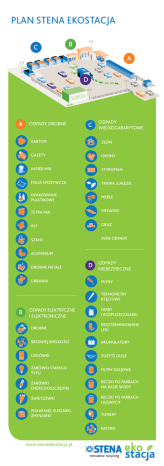 PLAN STENA EKOSTACJA ODPADY DROBNE ODPADY WIELKOGABARYTOWE KARTON ZŁOM GAZETY OPONY PAPIER MIX STYROPIAN FOLIA SPOŻYWCZA TRAWA, GAŁĘZIE OPAKOWANIE PLASTIKOWE MEBLE TETRA PAK DREWNO PET GRUZ SZKŁO INNE ODPADY ALUMINIUM DROBNE METALE UBRANIA ODPADY NIEBEZPIECZNE PŁYNY TERMOMETRY RTĘCIOWE ODPADY ELEKTRYCZNE I ELEKTRONICZNE FARBY I ROZPUSZCZALNIKI DROBNE PRZETERMINOWANE LEKI ŚREDNIEJ WIELKOŚCI AKUMULATORY LODÓWKI ZUŻYTE OLEJE ŻARÓWKI STAREGO TYPU FILTRY OLEJOWE ŻARÓWKI ENERGOOSZCZĘDNE BECZKI PO FARBACH NA BAZIE WODY ŚWIETLÓWKI BECZKI PO FARBACH OLEJNYCH PIEKARNIKI, SUSZARKI, ZMYWARKI TONERY BATERIE