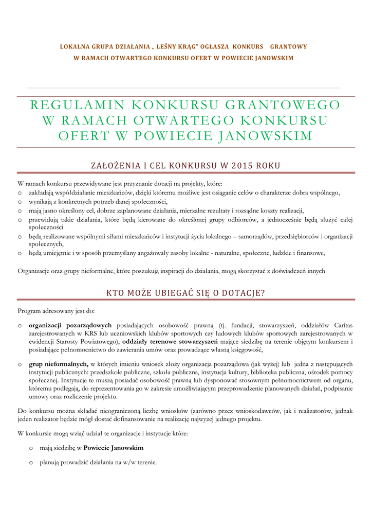 LOKALNA GRUPA DZIAŁANIA „ LEŚNY KRĄG” OGŁASZA KONKURS GRANTOWY W RAMACH OTWARTEGO KONKURSU 1. OFERT W POWIECIE JANOWSKIM REGULAMIN KONKURSU GRANTOWEGO W RAMACH OTWARTEGO KONKURSU OFERT W POWIECIE JANOWSKIM ZAŁOŻENIA I CEL KONKURSU W 2015 ROKU W ramach konkursu przewidywane jest przyznanie dotacji na projekty, które: o zakładają współdziałanie mieszkańców, dzięki któremu możliwe jest osiąganie celów o charakterze dobra wspólnego, o wynikają z konkretnych potrzeb danej społeczności, o mają jasno określony cel, dobrze zaplanowane działania, mierzalne rezultaty i rozsądne koszty realizacji, o przewidują takie działania, które będą kierowane do określonej grupy odbiorców, a jednocześnie będą służyć całej społeczności o będą realizowane wspólnymi siłami mieszkańców i instytucji życia lokalnego – samorządów, przedsiębiorców i organizacji społecznych, o będą umiejętnie i w sposób przemyślany angażowały zasoby lokalne - naturalne, społeczne, ludzkie i finansowe, Organizacje oraz grupy nieformalne, które poszukują inspiracji do działania, mogą skorzystać z doświadczeń innych KTO MOŻE UBIEGAĆ SIĘ O DOTACJE? Program adresowany jest do: o organizacji pozarządowych posiadających osobowość prawną (tj. fundacji, stowarzyszeń, oddziałów Caritas zarejestrowanych w KRS lub uczniowskich klubów sportowych czy ludowych klubów sportowych zarejestrowanych w ewidencji Starosty Powiatowego), oddziały terenowe stowarzyszeń mające siedzibę na terenie objętym konkursem i posiadające pełnomocnictwo do zawierania umów oraz prowadzące własną księgowość, o grup nieformalnych, w których imieniu wniosek złoży organizacja pozarządowa (jak wyżej) lub jedna z następujących instytucji publicznych: przedszkole publiczne, szkoła publiczna, instytucja kultury, biblioteka publiczna, ośrodek pomocy społecznej. Instytucje te muszą posiadać osobowość prawną lub dysponować stosownym pełnomocnictwem od organu, któremu podlegają, do reprezentowania go w zakresie umożliwiającym przeprowadzenie planowanych działań, podpisanie umowy oraz rozliczenie projektu. Do konkursu można składać nieograniczoną liczbę wniosków (zarówno przez wnioskodawców, jak i realizatorów, jednak jeden realizator będzie mógł dostać dofinansowanie na realizację najwyżej jednego projektu. W konkursie mogą wziąć udział te organizacje i instytucje które: o mają siedzibę w Powiecie Janowskim o planują prowadzić działania na w/w terenie. SPOSÓB WYŁANIANIA GRANTOBIORCÓW LGD „Leśny Krąg” dokona oceny formalnej w oparciu o następujące kryteria: 1. projekt został złożony w terminie, projekt jest napisany według formularza wniosku Konkursu Grantowego w ramach Otwartego Konkursu Ofert w Powiecie Janowskim, jest czytelny i kompletny. 2. projekt jest złożony przez fundację lub stowarzyszenie (bądź jej/jego oddział) lub grupę nieformalną, w której imieniu występuje organizacja lub uprawniona instytucja posiadająca osobowość prawną. 3. organizacja/instytucja ubiegająca się o dotację załączyła do wniosku dokument potwierdzający posiadanie osobowości prawnej lub stosowne pełnomocnictwo od organu, któremu podlega, do samodzielnego zaciągania zobowiązań oraz prowadzenia działań zaplanowanych w ramach projektu. 4. projekt jest adresowany do społeczności Powiatu janowskiego, a siedziba wnioskodawcy znajduje się na obszarze objętym konkursem przez LGD. 5. projekt dotyczy aktywizowania lokalnych społeczności wokół celów o charakterze dobra wspólnego. 6. harmonogram minimum 3-miesięcznego, max. 6-miesięcznego projektu jest przewidziany na okres między 29.05.2015r. – 16.11.2015r. 7. przedstawiony w formularzu wniosku budżet jest prawidłowo wypełniony (nie zawiera błędów rachunkowych). 8. kwota wnioskowanej dotacji nie przekracza …………….. złotych. 9. organizacja ma zaplanowany wkład własny w wysokości minimum 5% wartości wnioskowanej dotacji. . 10. projekt wyklucza prowadzenie działalności gospodarczej. 11. z otrzymanej dotacji finansować nie można: o udzielania pożyczek, o przedsięwzięć, które zostały już zrealizowane, o celów politycznych, o działań ściśle sportowych, jeśli nie prowadzą one do aktywizacji społeczności i długotrwałych rezultatów, o zakupu środków trwałych, który nie jest merytorycznie uzasadniony, o bezpośredniej pomocy finansowej dla osób fizycznych, o inwestycji (np. zakup gruntów, budowa obiektów przemysłowych, oczyszczalni ścieków itp.), o podatku VAT, jeśli istnieje możliwość odzyskania tego podatku z Urzędu Skarbowego, o tworzenia kapitału żelaznego organizacji, o zagranicznych wycieczek i wyjazdów, o podstawowej działalności instytucji publicznych wynikającej z właściwych im ustaw, o finansowania podatku dochodowego od osób prawnych. Wnioski, które spełnią wszystkie powyższe wymagania formalne, zostaną przekazane do oceny merytorycznej Lokalnej Komisji Grantowej powołanej przez LGD. Komisja wybierze te projekty, które w najwyższym stopniu spełnią następujące kryteria: 1. 2. 3. 4. 5. 6. 7. 8. 9. odpowiadają na jasno zdefiniowaną potrzebę, której zaspokojenie służy dobru wspólnemu. szeroko angażują mieszkańców do zaspokojenia tej potrzeby, a przez to do aktywności na rzecz dobra wspólnego. zakładają działania adekwatne do opisanej potrzeby oraz atrakcyjne dla uczestników projektu. jasno i w sposób wymierny przedstawiają planowane korzyści, jakie w efekcie realizacji projektu odniosą jego bezpośredni uczestnicy oraz lokalna społeczność. mają adekwatny do założeń projektu harmonogram działań. opierają się na współpracy z partnerami instytucjonalnymi i wolontariuszami. planują kontynuowanie wybranych działań projektu i podtrzymanie aktywności środowisk lub grup społecznych po zakończeniu realizacji projektu. gwarantują zaangażowanie wymaganego