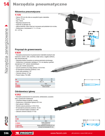 14 Narzędzia pneumatyczne Nitownica pneumatyczna Narzędzia zenergizowane Y.135 • Zakres: d 5 mm dla nitów ze wszystkich typów materiałów. • Posuw: 17 mm. • Moc 1100 N. • Regulacja zasysania nitu. • Pojemnik na pęknięte nity. • Złącze obrotowe, które może być mocowane pod pistoletem lub na boku. • Dostarczana z końcówkami 2 - 3 - 4 i 5 mm. D : 2,47 kg. Przyrząd do grawerowania V.820 • Narzędzie przeznaczone do grawerowania materiałów twardych (stal hartowana, kamień, szkło, ceramika), dzięki ostrzu z węglika wolframu, 600 uderzeń/sekundę. • Regulacja dopływu powietrza za pomocą pierścienia obrotowego. • Dostarczany z przewodem zasilającym 1,5 m ze złączką z gwintem zewnętrznym 1/4" i ostrzem standardowym. • Ilość cykli: 36 000 uderzeń/min. • Zużycie powietrza przy biegu jałowym: 0,03 mZ/min. • d wewnętrzna przewodu powietrza: 5 mm. • Gwint wlotu powietrza: 1/4". • Ciśnienie robocze: 5-7 bar. • Poziom hałasu: 78,4 dBA. axb mm 160 x 17 F V.820 D g 360 Opis Ostrze standardowe Ostrze cienkie F V.820A1 V.820A2 Odrdzewiacz igłowy V.352 • Narzędzie przeznaczone do czyszczenia, odrdzewiania, usuwania farby z powierzchni metalowych. • Umożliwia dostęp do pęknięć, szczelin. • Dostarczany z końcówkami igłowymi d 2 mm. • Ilość uderzeń: 4200/min. • Średnie zużycie powietrza: 0,135 mZ/min. • d wewnętrzna przewodu powietrza: 10 mm. • Gwint końcówki dopływu powietrza: 3/8". • Zalecane ciśnienie robocze: 5-7 bar. F V.352 F V.352A1 V.352A1D3 V.352-137D3 596 a mm 360 b mm 36 c mm 75 D kg 1,53 Opis Zestaw zapasowych końcówek d 2 mm Zestaw zapasowych końcówek d 3 mm Uchwyt do końcówek d 3 mm www.facom.com plik pobrano z www.imbth.com.pl