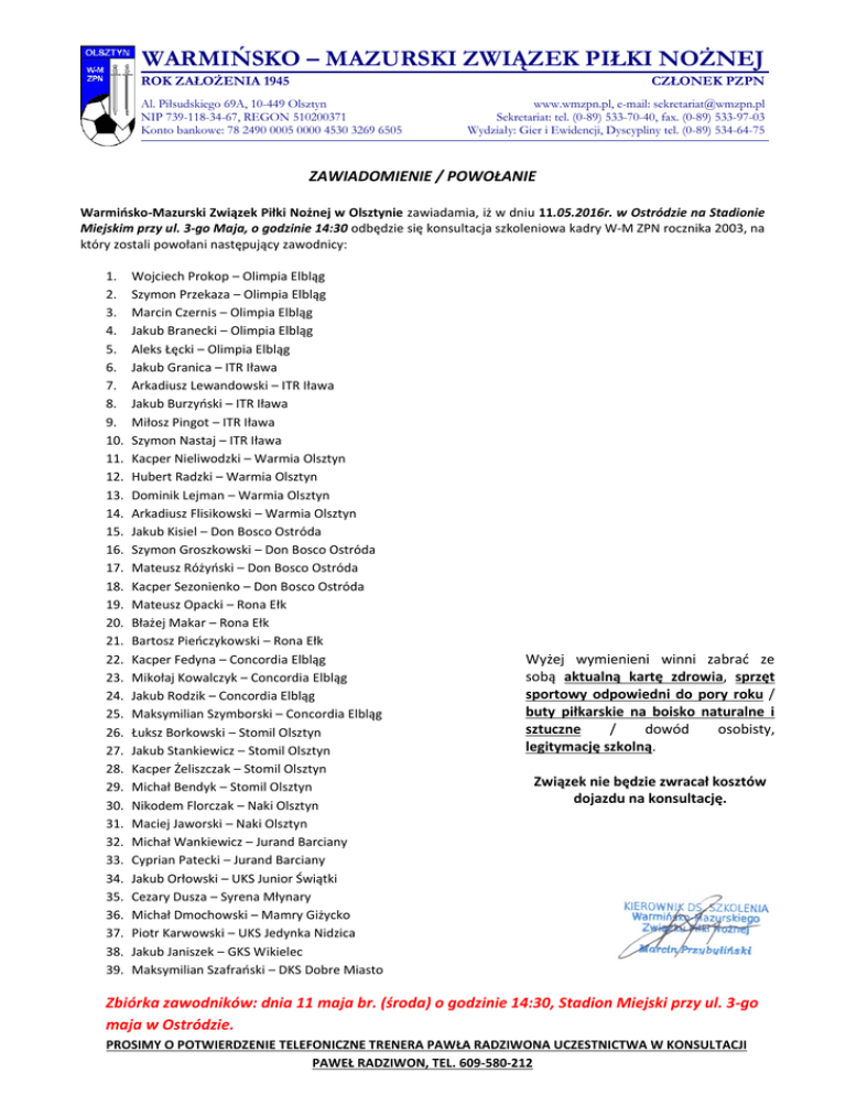 WARMIŃSKO – MAZURSKI ZWIĄZEK PIŁKI NOŻNEJ ROK ZAŁOŻENIA 1945 CZŁONEK PZPN Al. Piłsudskiego 69A, 10-449 Olsztyn NIP 739-118-34-67, REGON 510200371 Konto bankowe: 78 2490 0005 0000 4530 3269 6505 www.wmzpn.pl, e-mail: [email protected] Sekretariat: tel. (0-89) 533-70-40, fax. (0-89) 533-97-03 Wydziały: Gier i Ewidencji, Dyscypliny tel. (0-89) 534-64-75 ZAWIADOMIENIE / POWOŁANIE Warmińsko-Mazurski Związek Piłki Nożnej w Olsztynie zawiadamia, iż w dniu 11.05.2016r. w Ostródzie na Stadionie Miejskim przy ul. 3-go Maja, o godzinie 14:30 odbędzie się konsultacja szkoleniowa kadry W-M ZPN rocznika 2003, na który zostali powołani następujący zawodnicy: 1. 2. 3. 4. 5. 6. 7. 8. 9. 10. 11. 12. 13. 14. 15. 16. 17. 18. 19. 20. 21. 22. 23. 24. 25. 26. 27. 28. 29. 30. 31. 32. 33. 34. 35. 36. 37. 38. 39. Wojciech Prokop – Olimpia Elbląg Szymon Przekaza – Olimpia Elbląg Marcin Czernis – Olimpia Elbląg Jakub Branecki – Olimpia Elbląg Aleks Łęcki – Olimpia Elbląg Jakub Granica – ITR Iława Arkadiusz Lewandowski – ITR Iława Jakub Burzyński – ITR Iława Miłosz Pingot – ITR Iława Szymon Nastaj – ITR Iława Kacper Nieliwodzki – Warmia Olsztyn Hubert Radzki – Warmia Olsztyn Dominik Lejman – Warmia Olsztyn Arkadiusz Flisikowski – Warmia Olsztyn Jakub Kisiel – Don Bosco Ostróda Szymon Groszkowski – Don Bosco Ostróda Mateusz Różyński – Don Bosco Ostróda Kacper Sezonienko – Don Bosco Ostróda Mateusz Opacki – Rona Ełk Błażej Makar – Rona Ełk Bartosz Pieńczykowski – Rona Ełk Kacper Fedyna – Concordia Elbląg Mikołaj Kowalczyk – Concordia Elbląg Jakub Rodzik – Concordia Elbląg Maksymilian Szymborski – Concordia Elbląg Łuksz Borkowski – Stomil Olsztyn Jakub Stankiewicz – Stomil Olsztyn Kacper Żeliszczak – Stomil Olsztyn Michał Bendyk – Stomil Olsztyn Nikodem Florczak – Naki Olsztyn Maciej Jaworski – Naki Olsztyn Michał Wankiewicz – Jurand Barciany Cyprian Patecki – Jurand Barciany Jakub Orłowski – UKS Junior Świątki Cezary Dusza – Syrena Młynary Michał Dmochowski – Mamry Giżycko Piotr Karwowski – UKS Jedynka Nidzica Jakub Janiszek – GKS Wikielec Maksymilian Szafrański – DKS Dobre Miasto Wyżej wymienieni winni zabrać ze sobą aktualną kartę zdrowia, sprzęt sportowy odpowiedni do pory roku / buty piłkarskie na boisko naturalne i sztuczne / dowód osobisty, legitymację szkolną. Związek nie będzie zwracał kosztów dojazdu na konsultację. Zbiórka zawodników: dnia 11 maja br. (środa) o godzinie 14:30, Stadion Miejski przy ul. 3-go maja w Ostródzie. PROSIMY O POTWIERDZENIE TELEFONICZNE TRENERA PAWŁA RADZIWONA UCZESTNICTWA W KONSULTACJI PAWEŁ RADZIWON, TEL. 609-580-212