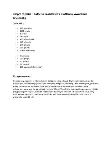 Ciepłe rogaliki i bułeczki drożdżowe z maślanką, owocami i kruszonką Składniki: 100 g drożdży 1000 g mąki 3 żółtka 1+1 jajko 400 ml maślanki 100 ml mleka 200 g masła 100 g cukru cukier wanilinowy Kruszonka: 100 g mąki 50 g cukru 50 g masła 150 g powideł śliwkowych Przygotowanie: Drożdże rozpuszczamy w mleku ciepłym, dodajemy łyżkę cukru, 2-3 łyżki mąki i odstawiamy do wyrośnięcia. Do wyrośniętego rozczynu dodajemy podgrzaną maślankę, ubite żółtka i jajko, pozostałą mąkę, rozpuszczone masło i szczyptę soli. Wszystko razem wyrabiamy na jednolite ciasto, odstawiamy ponownie do wyrośnięcia na około 30 min. Wyrośnięte ciasto dzielimy na porcje z każdej przygotowujemy rogaliki, bułeczki, nadziewamy dowolnymi owocami lub powidłami, smarujemy roztrzepanym jajkiem i posypujemy kruszonką. Wstawiamy do nagrzanego do temp. 180 st. C piekarnika na ok. 20 min.