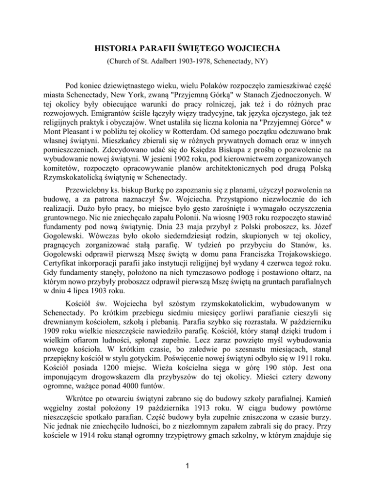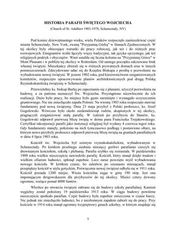 HISTORIA PARAFII ŚWIĘTEGO WOJCIECHA (Church of St. Adalbert 1903-1978, Schenectady, NY) Pod koniec dziewiętnastego wieku, wielu Polaków rozpoczęło zamieszkiwać część miasta Schenectady, New York, zwaną "Przyjemną Górką" w Stanach Zjednoczonych. W tej okolicy były obiecujące warunki do pracy rolniczej, jak też i do różnych prac rozwojowych. Emigrantów ściśle łączyły więzy tradycyjne, tak języka ojczystego, jak też religijnych praktyk i obyczajów. Wnet ustaliła się liczna kolonia na "Przyjemnej Górce" w Mont Pleasant i w pobliżu tej okolicy w Rotterdam. Od samego początku odczuwano brak własnej świątyni. Mieszkańcy zbierali się w różnych prywatnych domach oraz w innych pomieszczeniach. Zdecydowano udać się do Księdza Biskupa z prośbą o pozwolenie na wybudowanie nowej świątyni. W jesieni 1902 roku, pod kierownictwem zorganizowanych komitetów, rozpoczęto opracowywanie planów architektonicznych pod drugą Polską Rzymskokatolicką świątynię w Schenectady. Przewielebny ks. biskup Burkę po zapoznaniu się z planami, użyczył pozwolenia na budowę, a za patrona naznaczył Św. Wojciecha. Przystąpiono niezwłocznie do ich realizacji. Dużo było pracy, bo miejsce było gęsto zarośnięte i wymagało oczyszczenia gruntownego. Nic nie zniechęcało zapału Polonii. Na wiosnę 1903 roku rozpoczęto stawiać fundamenty pod nową świątynię. Dnia 23 maja przybył z Polski proboszcz, ks. Józef Gogolewski. Wówczas było około siedemdziesiąt rodzin, skupionych w tej okolicy, pragnących zorganizować stałą parafię. W tydzień po przybyciu do Stanów, ks. Gogolewski odprawił pierwszą Mszę świętą w domu pana Franciszka Trojakowskiego. Certyfikat inkorporacji parafii jako instytucji religijnej był wydany 4 czerwca tegoż roku. Gdy fundamenty stanęły, położono na nich tymczasowo podłogę i postawiono ołtarz, na którym nowo przybyły proboszcz odprawił pierwszą Mszę świętą na gruntach parafialnych w dniu 4 lipca 1903 roku. Kościół św. Wojciecha był szóstym rzymskokatolickim, wybudowanym w Schenectady. Po krótkim przebiegu siedmiu miesięcy gorliwi parafianie cieszyli się drewnianym kościołem, szkołą i plebanią. Parafia szybko się rozrastała. W październiku 1909 roku wielkie nieszczęście nawiedziło parafię. Kościół, który stanął dzięki trudom i wielkim ofiarom ludności, spłonął zupełnie. Lecz zaraz powzięto myśl wybudowania nowego kościoła. W krótkim czasie, bo zaledwie po szesnastu miesiącach, stanął przepiękny kościół w stylu gotyckim. Poświęcenie nowej świątyni odbyło się w 1911 roku. Kościół posiada 1200 miejsc. Wieża kościelna sięga w górę 190 stóp. Jest ona imponującym drogowskazem dla przybyszów do tej okolicy. Mieści cztery dzwony ogromne, ważące ponad 4000 funtów. Wkrótce po otwarciu świątyni zabrano się do budowy szkoły parafialnej. Kamień węgielny został położony 19 października 1913 roku. W ciągu budowy powtórne nieszczęście spotkało parafian. Część budowy była zupełnie zniszczona w czasie burzy. Nic jednak nie zniechęciło ludności, bo z niezłomnym zapałem zabrali się do pracy. Przy kościele w 1914 roku stanął ogromny trzypiętrowy gmach szkolny, w którym znajduje się 1 sala mieszcząca 1000 miejsc, oraz piękne klasy szkolne. Zaznaczyć tu warto, że wszystkie te wysiłki zrealizowano tylko z ofiarności i hojności parafian. Nie było bowiem wówczas żadnej zapomogi rządowej, żadnej asekuracji, żadnych zapewnień gwarantujących dochodów. Natomiast tylko odwaga, szlachetność i ofiarność parafian pobudzała do czynu. Z ukończeniem budynku szkolnego wybrano kolegium, prowadzone przez kierownictwo świeckie. Było to pierwsze takie przedsięwzięcie w tej części stanu. W program kursów włączono nie tylko nauczanie języka angielskiego, ale wymagano studium języków polskiego, francuskiego, niemieckiego, greckiego i łaciny. W 1917 roku kłopoty finansowe zmusiły do zlikwidowania kolegium. Natomiast prowadzono ośmioklasową szkołę elementarną. Do nauczania zaangażowano Siostry Zmartwychwstanki, które po dziś dzień prowadzą kształcenie młodzieży. Z objęciem regularnej pracy szkolnej, trzeba było zastosować się do wymagań rządowych, bo studenci już w ósmym przedziale byli zobowiązani zdawać egzaminy stanowe, tak zwane New York State Regents. Do dziś dnia Siostry pierwszorzędnie prowadzą tę szkołę. Wynagradzającym skutkiem mozolnej pracy nad młodzieżą są chlubne stanowiska wychowanków, którzy obecnie zajmują naczelne miejsca w wyższych szkołach, w polityce, w życiu religijnym a też wielu z nich piastuje naczelne stanowiska lekarzy, mecenasów, inżynierów i różnych specjalistów w przemyśle, handlu i rolnictwie. Do rozwoju parafii wielce przyczyniły się organizacje powstające w ciągu 75 lat. Do tych należy Tow. św. Piotra i Pawła, Tow. św. Trójcy, Niewiast Różańcowych i chór parafialny. Wielu fundatorów z pierwszych towarzystw mozolnie pracowało nad rozwojem tutejszej parafii. Jako pamiątkę pierwszej misji odprawionej w tutejszym kościele, Tow. św. Trójcy ofiarowało Krzyż Misyjny, który był pomnikiem pamiątkowym przez szereg lat. Przez tysiąc lat Polacy pokładali nadzieję i staranie o zachowanie muzyki i śpiewu kościelnego. Znana pieśń " W żłobie leży, któż pobieży" przetrwała około pięćset lat. Liczne prześliczne, bogate pieśni przetrwały szereg lat i tu w parafii utrwalają w wierze i pobudzają ludność do pobożności, do serdecznego wyrażenia uczuć narodowych i religijnych. Nic dziwnego, że chóry obecnie przywiązują wielką wagę do dawnych pieśni i zwyczajów. Śpiewy kościelne w języku polskim, angielskim i łacińskim zachowały się wśród naszej Polonii od dawien dawna i trwają ponad 30 lat — aż po dzień dzisiejszy. Dla upiększenia nabożeństw zakupiono już w roku 1918 piękne organy do uż