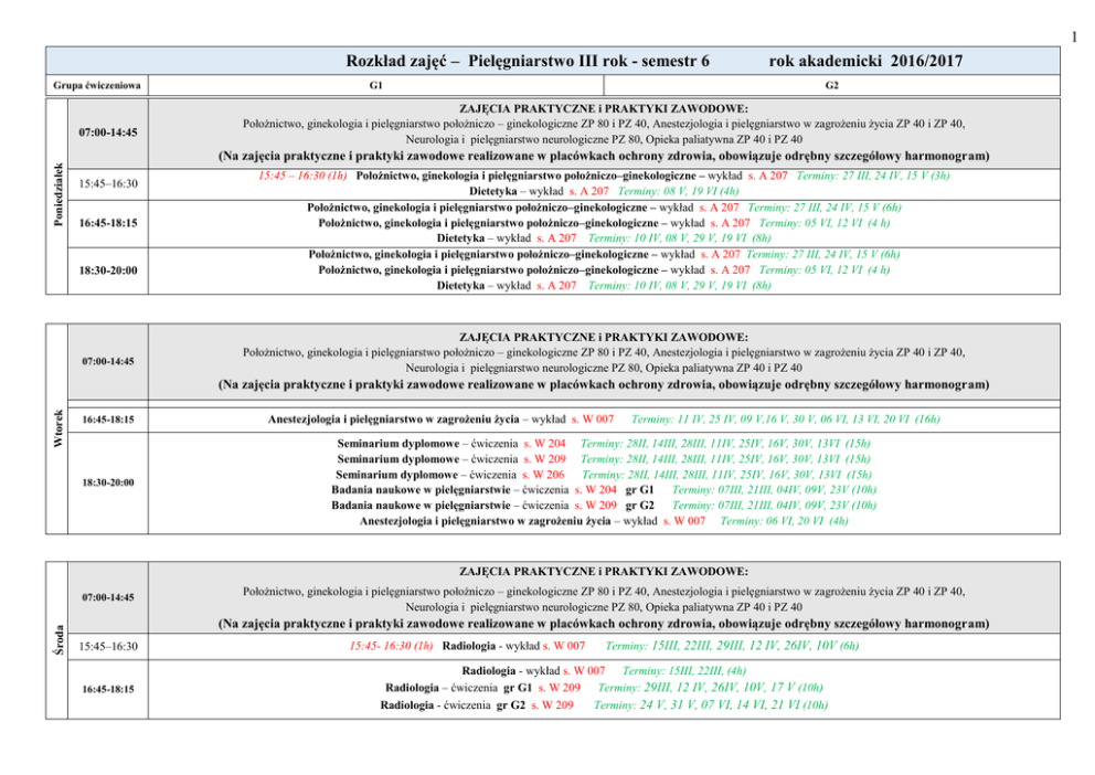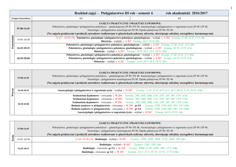 1 Rozkład zajęć – Pielęgniarstwo III rok - semestr 6 Grupa ćwiczeniowa Poniedziałek 07:00-14:45 G1 rok akademicki 2016/2017 G2 ZAJĘCIA PRAKTYCZNE i PRAKTYKI ZAWODOWE: Położnictwo, ginekologia i pielęgniarstwo położniczo – ginekologiczne ZP 80 i PZ 40, Anestezjologia i pielęgniarstwo w zagrożeniu życia ZP 40 i ZP 40, Neurologia i pielęgniarstwo neurologiczne PZ 80, Opieka paliatywna ZP 40 i PZ 40 (Na zajęcia praktyczne i praktyki zawodowe realizowane w placówkach ochrony zdrowia, obowiązuje odrębny szczegółowy harmonogram) 15:45–16:30 16:45-18:15 18:30-20:00 07:00-14:45 15:45 – 16:30 (1h) Położnictwo, ginekologia i pielęgniarstwo położniczo–ginekologiczne – wykład s. A 207 Terminy: 27 III, 24 IV, 15 V (3h) Dietetyka – wykład s. A 207 Terminy: 08 V, 19 VI (4h) Położnictwo, ginekologia i pielęgniarstwo położniczo–ginekologiczne – wykład s. A 207 Terminy: 27 III, 24 IV, 15 V (6h) Położnictwo, ginekologia i pielęgniarstwo położniczo–ginekologiczne – wykład s. A 207 Terminy: 05 VI, 12 VI (4 h) Dietetyka – wykład s. A 207 Terminy: 10 IV, 08 V, 29 V, 19 VI (8h) Położnictwo, ginekologia i pielęgniarstwo położniczo–ginekologiczne – wykład s. A 207 Terminy: 27 III, 24 IV, 15 V (6h) Położnictwo, ginekologia i pielęgniarstwo położniczo–ginekologiczne – wykład s. A 207 Terminy: 05 VI, 12 VI (4 h) Dietetyka – wykład s. A 207 Terminy: 10 IV, 08 V, 29 V, 19 VI (8h) ZAJĘCIA PRAKTYCZNE i PRAKTYKI ZAWODOWE: Położnictwo, ginekologia i pielęgniarstwo położniczo – ginekologiczne ZP 80 i PZ 40, Anestezjologia i pielęgniarstwo w zagrożeniu życia ZP 40 i ZP 40, Neurologia i pielęgniarstwo neurologiczne PZ 80, Opieka paliatywna ZP 40 i PZ 40 Wtorek (Na zajęcia praktyczne i praktyki zawodowe realizowane w placówkach ochrony zdrowia, obowiązuje odrębny szczegółowy harmonogram) 16:45-18:15 18:30-20:00 Anestezjologia i pielęgniarstwo w zagrożeniu życia – wykład s. W 007 Terminy: 11 IV, 25 IV, 09 V,16 V, 30 V, 06 VI, 13 VI, 20 VI (16h) Seminarium dyplomowe – ćwiczenia s. W 204 Terminy: 28II, 14III, 28III, 11IV, 25IV, 16V, 30V, 13VI (15h) Seminarium dyplomowe – ćwiczenia s. W 209 Terminy: 28II, 14III, 28III, 11IV, 25IV, 16V, 30V, 13VI (15h) Seminarium dyplomowe – ćwiczenia s. W 206 Terminy: 28II, 14III, 28III, 11IV, 25IV, 16V, 30V, 13VI (15h) Badania naukowe w pielęgniarstwie – ćwiczenia s. W 204 gr G1 Terminy: 07III, 21III, 04IV, 09V, 23V (10h) Badania naukowe w pielęgniarstwie – ćwiczenia s. W 209 gr G2 Terminy: 07III, 21III, 04IV, 09V, 23V (10h) Anestezjologia i pielęgniarstwo w zagrożeniu życia – wykład s. W 007 Terminy: 06 VI, 20 VI (4h) ZAJĘCIA PRAKTYCZNE i PRAKTYKI ZAWODOWE: Środa 07:00-14:45 Położnictwo, ginekologia i pielęgniarstwo położniczo – ginekologiczne ZP 80 i PZ 40, Anestezjologia i pielęgniarstwo w zagrożeniu życia ZP 40 i ZP 40, Neurologia i pielęgniarstwo neurologiczne PZ 80, Opieka paliatywna ZP 40 i PZ 40 (Na zajęcia praktyczne i praktyki zawodowe realizowane w placówkach ochrony zdrowia, obowiązuje odrębny szczegółowy harmonogram) 15:45–16:30 16:45-18:15 15:45- 16:30 (1h) Radiologia - wykład s. W 007 Terminy: 15III, 22III, 29III, 12 IV, 26IV, 10V (6h) Radiologia - wykład s. W 007 Terminy: 15III, 22III, (4h) Radiologia – ćwiczenia gr G1 s. W 209 Terminy: 29III, 12 IV, 26IV, 10V, 17 V (10h) Radiologia - ćwiczenia gr G2 s. W 209 Terminy: 24 V, 31 V, 07 VI, 14 VI, 21 VI (10h) 2 Rozkład zajęć – Pielęgniarstwo III rok - semestr 6 Grupa ćwiczeniowa 18:30-20:00 rok akademicki 2016/2017 G1 G2 Opieka paliatywna – wykład s. W 007 Terminy: 01III, 08III, 15III, 22III, 29III, 05IV, 12IV, 26IV, 10V, 17V, 24V, 31V, 07VI, 14VI, 21VI (30h) ZAJĘCIA PRAKTYCZNE i PRAKTYKI ZAWODOWE: Czwartek 07:00-14:45 Położnictwo, ginekologia i pielęgniarstwo położniczo – ginekologiczne ZP 80 i PZ 40, Anestezjologia i pielęgniarstwo w zagrożeniu życia ZP 40 i ZP 40, Neurologia i pielęgniarstwo neurologiczne PZ 80, Opieka paliatywna ZP 40 i PZ 40 (Na zajęcia praktyczne i praktyki zawodowe realizowane w placówkach ochrony zdrowia, obowiązuje odrębny szczegółowy harmonogram) Położnictwo, ginekologia i pielęgniarstwo położniczo–ginekologiczne – wykład s. C 001 16:45-18:15 Dietetyka – wykład s. C 001 dr inż. Małgorzata Stryjecka Położnictwo, ginekologia i pielęgniarstwo położniczo–ginekologiczne – wykład s. C 001 18:30-20:00 Terminy: 23 III, 30 III, 20 IV, 04 V, 11 V, 25 V, 01 VI, 08 VI (16h) Termin: 27 IV (2h) Terminy: 23 III, 30 III, 20 IV, 04 V, 11 V, 25 V, 01 VI, 08 VI (16h) Dietetyka – wykład s. C 001 dr inż. Małgorzata Stryjecka Termin: 27 IV (2h) ZAJĘCIA PRAKTYCZNE i PRAKTYKI ZAWODOWE: 07:00-14:45 Położnictwo, ginekologia i pielęgniarstwo położniczo – ginekologiczne ZP 80 i PZ 40, Anestezjologia i pielęgniarstwo w zagrożeniu życia ZP 40 i ZP 40, Neurologia i pielęgniarstwo neurologiczne PZ 80, Opieka paliatywna ZP 40 i PZ 40 Piątek (Na zajęcia praktyczne i praktyki zawodowe realizowane w placówkach ochrony zdrowia, obowiązuje odrębny szczegółowy harmonogram) 16:45-18:15 Anestezjologia i pielęgniarstwo w zagrożeniu życia – wykład s. W 007 Terminy: 24 II, 24 III, 31 III, 07 IV, 21 IV, 28 IV, 05 V, 12V, 26 V, 02 VI, 0 9VI (22h) Anestezjologia i pielęgniarstwo w zagrożeniu życia – wykład s. W 007 18:30-20:00 Oznaczenie budynków: C – ul. Pocztowa 54A bud. C, Terminy: 24 III, 31 III,05 V, 02VI (8h) Seminarium dyplomowe – ćwiczenia s. W 203 Terminy: 03III, 07IV, 21IV, 28IV, 12V, 19V, 26V, 09VI (15h) Seminarium dyplomowe – ćwiczenia s. W 206 Terminy: 03III, 07IV, 21IV, 28IV, 12V, 19V, 26V, 09VI (15h) Seminarium dyplomowe – ćwiczenia s. W 207 Terminy: 03III, 07IV, 21IV, 28IV, 12V, 19V, 26V, 09VI (15h) W – ul. Wojsławicka 8b, A– ul. Pocztowa 54A bud. Rektoratu, E – ul. Pocztowa 54 bud. E , F – ul. Pocztowa 54 bud. F , CSI – Depułtycze Królewskie 55